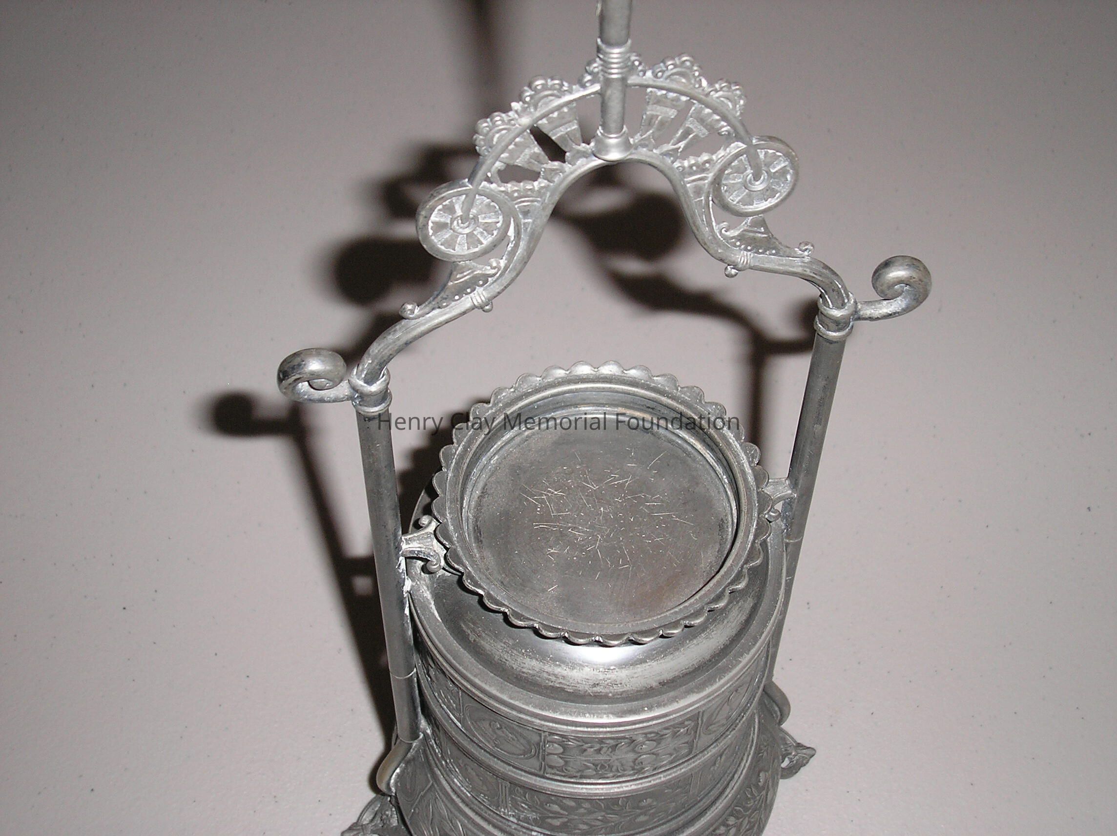 A sterling silver tobbaco box on a stand. The Box is cylindrical with two posts that form an arch over the top. It has two drawers with pulls that rotate out from the center. On top of the drawers is a small tray with lip. The piece is decorated with pictures of dogs including greyhounds, boxers, and setters. In between the dogs are floral decorations. The piece has four feet made up of crossed feathers in loops. At the top of the arch is a trumpet. Piece is stamped: "Reed and Barton Pat Mar __ 188 __."