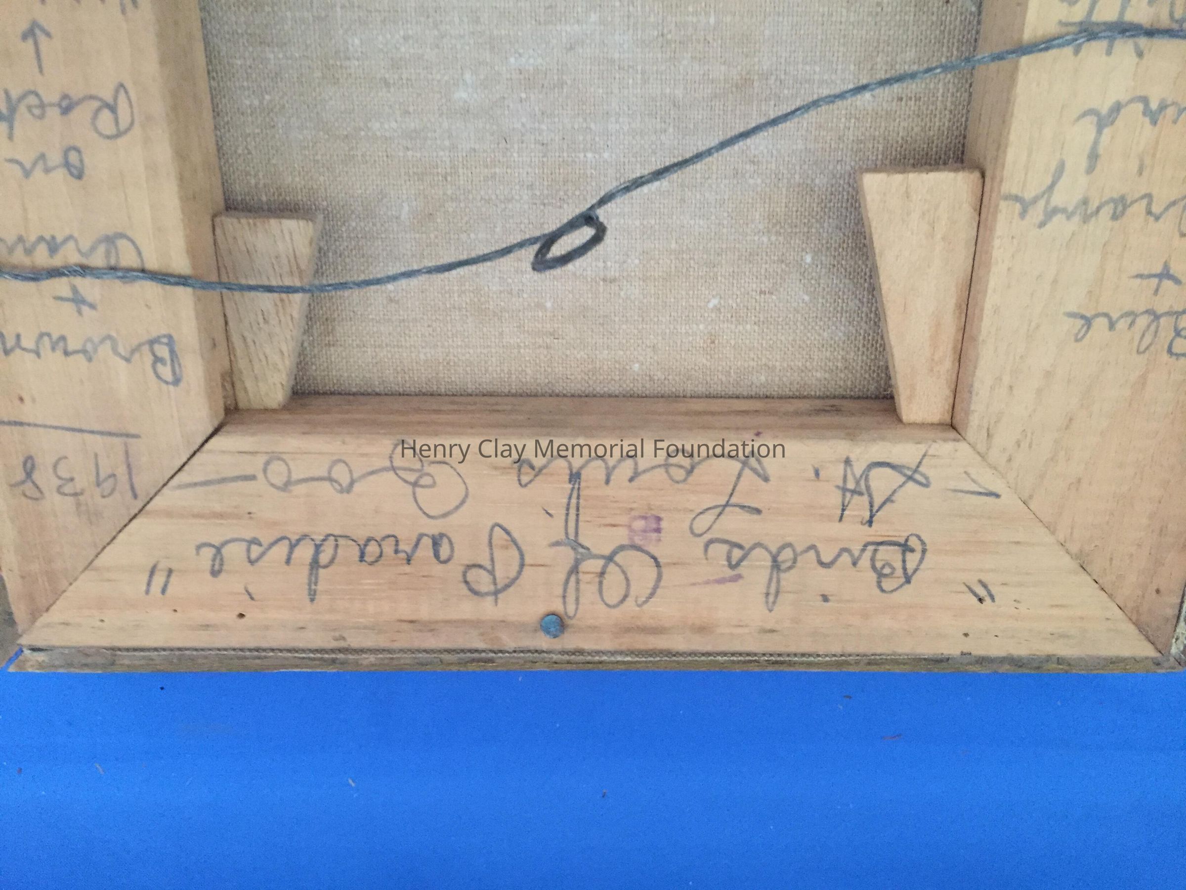 The painting is titled "Birds of Paradise' from the St. Louis Zoo." The notes on the back of the frame tell about the birds. There are very vibrant colors used in the painting such as yellows and reds in contrast to the dark greens of the forest. Painted by V. Schoenberg.