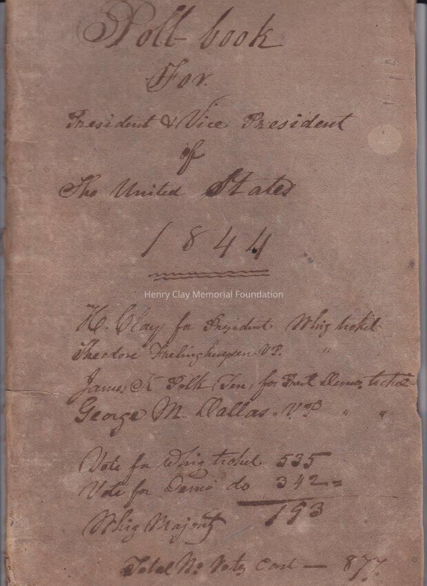 Poll book for the 1844 Presidential Election from Wayne County, KY. This book is bound in brown cardboard and inscribed with the election and vote count. Inside are folded pages bound in along the short edge. These pages contain a talk for votes from various precincts in Wayne County.