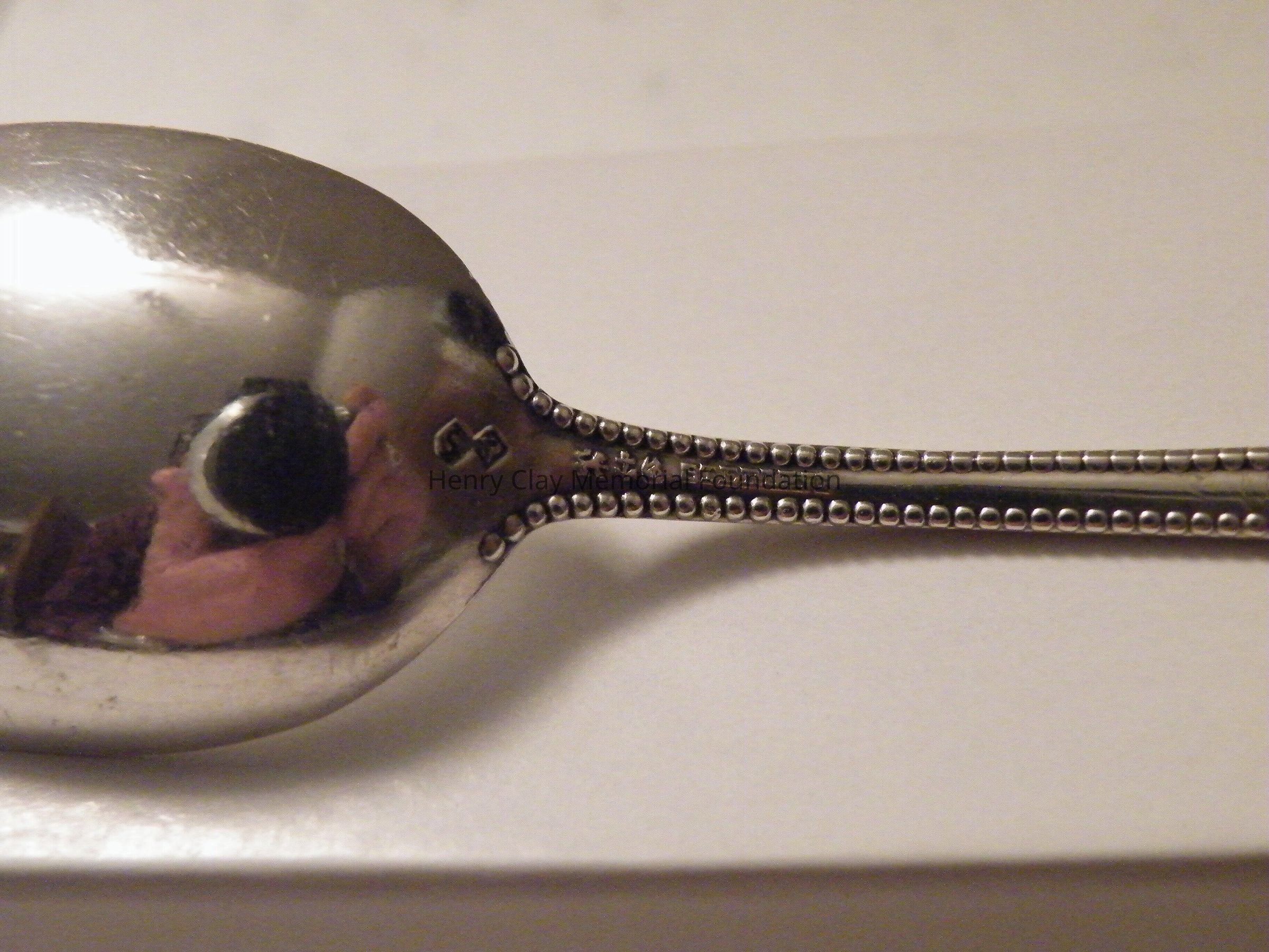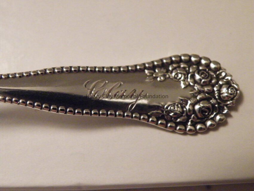 A sterling silver spoon engraved "Clay" on the handle.