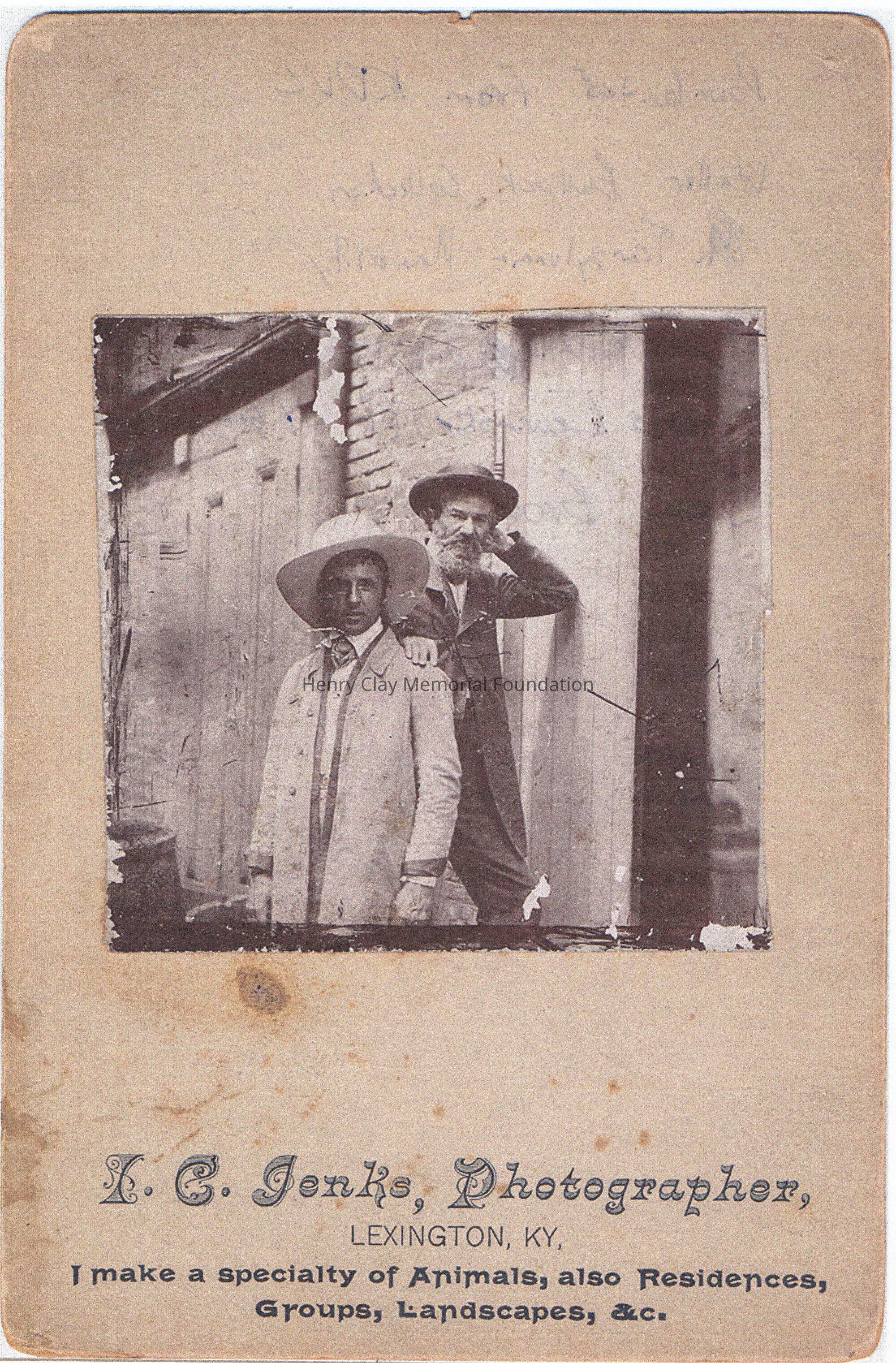 A print out of a photograph of two men standing in front of a building.