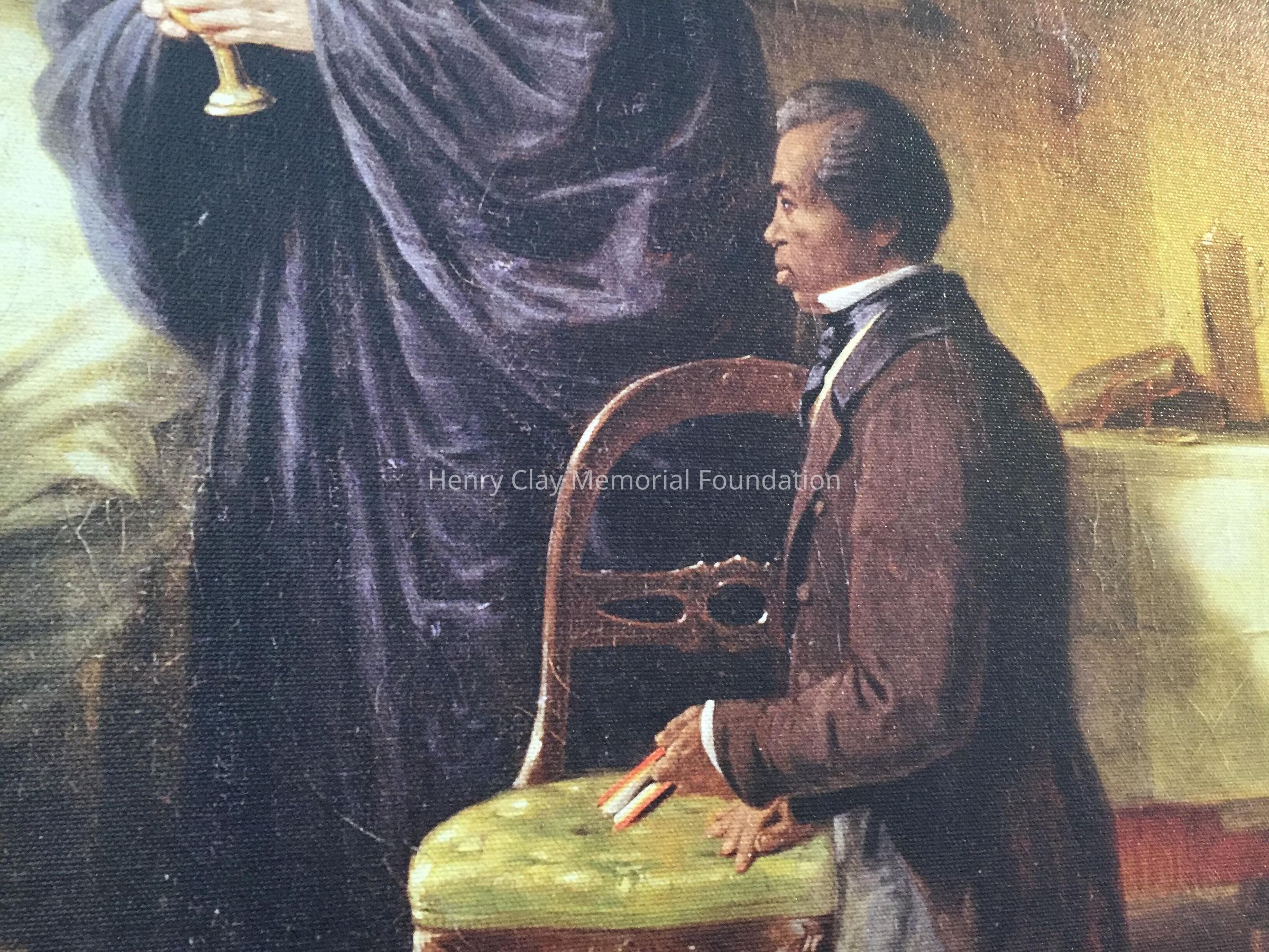 Giclee print reproduction of a painting of Henry Clay in bed being tended to by a priest with an African American man kneeling in the foreground.Dimensions