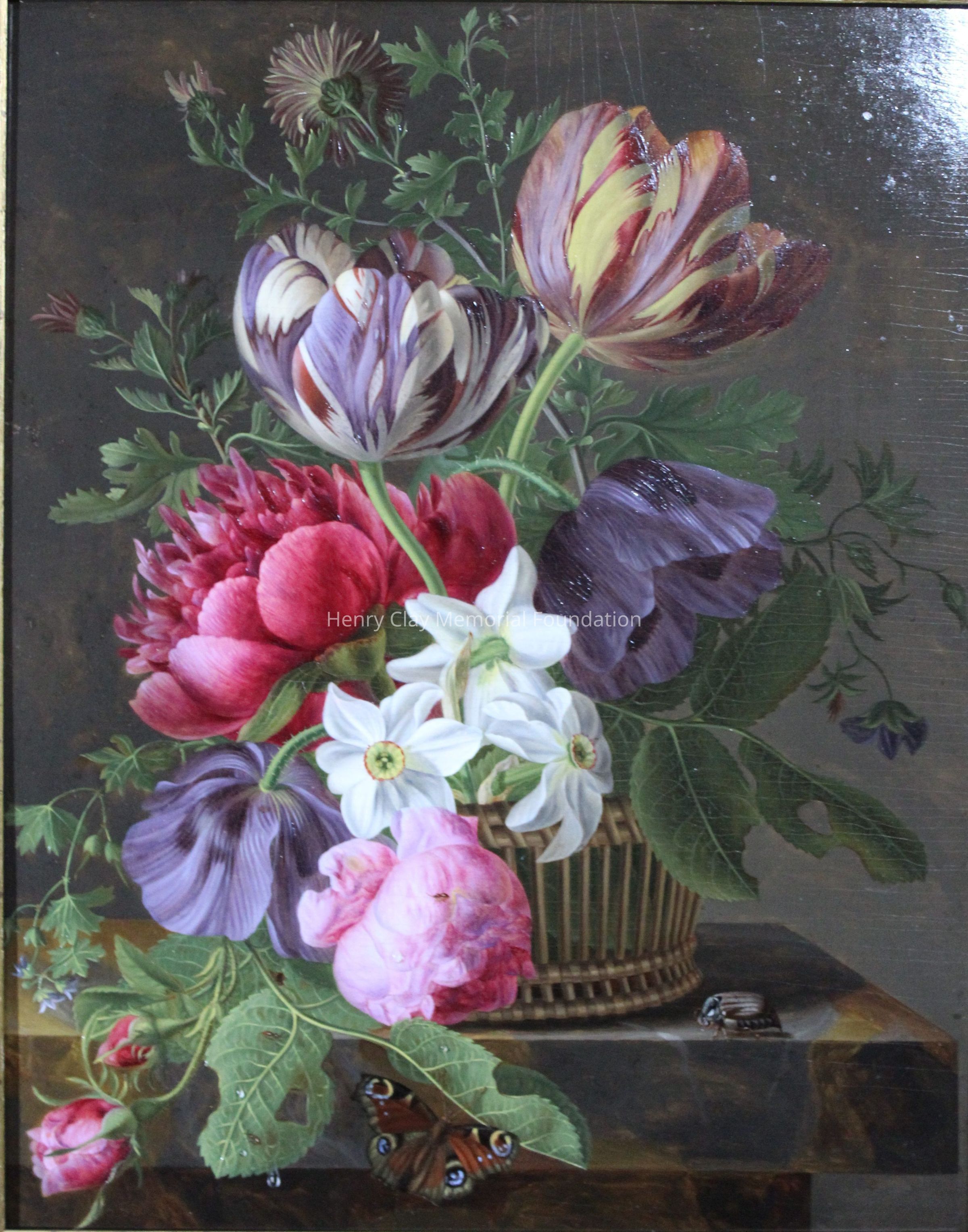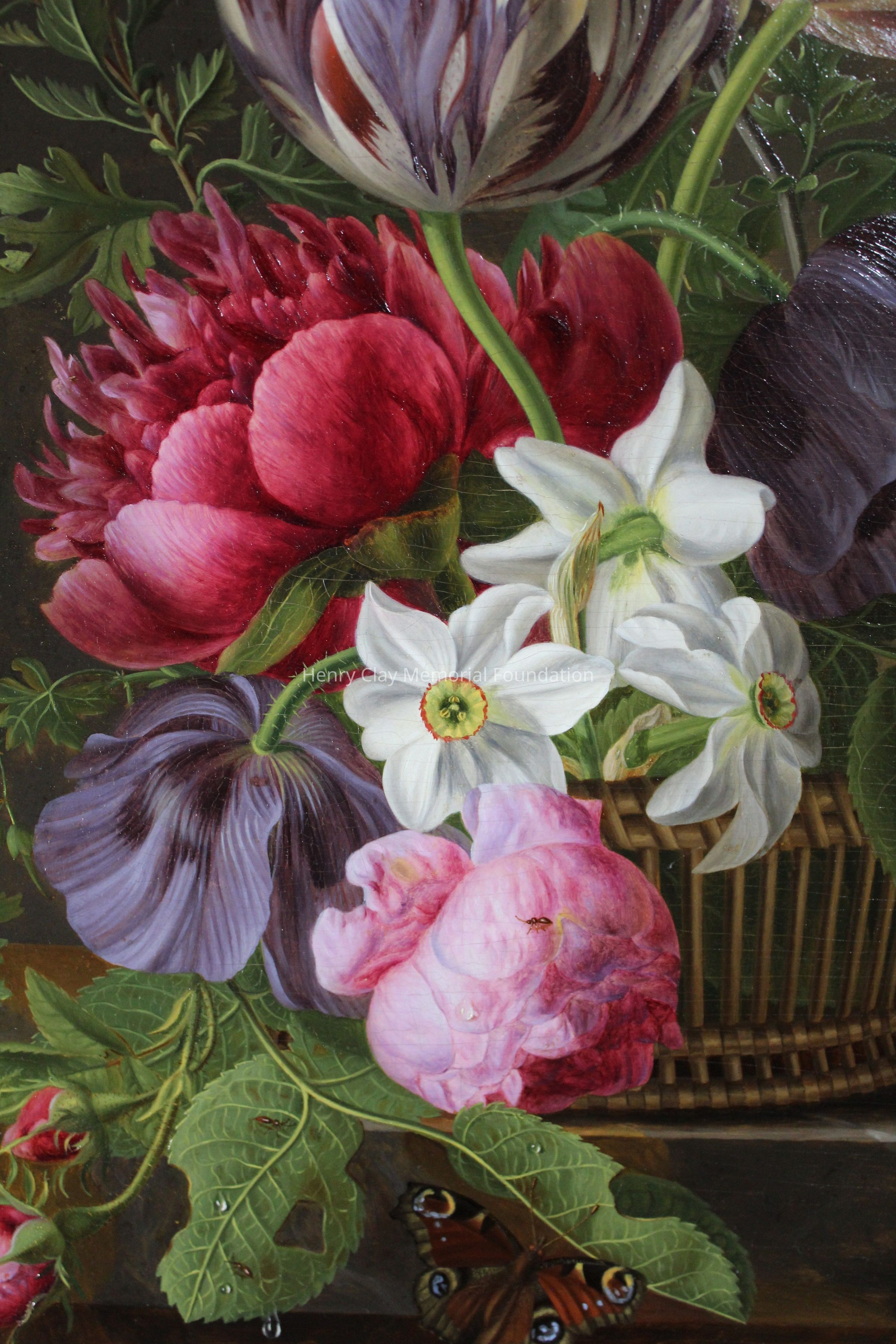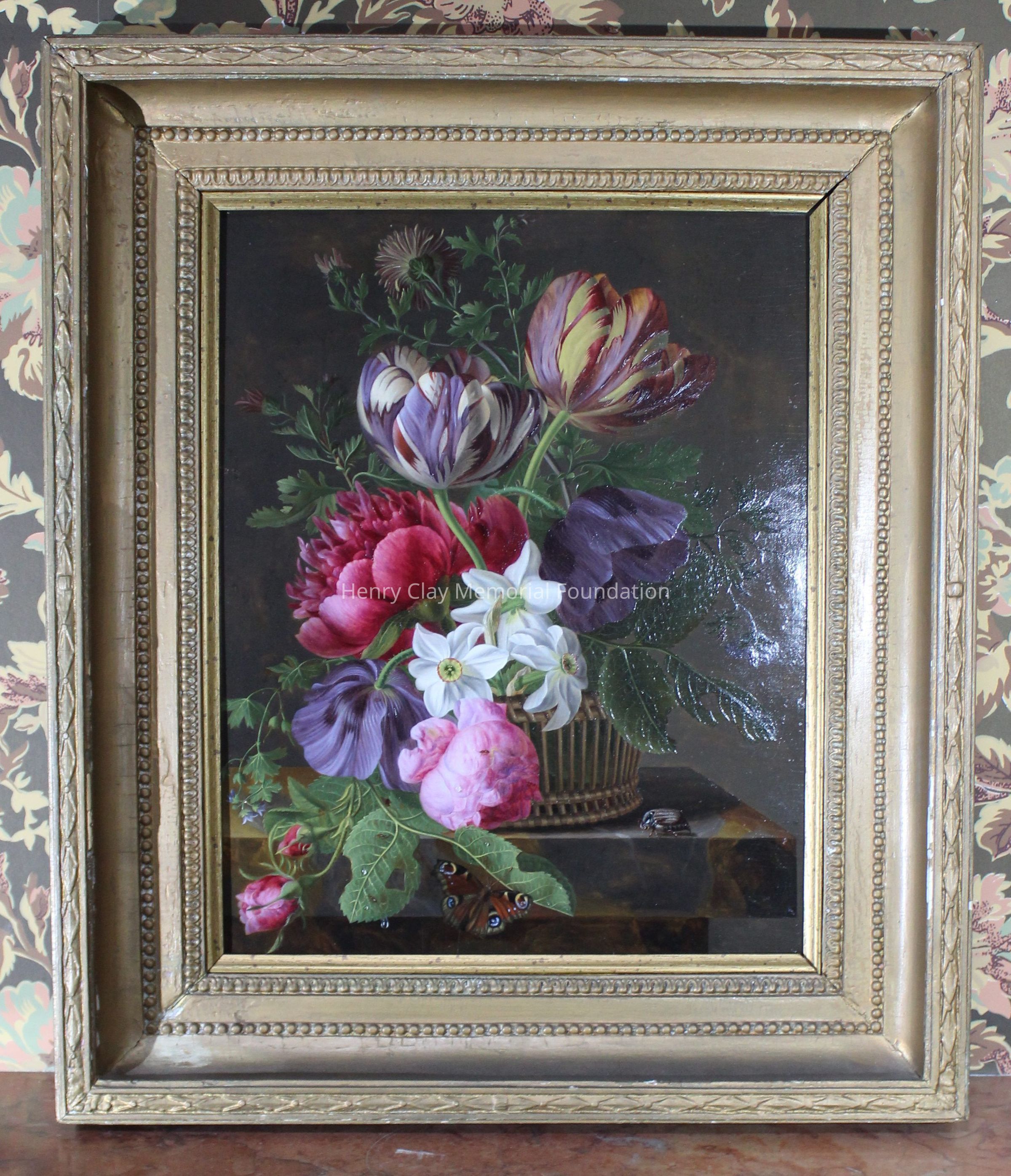 Floral still-life showing multi-colored flowers in a basket resting on a table, gray background, probably Flemish, early 19th century, oil on panel. Framed in decorative gild frame.Dimensions