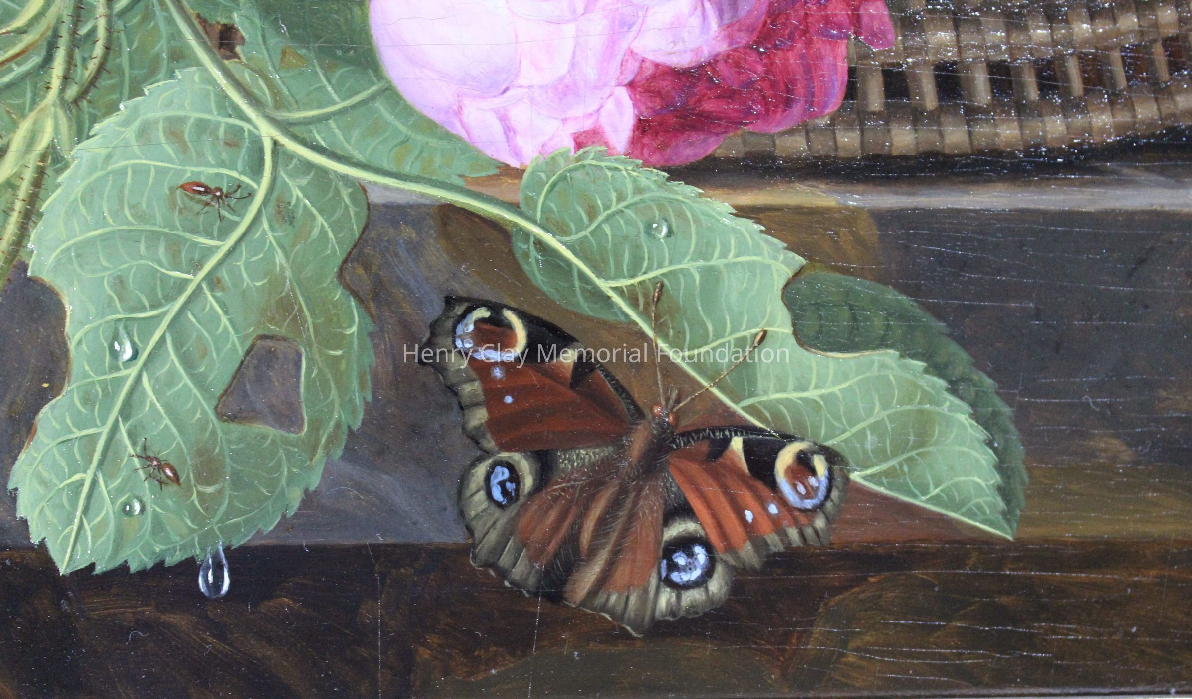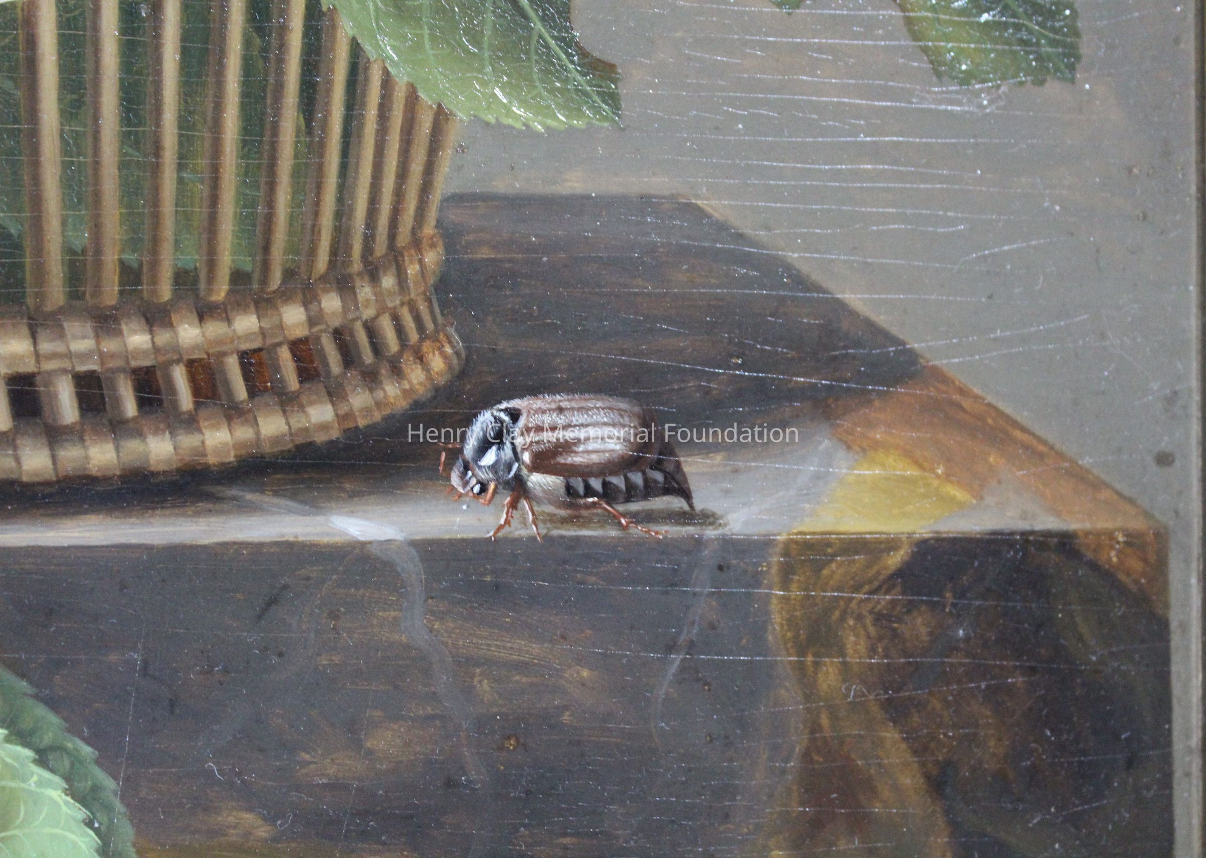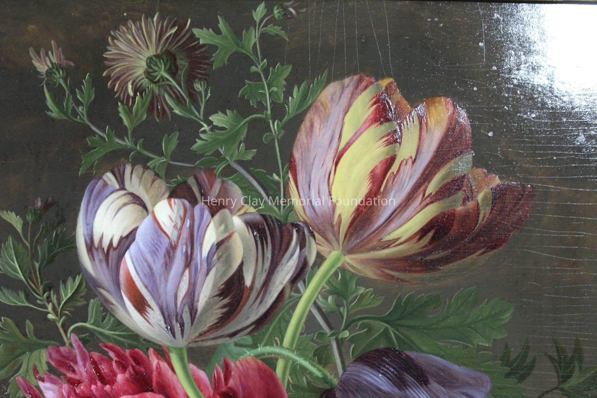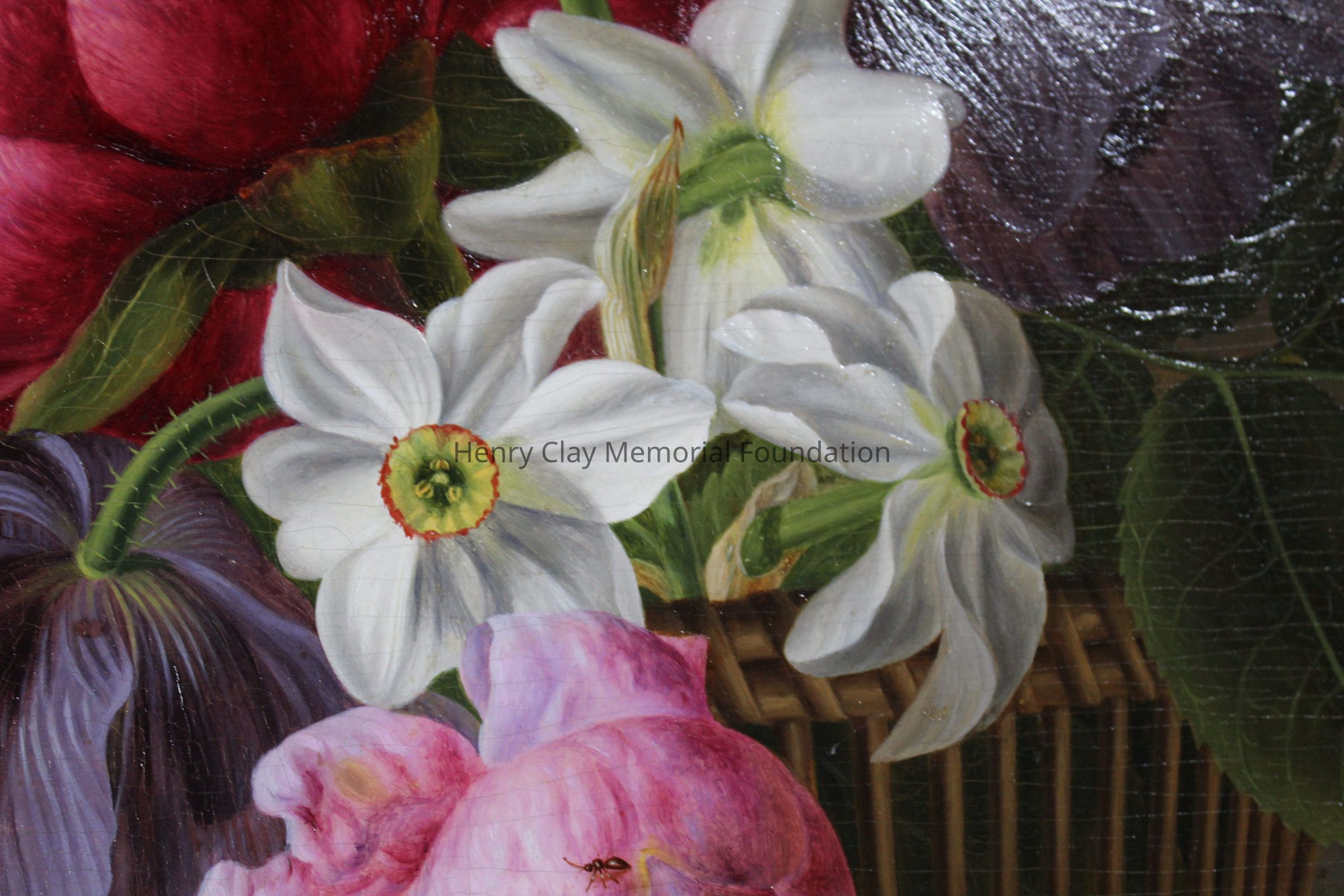 Floral still-life showing multi-colored flowers in a basket resting on a table, gray background, probably Flemish, early 19th century, oil on panel. Framed in decorative gild frame.Dimensions