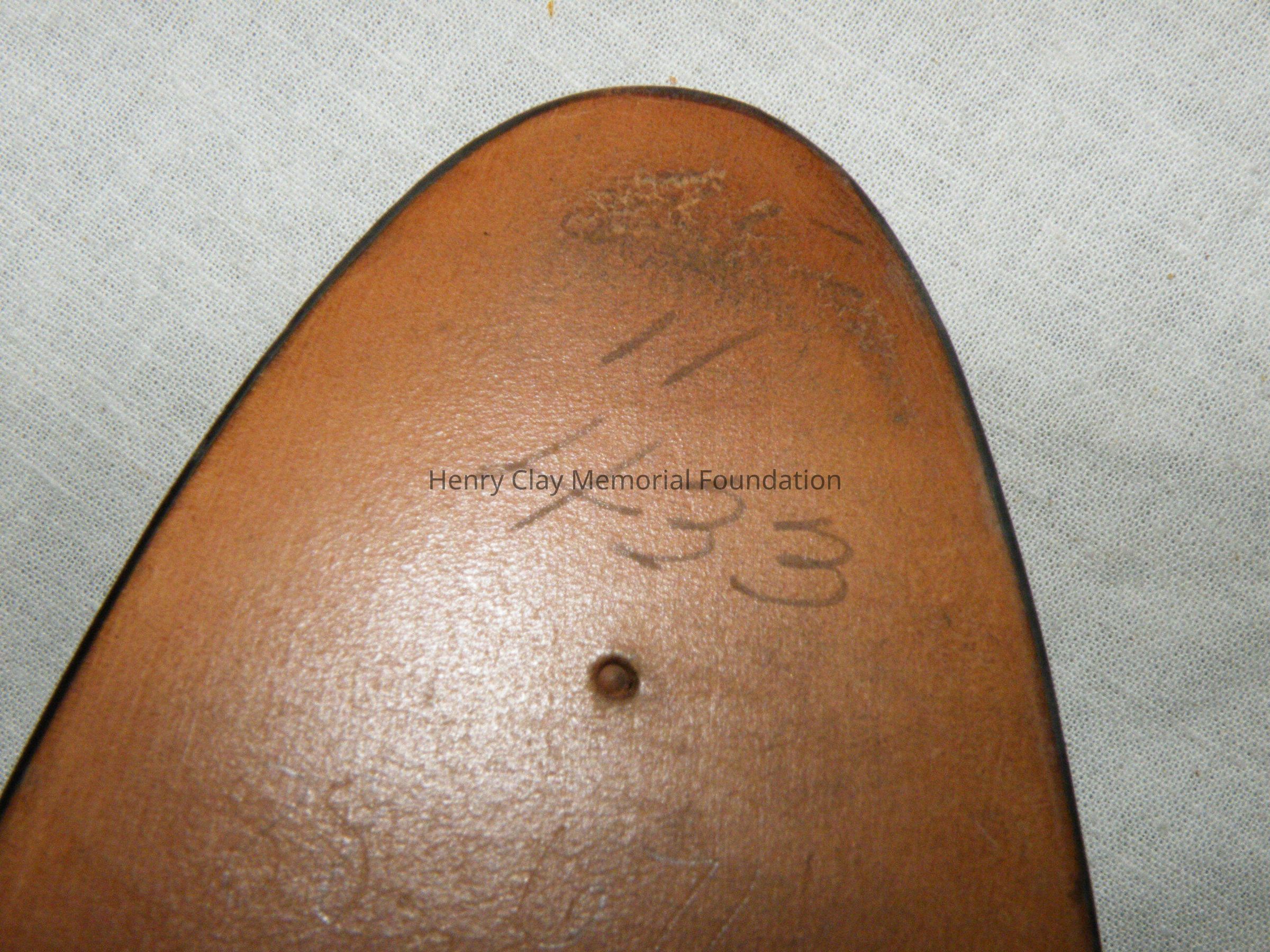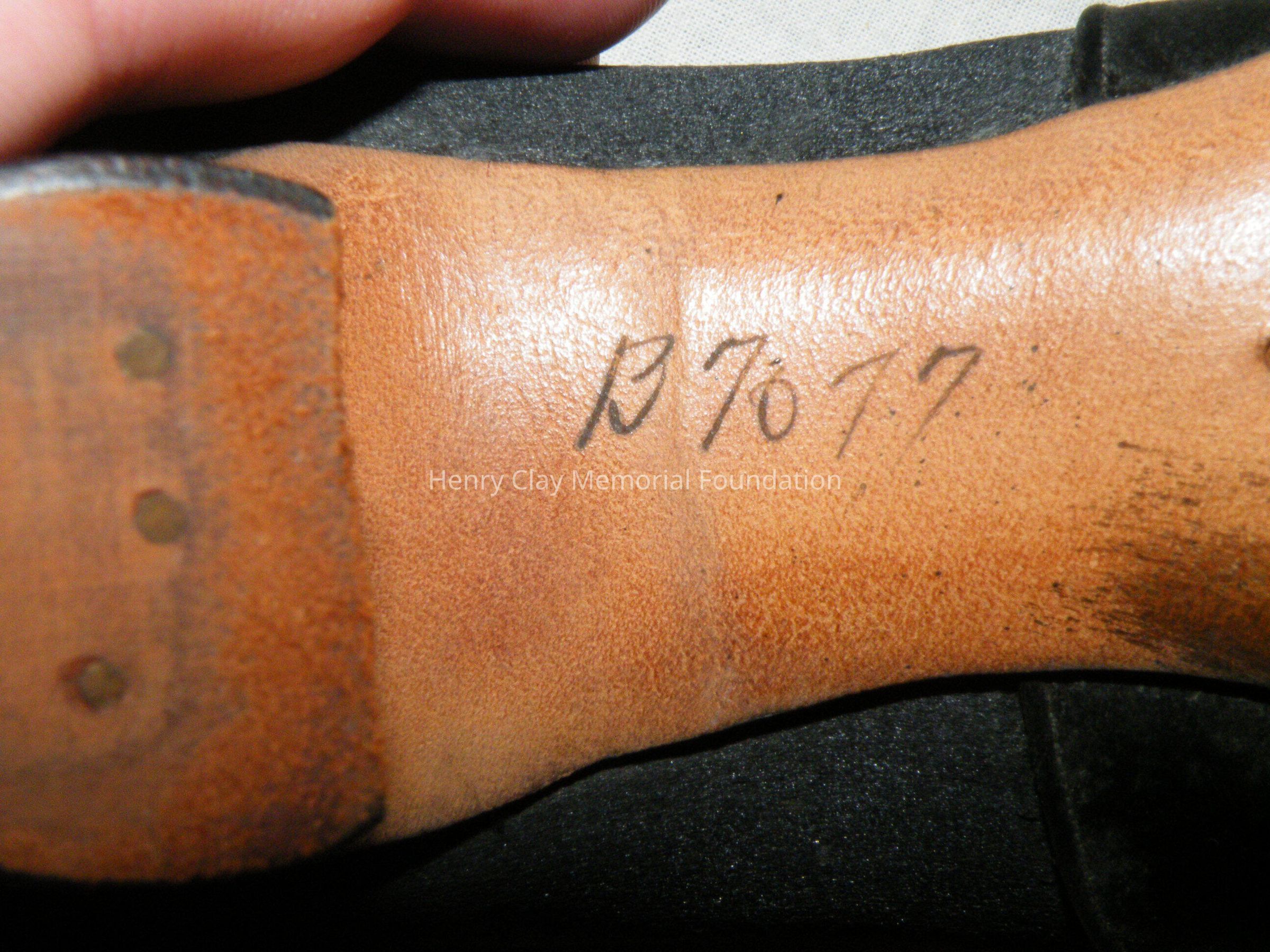 One pair of ladies black satin high heel shoes. Shoes have a rounded toe and tapering block heel. The tongue of the shoes is pointed. Inside of right shoe (A) is printed "S. Bassett and Sons Lexington" and on its sole the numbers B7077 (near the heel) and 35-11 433 (at the toe). At the center is the label "Frank Schobel and Co. Philadelphia." In the left (B) is the makers mark (Frank Schobel and Co.) which also appears on the sole along with several of the numbers found on the right.