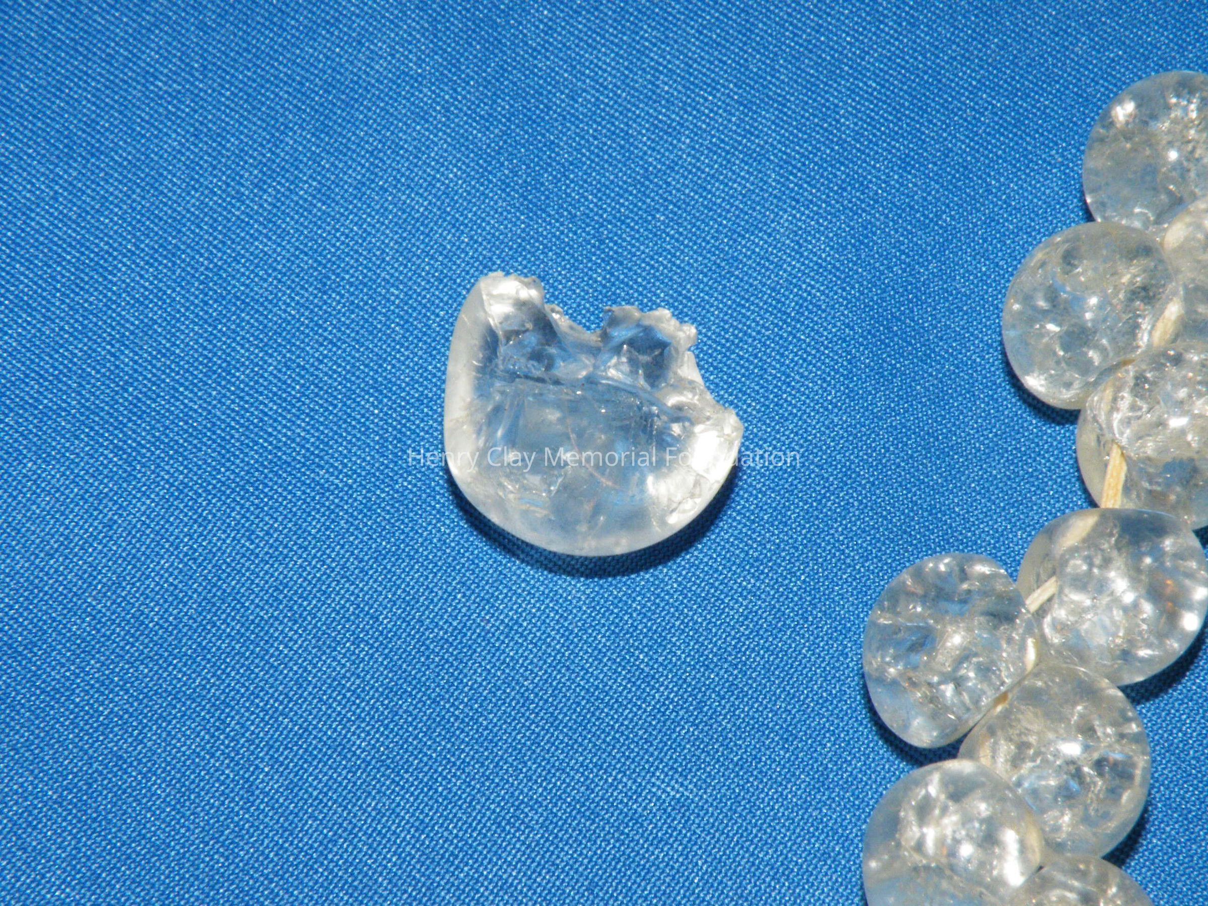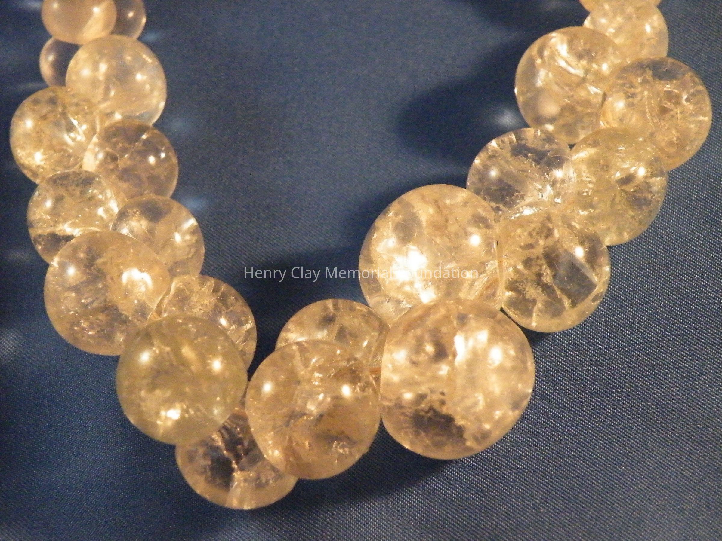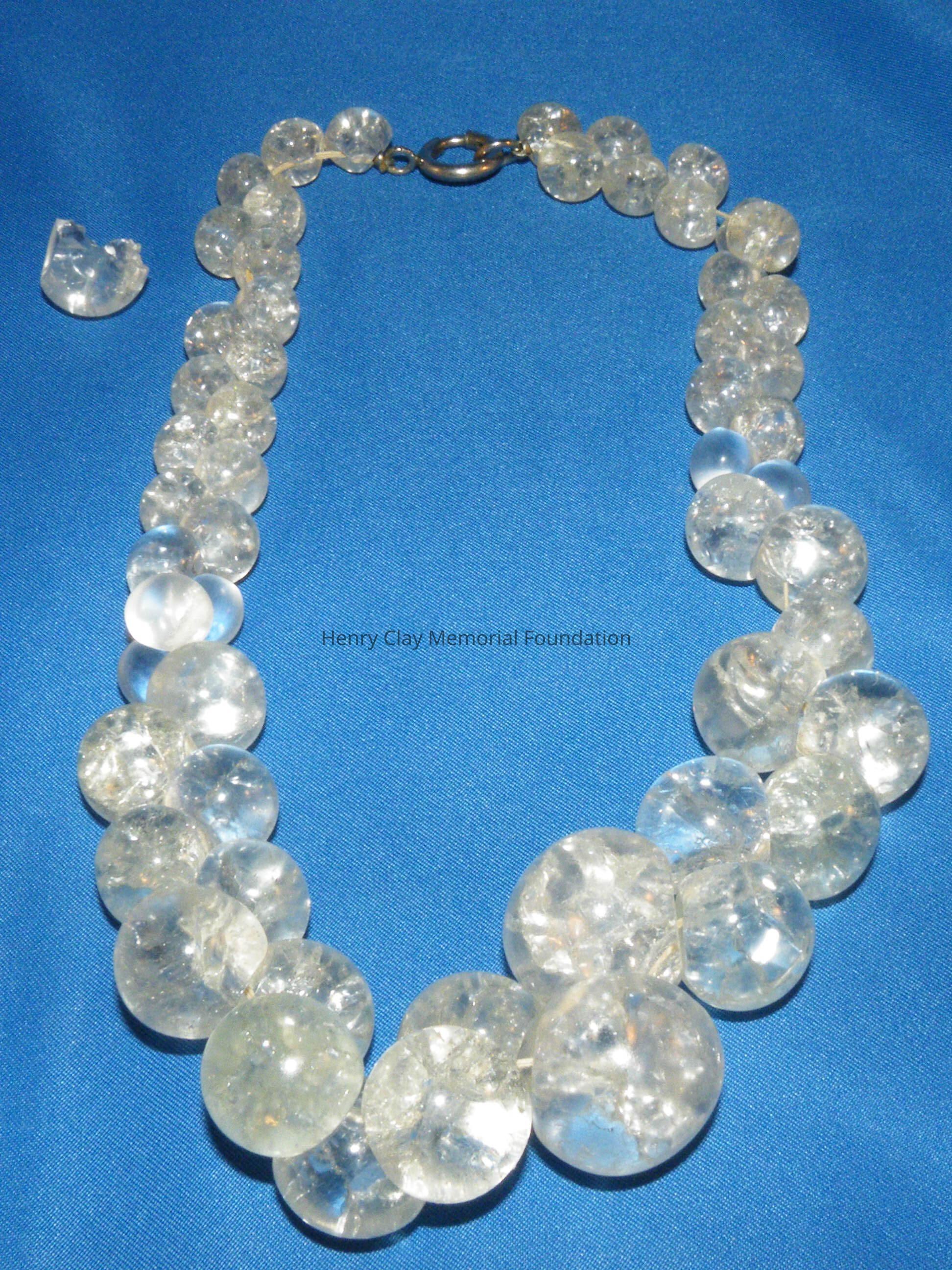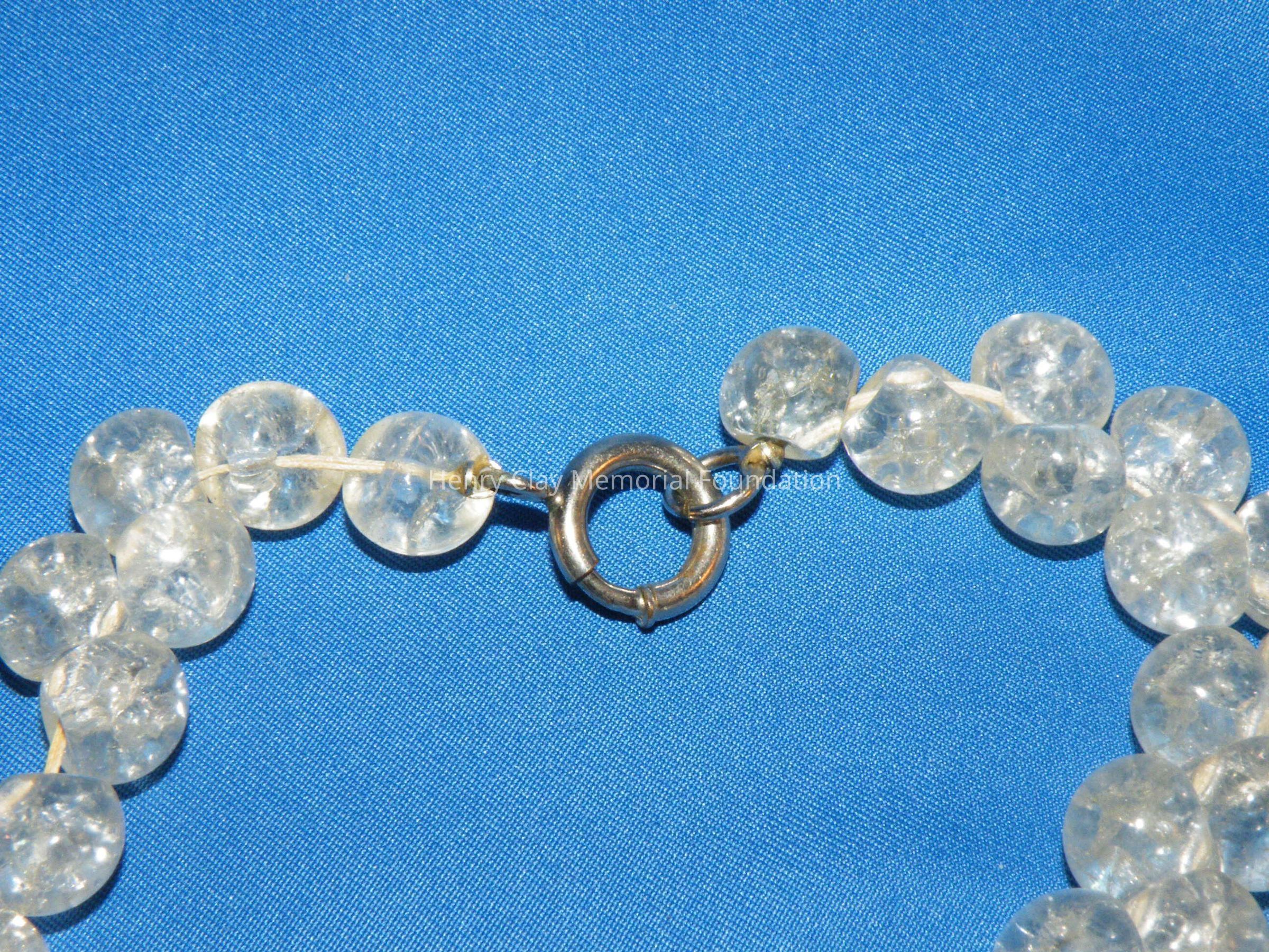 A necklace composed of large round rock crystal beads strung on string with a silver clasp.