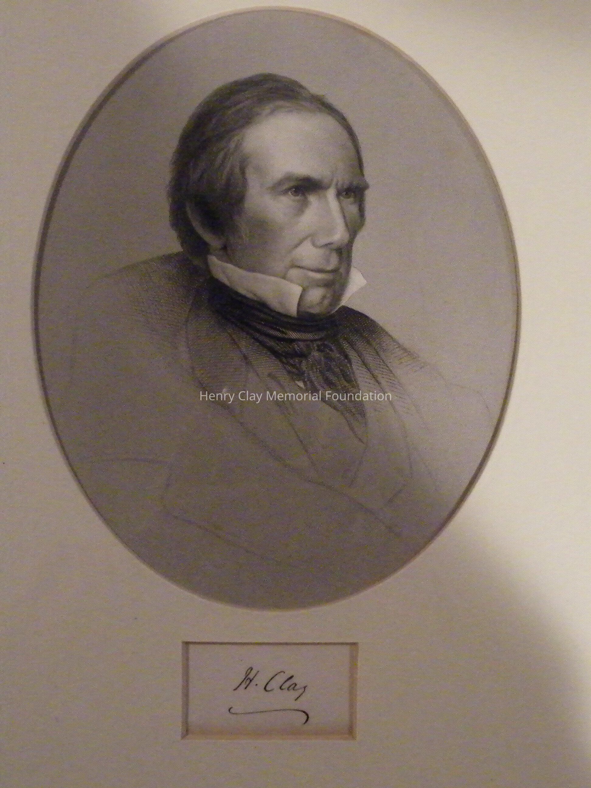 A print of Henry Clay. The print is a bust portrait of Clay facing right. He is in an overcoat, coat, white shirt, and cravat. The print is framed in a black frame with gold inner molding. The mat is cut with an oval opening for the portrait and a small rectangle for Clay's signature.