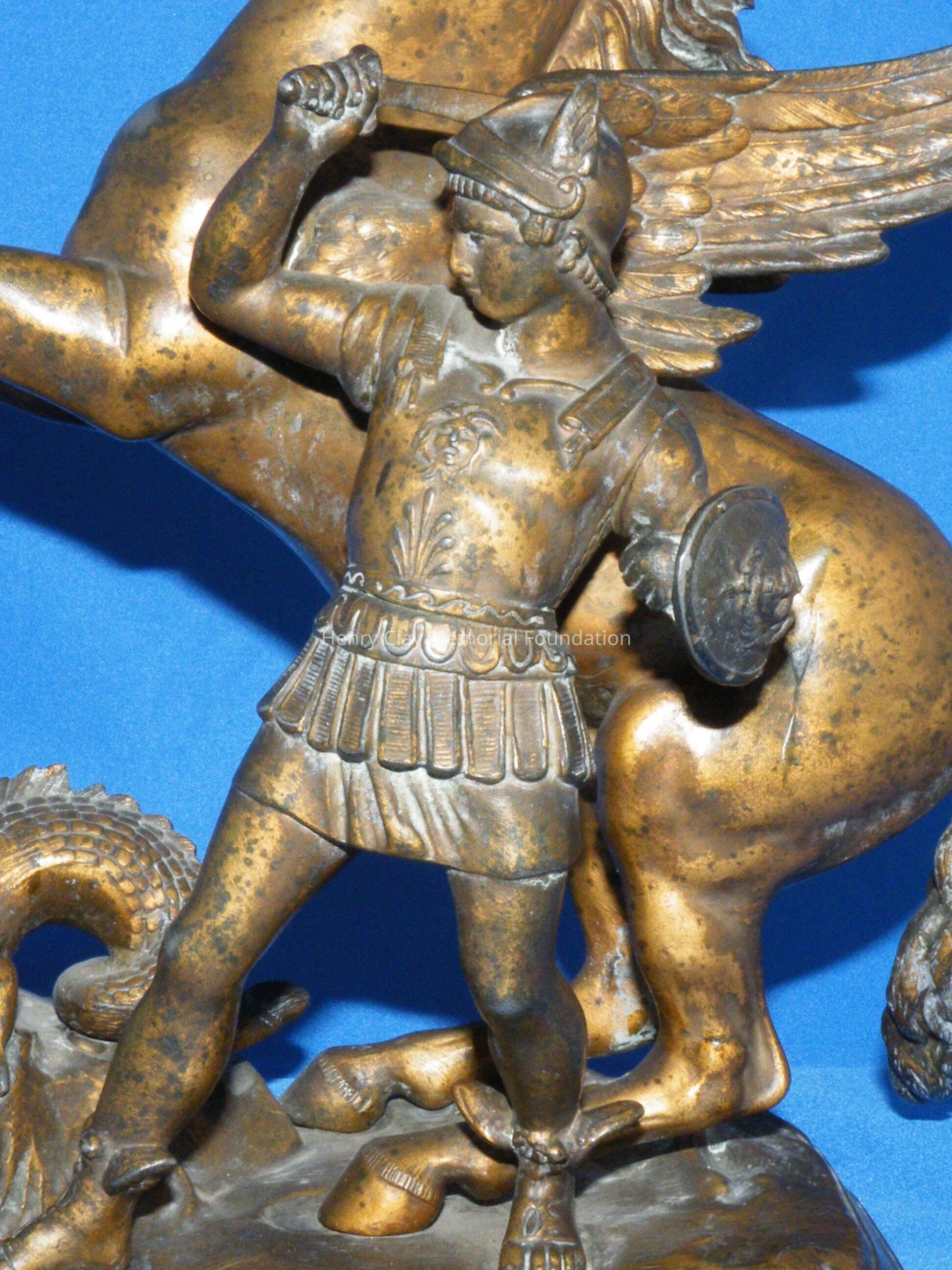 1 statue depicting a man with a sword and shield in Greek armor next to a winged horse. At their feet is a tiny dragon.