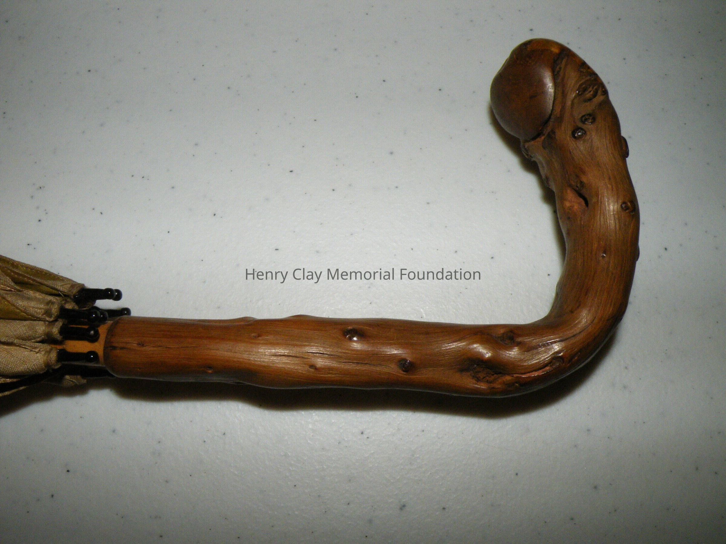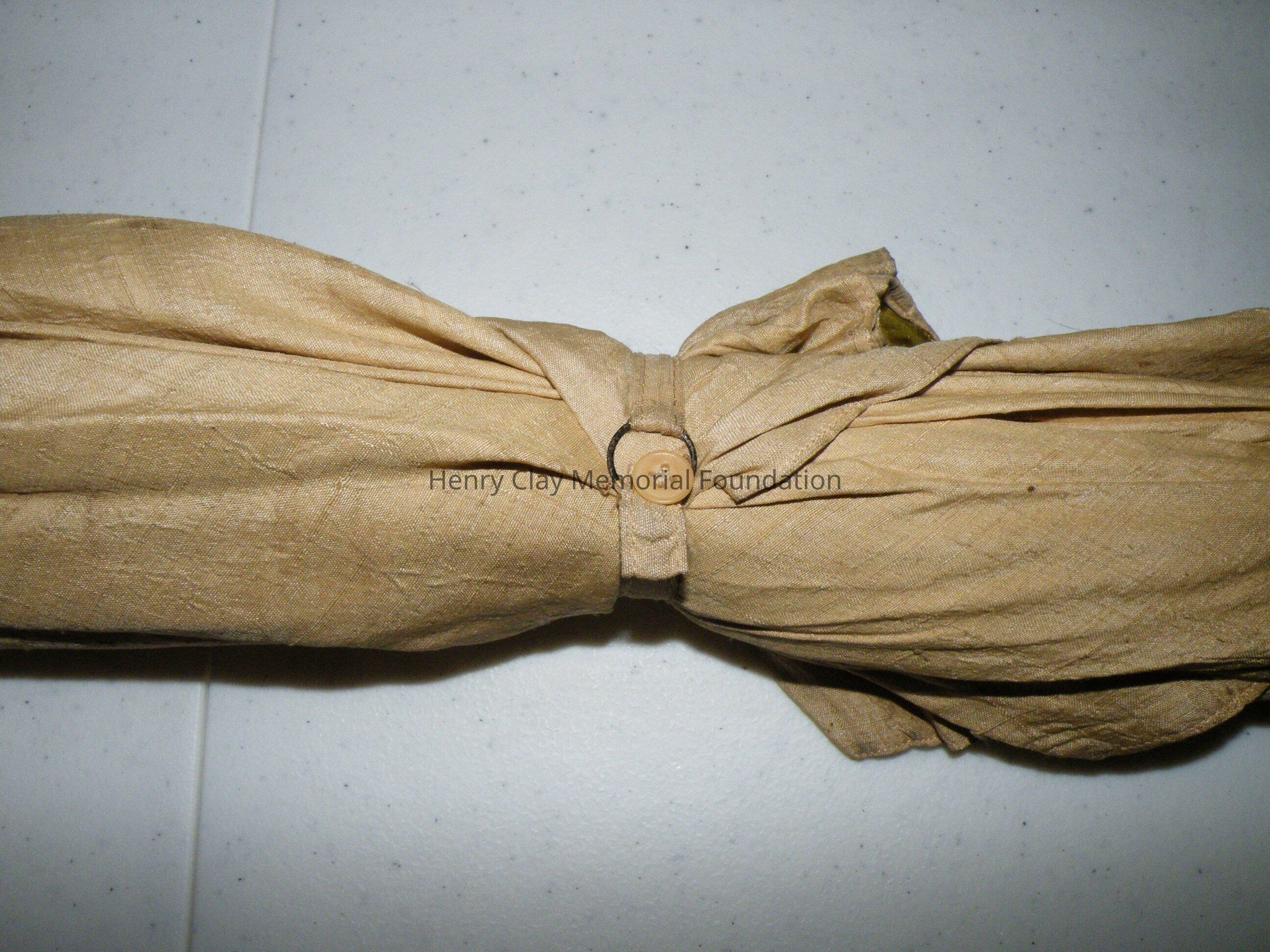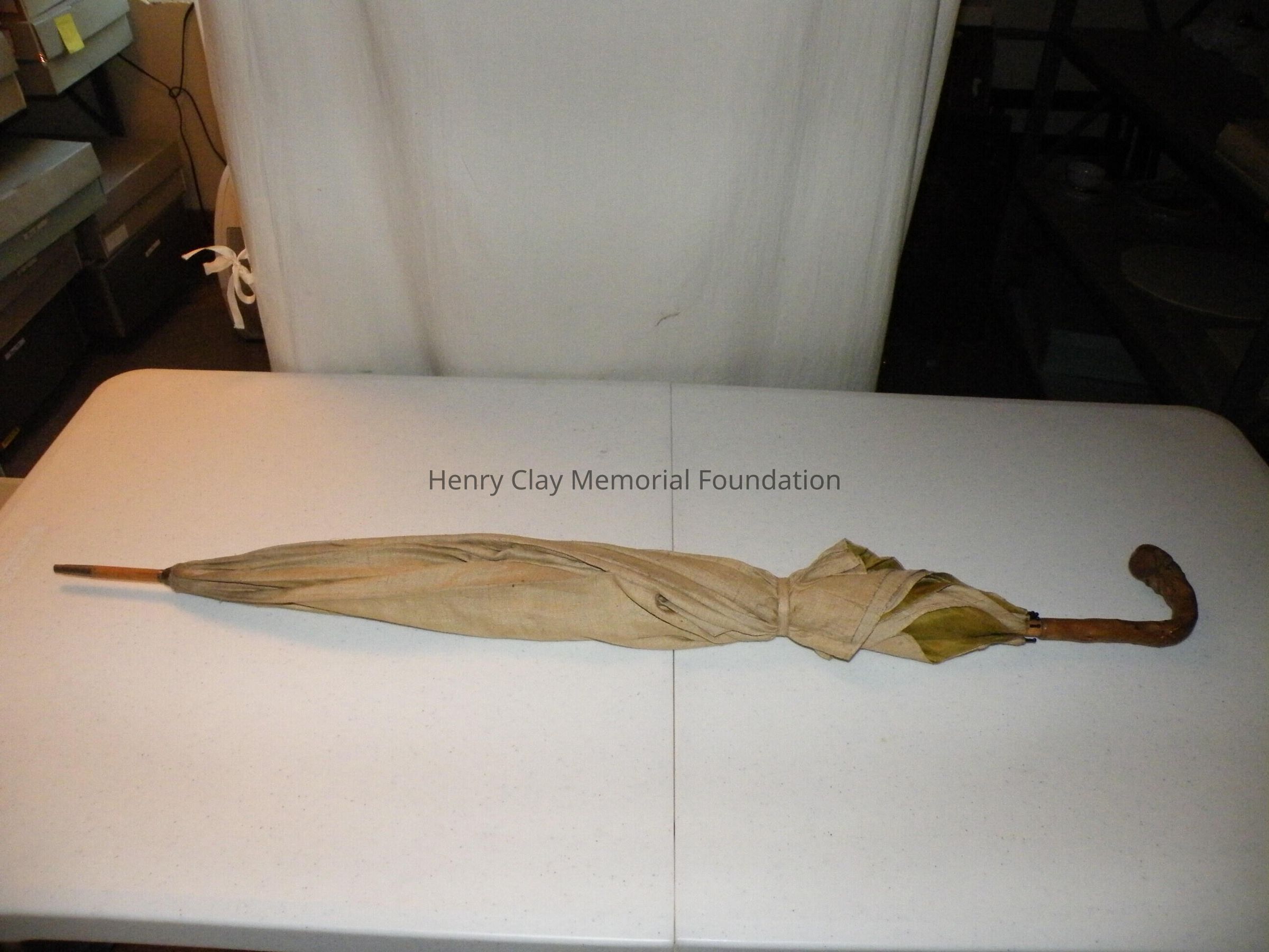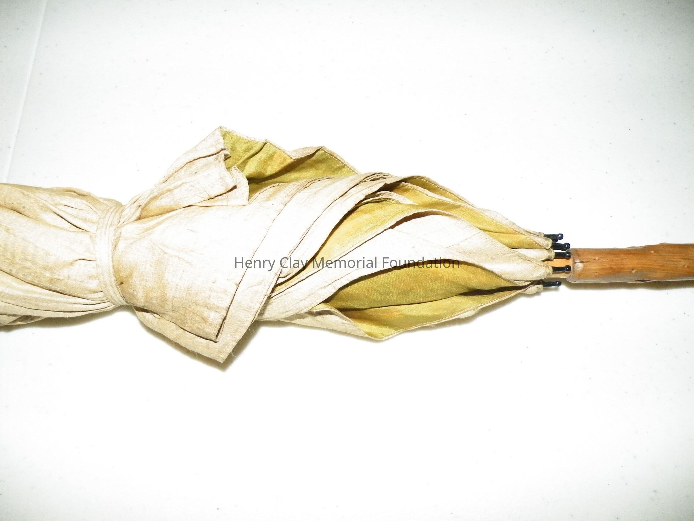 A silk umbrella with a natural wood handle. The umbrella fabric is raw cream silk on the outside and green silk on the inside. The ribs are metal. The rod is light colored wood. The handle is a piece of natural driftwood or similar that has been polished.