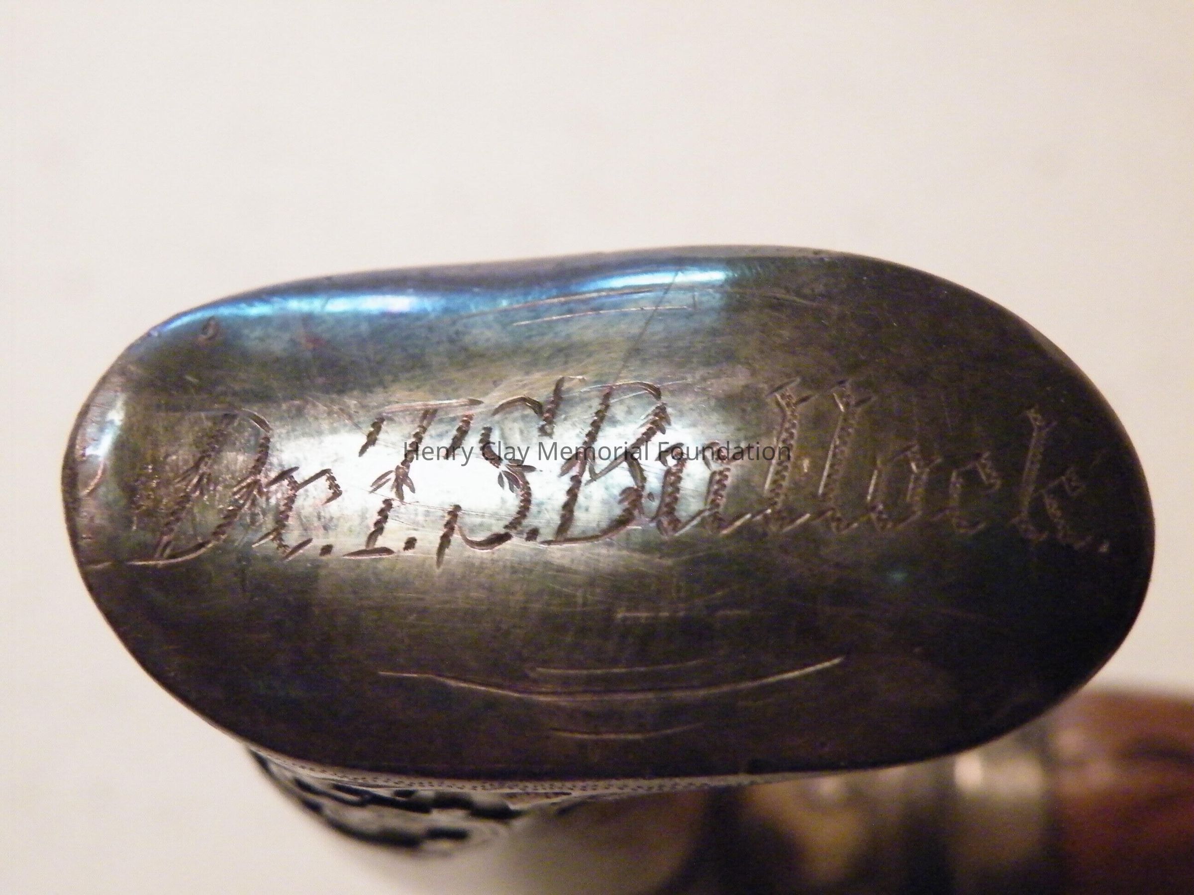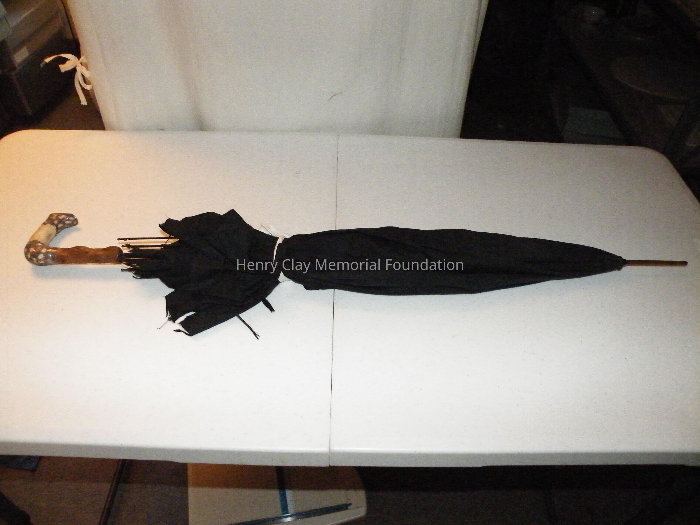 A black silk umbrella. The ribs are metal and the shaft is wooden. The handle is bone or ivory overlaid with silver filigree. The silver is stamped "Solid Silver" B S & P," "Pat. Jan 5 '86," and "Sterling." The end of the handle is engraved: "Dr. TS Bullock."