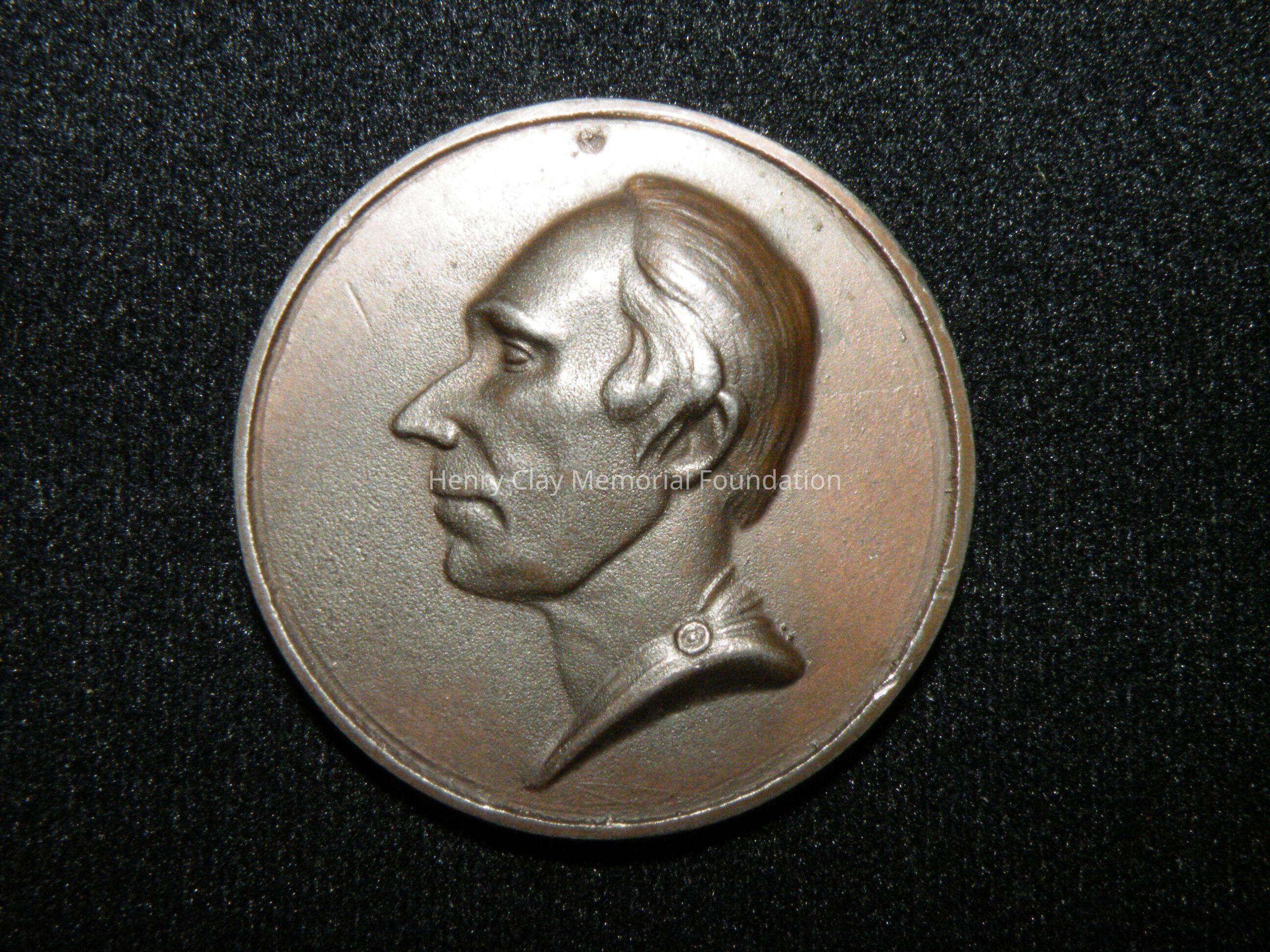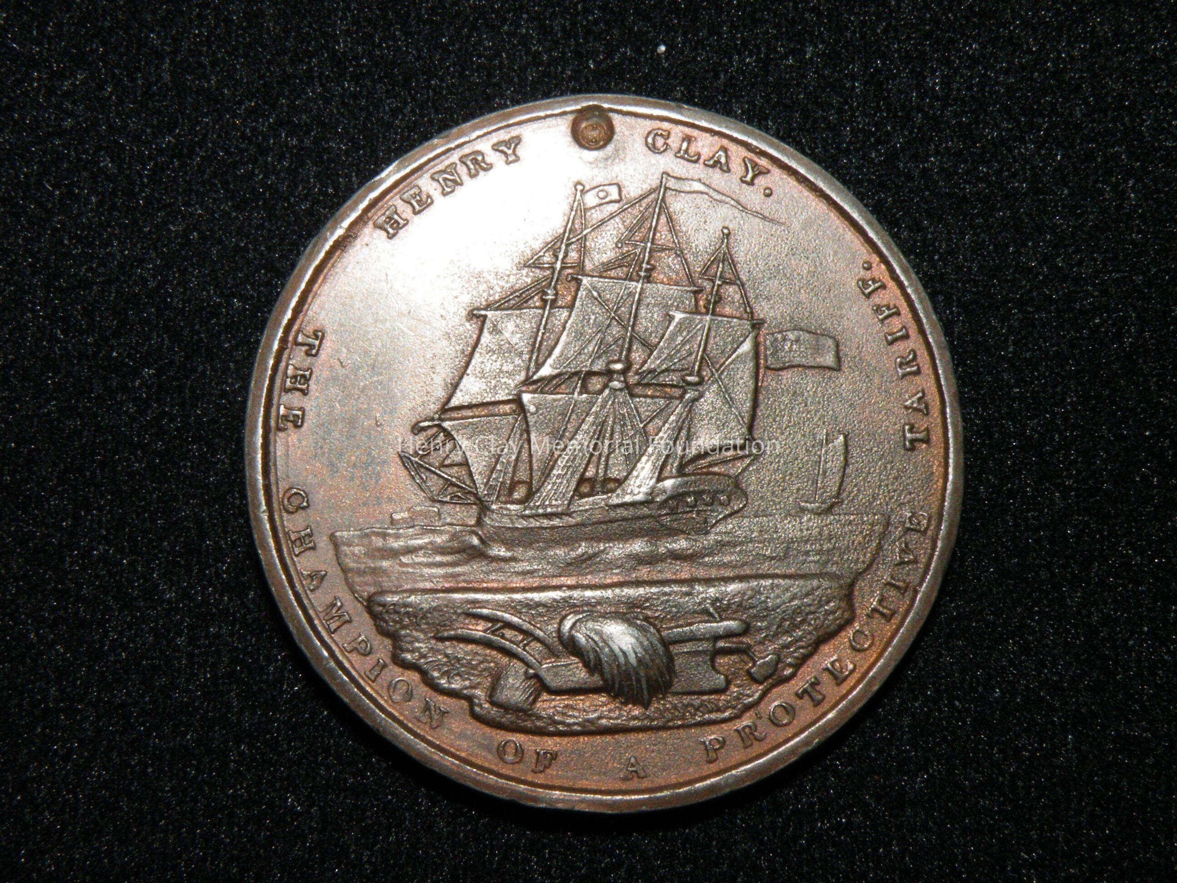 One large 1844 presidential campaign medal. On the obverse side it is a high relief profile of Henry Clay facing left. On the reverse side is a sailing ship above a plow, a shief of grain, and an anvil and hammer. Around the perimeter reads "Henry Clay, The Champion of a Protective Tariff" There is a spot at the top where someone attempted to place a hole.