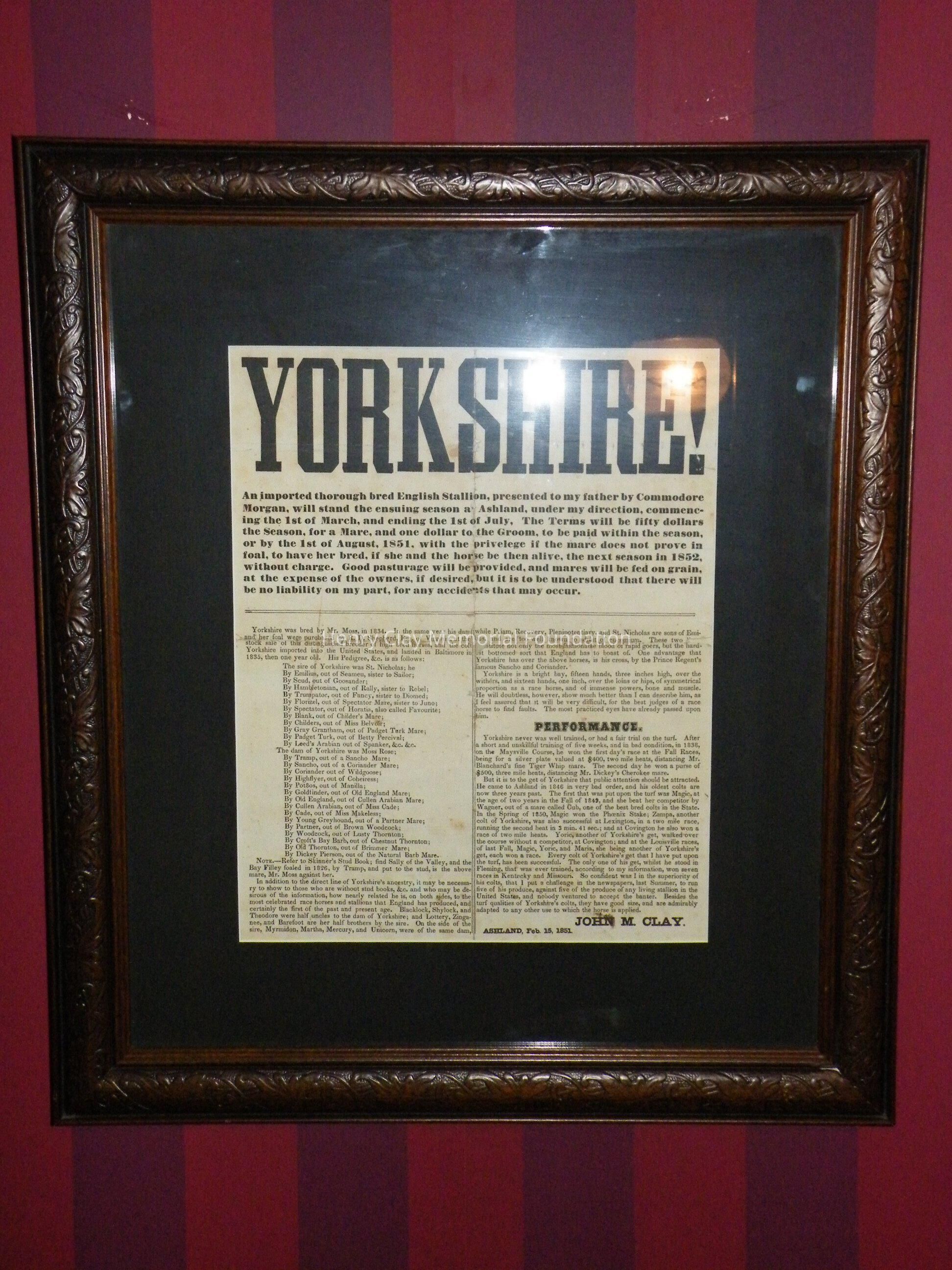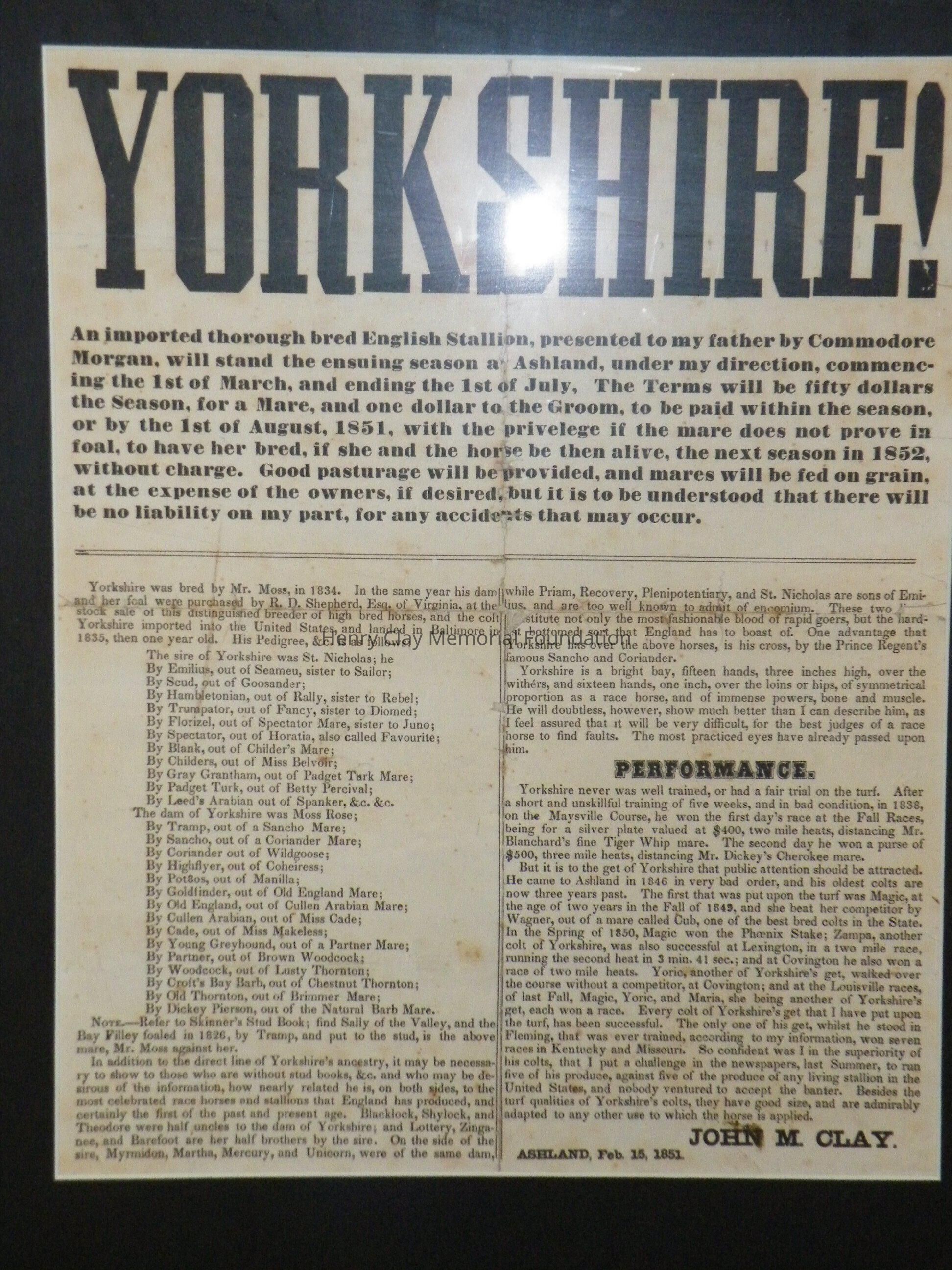 A framed broadside extolling the virtues of and advertising the services of the stallion Yorkshire.