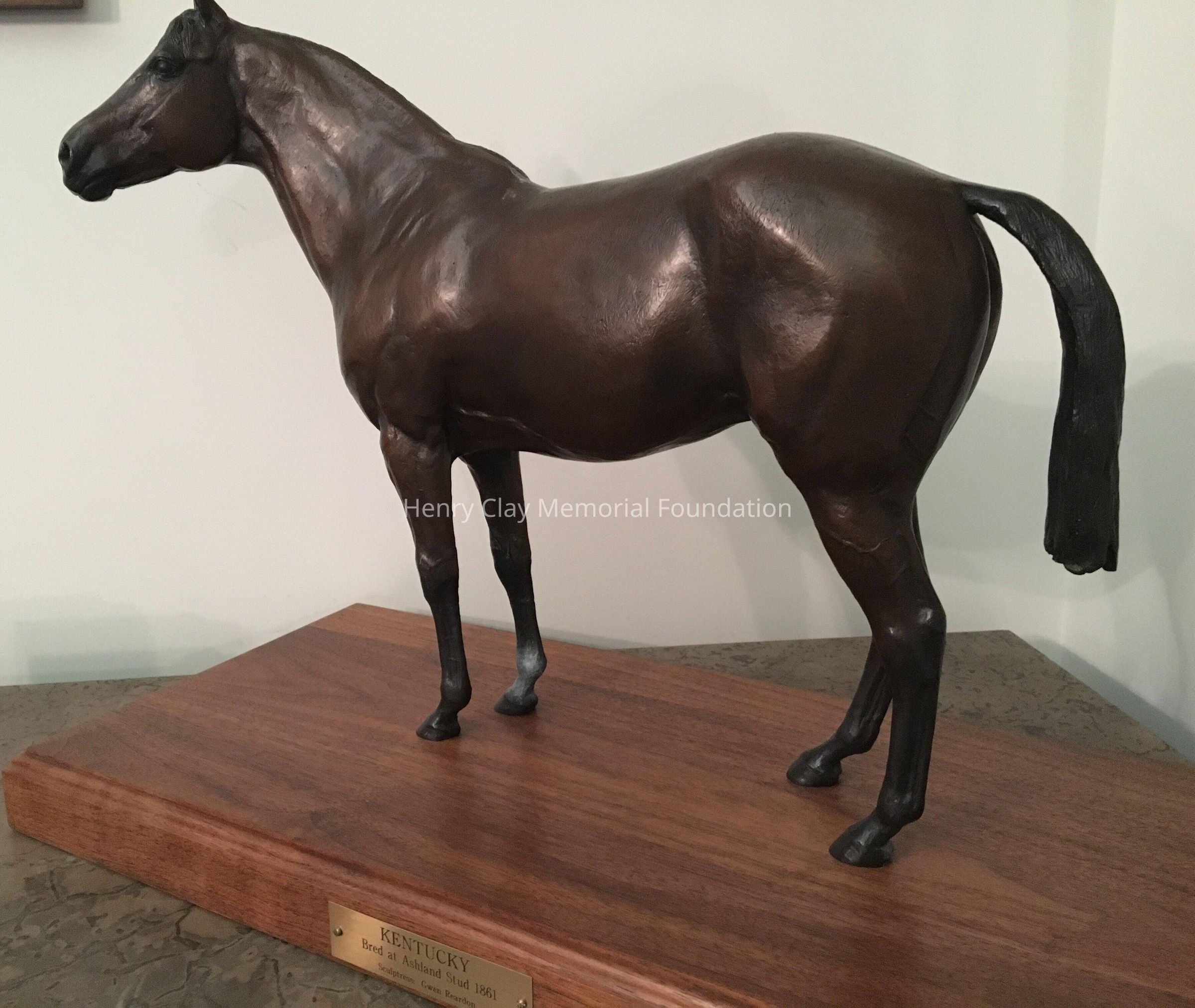 This statue is a bronze of a standing horse. It is mounted on a wood base with a plaque bearing the name "Kentucky".