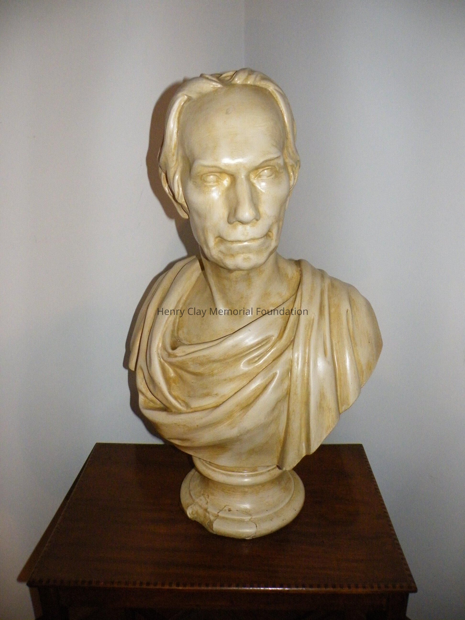 One plaster bust of Henry Clay. It is of an older Clay wearing a toga. The plaster is white with a brown finish. The bust has a round pedestal base.