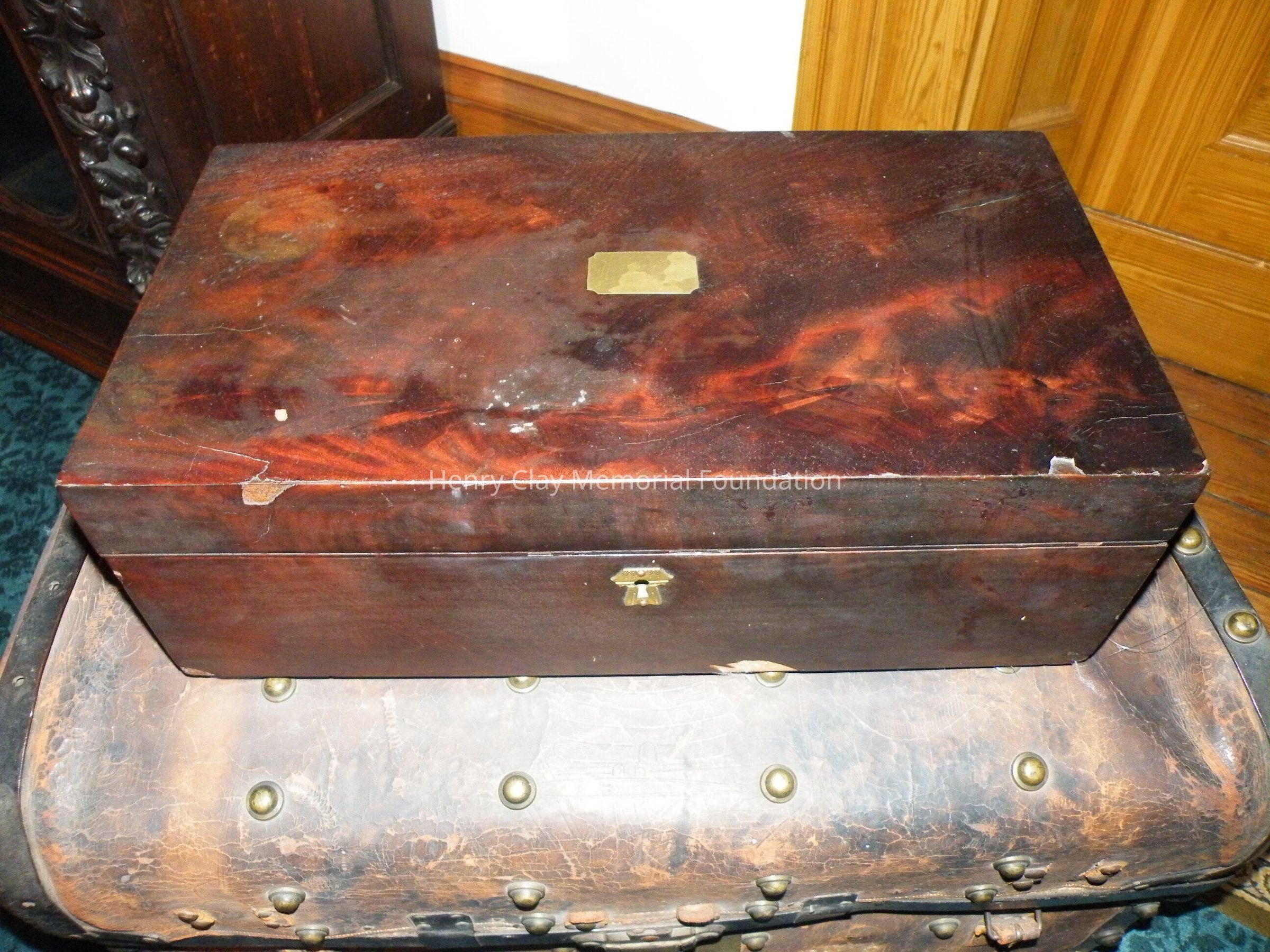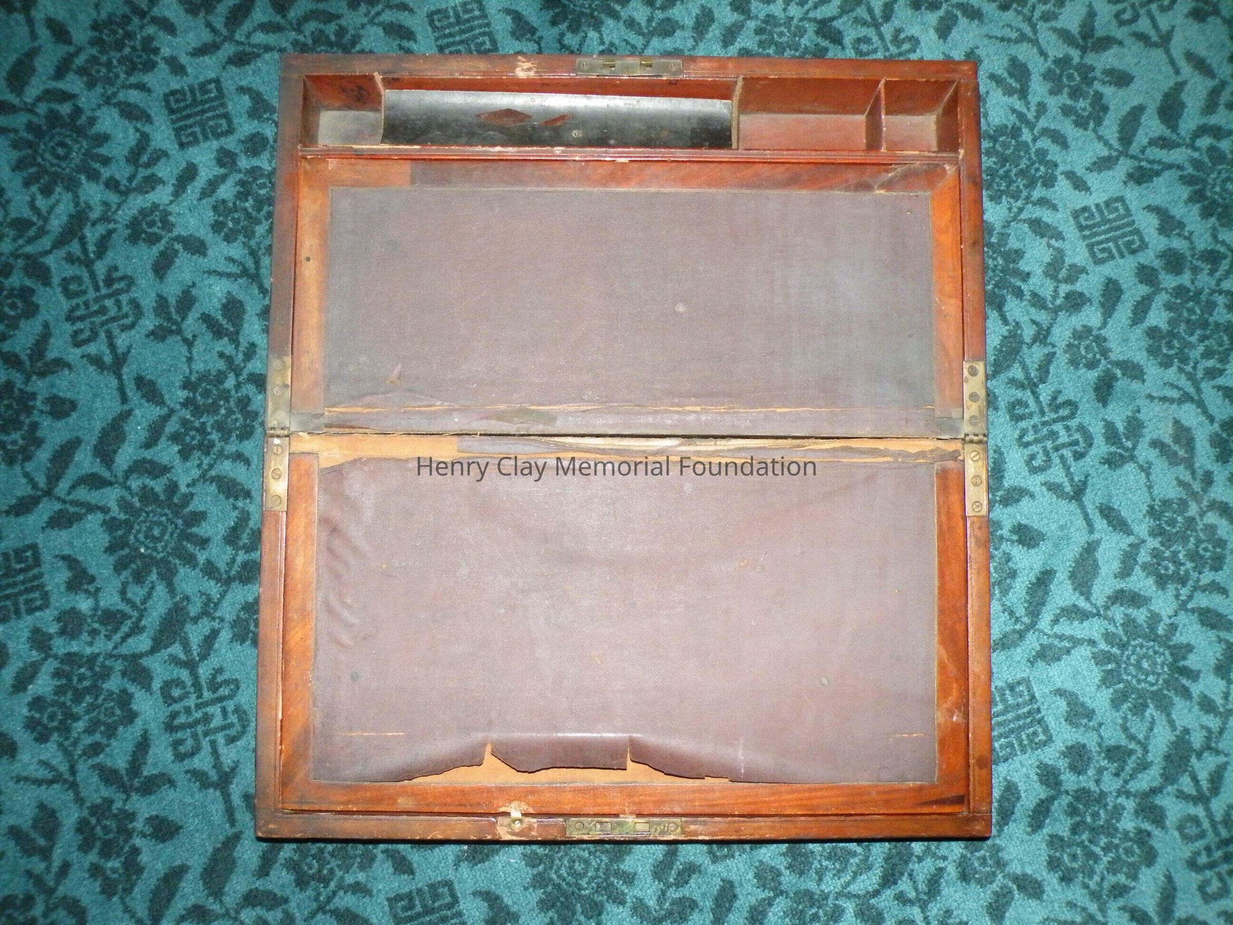 1 folding traveling desk. The desk opens to form a slant top writing surface. Unde the slat top surface are compartments for documents, paper, etc. There is place for an inkwell and sand shaker in the desk and a quill tray for quills. The desk is mahogany veneer with brass handles and an escutcheon on top.