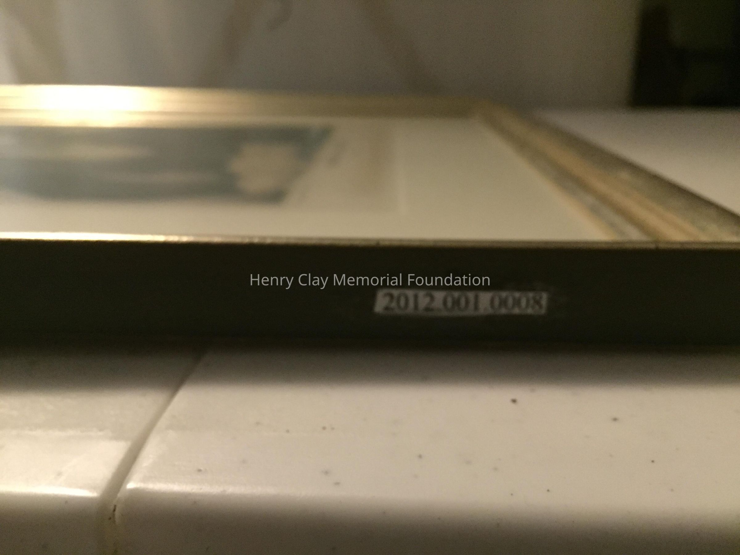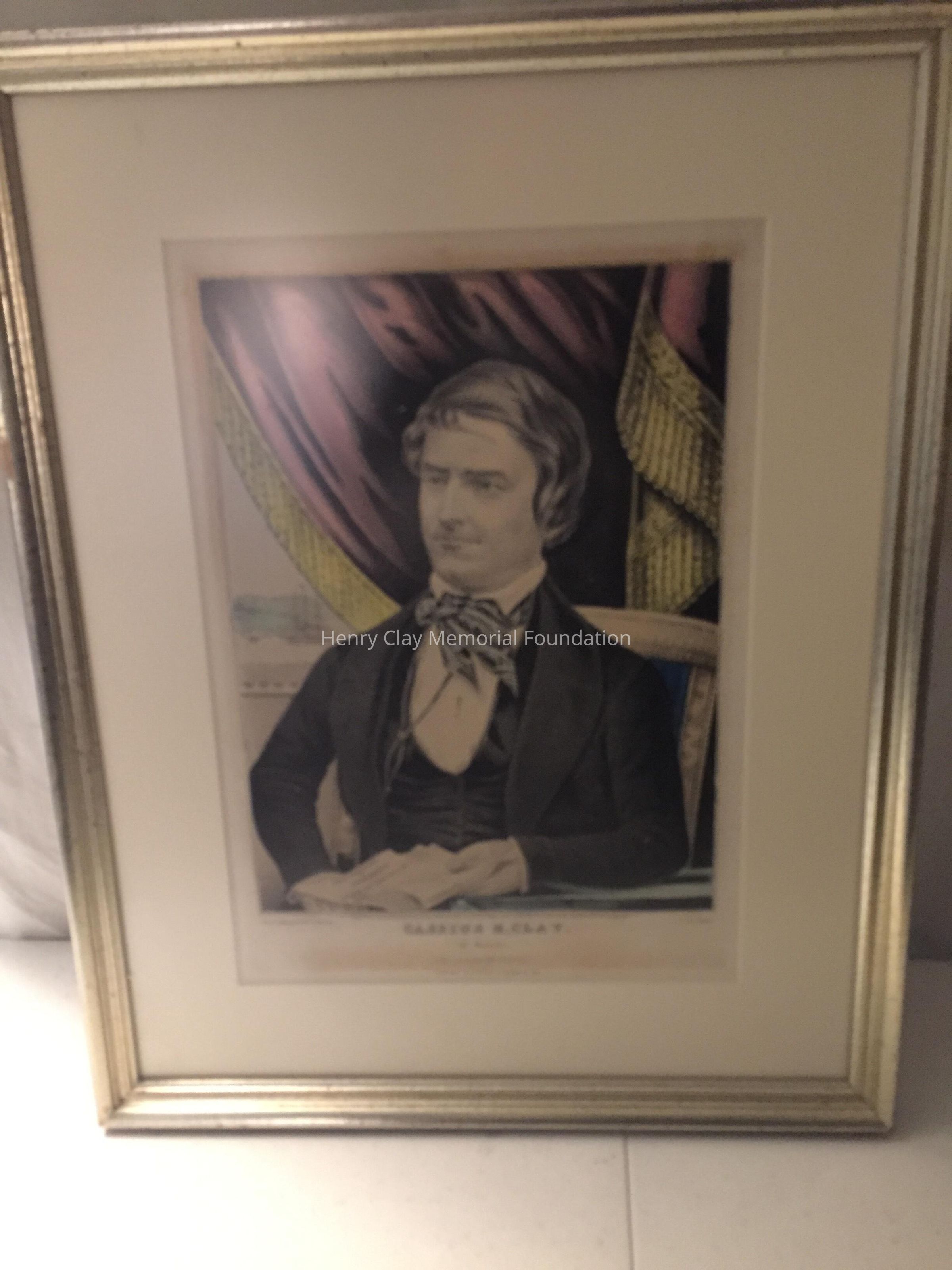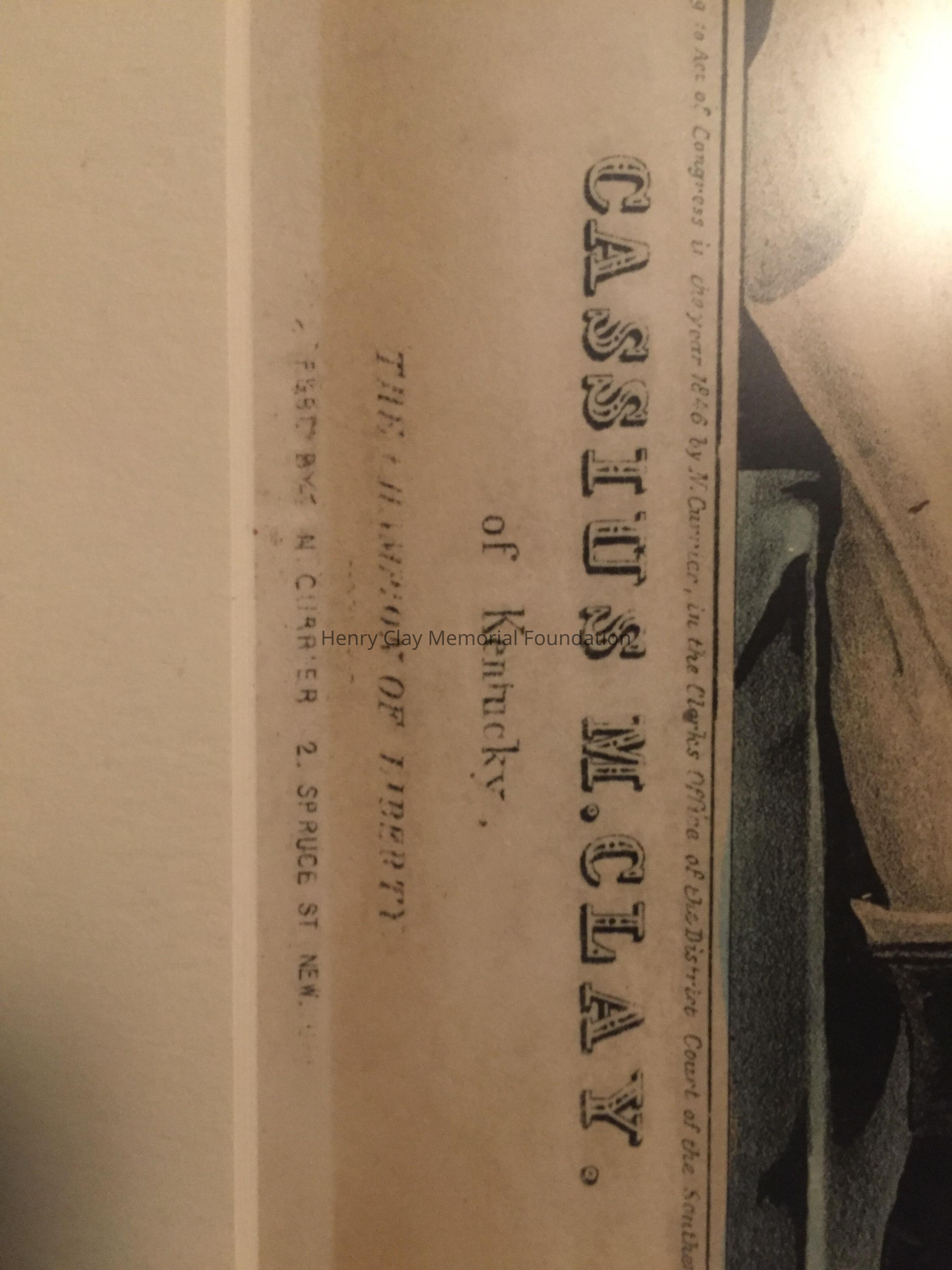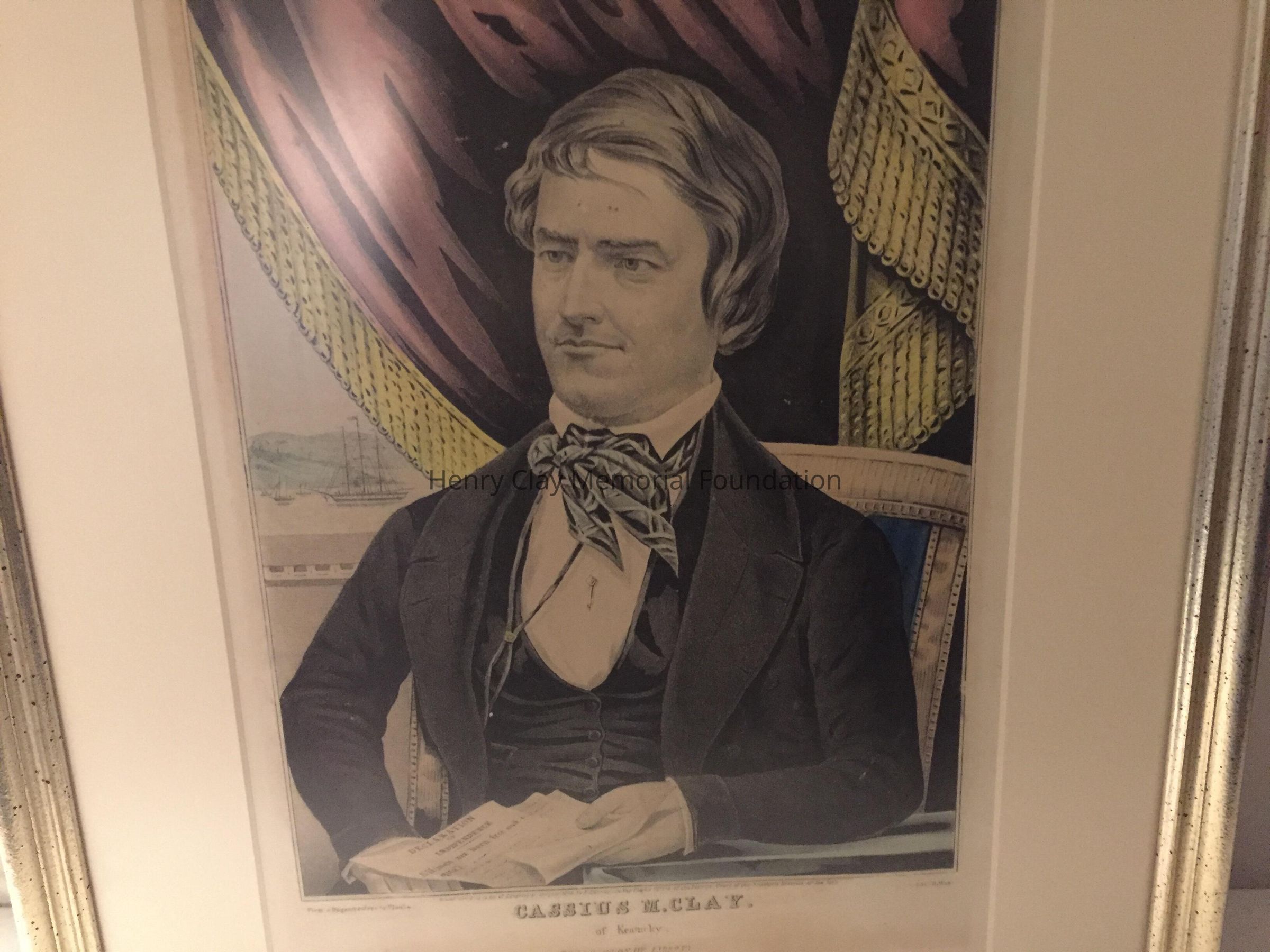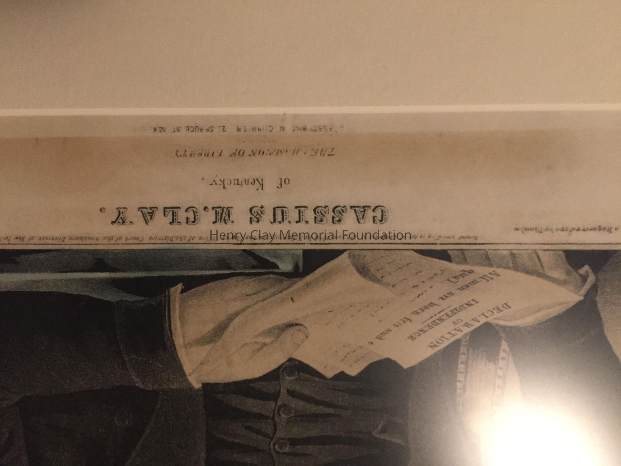 The engraving features Cassius Clay. Clay is seated and holding the Declaration of Independence. Beneath the portrait are the notes: "From a Dagurreotype by Plumbe" and "Entered according to Act of Congress in the year 1846 by N. Currier, in the Clerks Office of the District Court of the Southern District of New York" and "251 R. Way." Beneath this is the title: "Cassius M. Clay./ of Kentucky,/ The Champion of Kentucky." And below that: "Publ.by N. Currier 2. Spruce St. New..." The engraving is hand-colored and framed.Dimensions