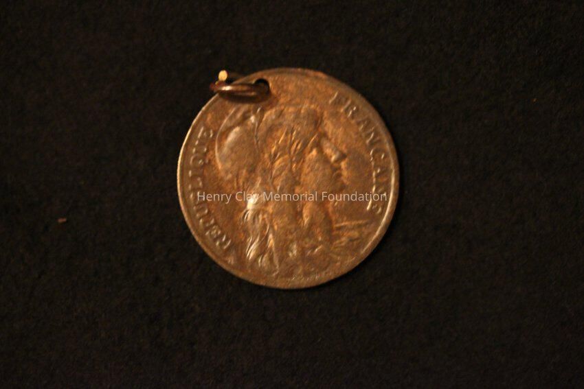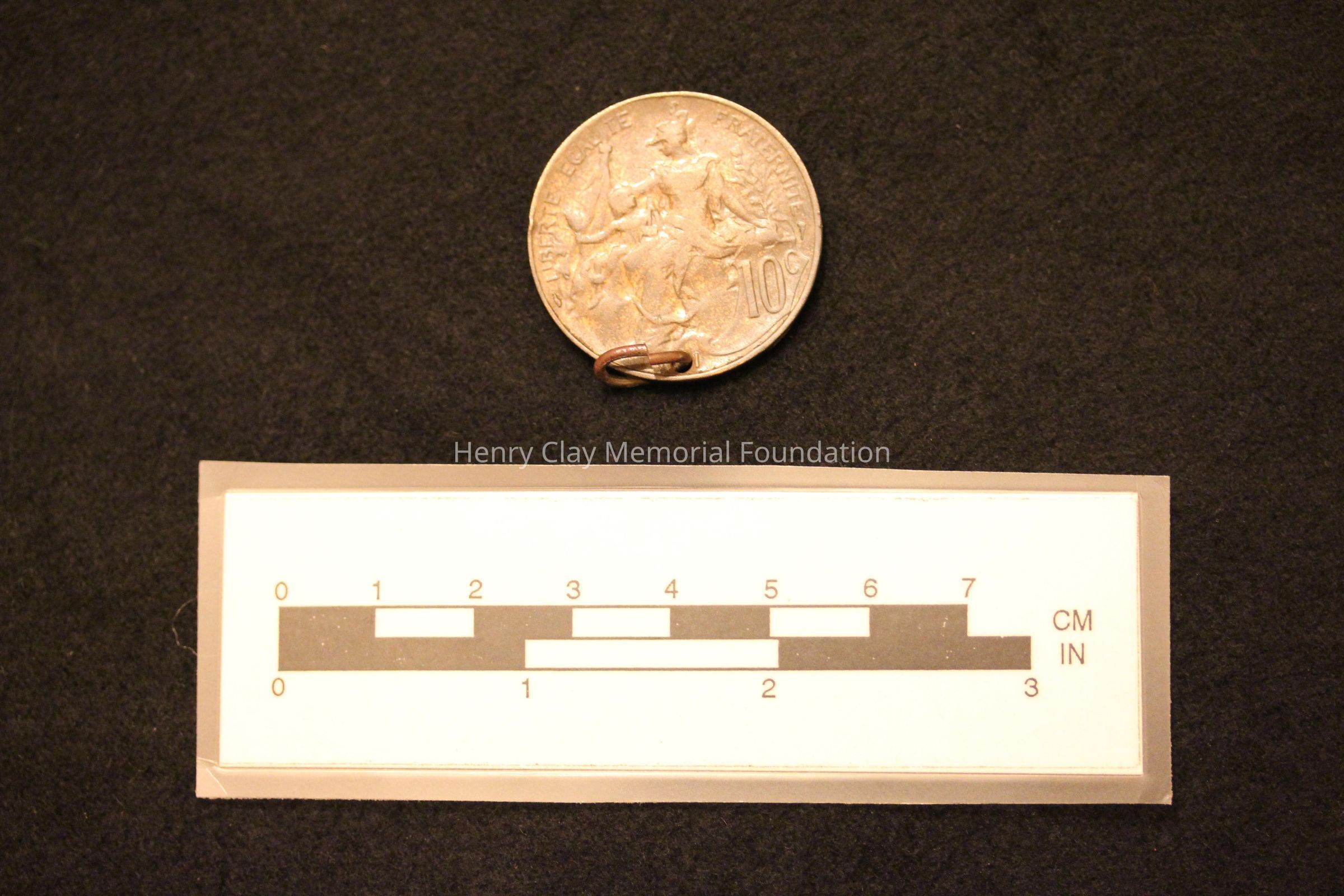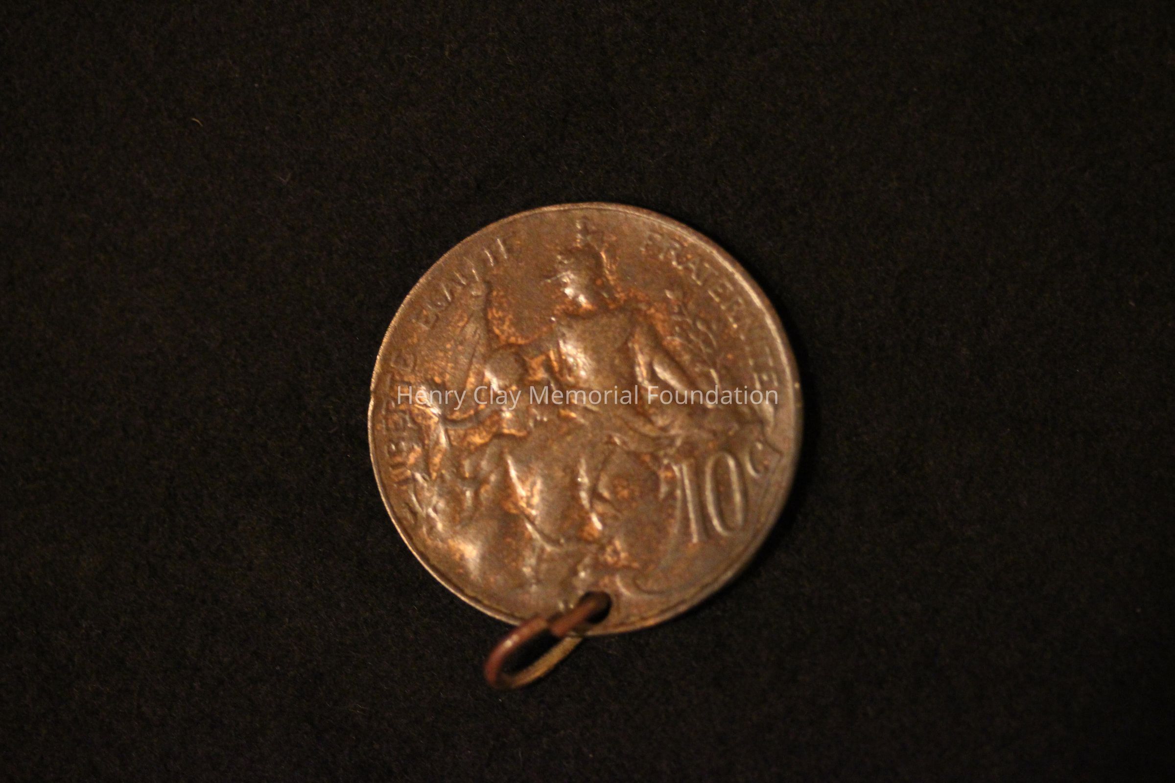 One French Ten Centime coin with hole punch along edge through which a silver ring has been passed to form a pendant. The coin is likely brass or copper alloy. It features on the obverse a seated woman holding a child surounded by the words "Liberte Fraterinte Egalite" and the numeral 10c. The reverse features a bust portrait of a woman in a Liberty Cap surrounded by the words "Republique Francaise". Beneath the bust is what may be an artist's name but it is too obscured to read. The date on the coin is obliterated by the hole punched in it.Material