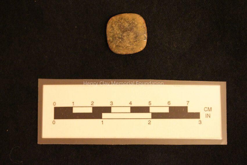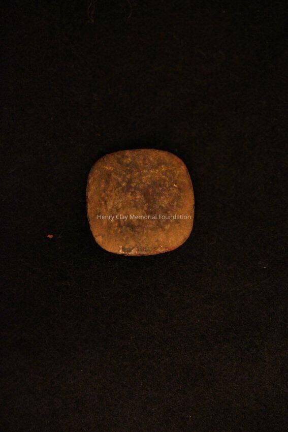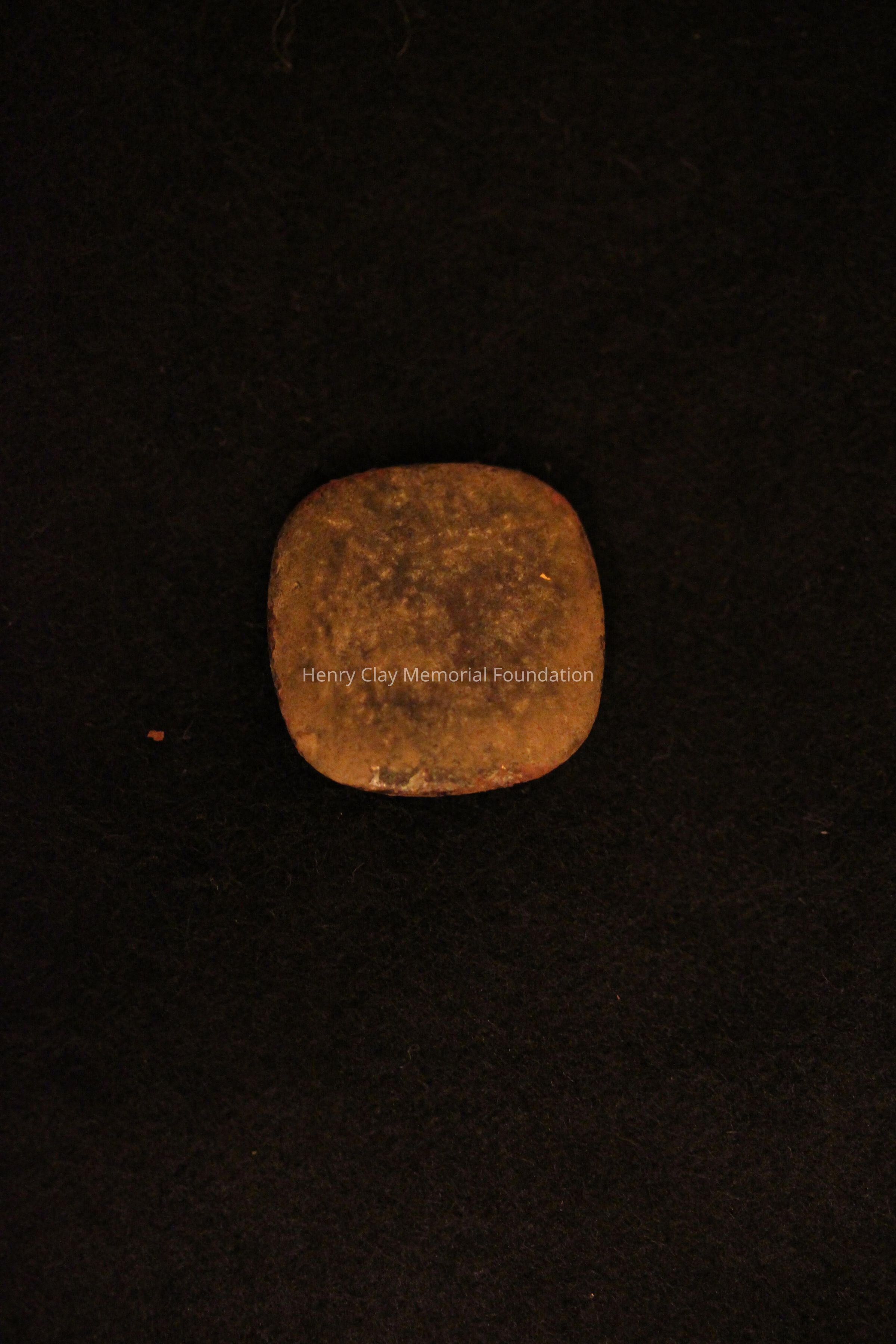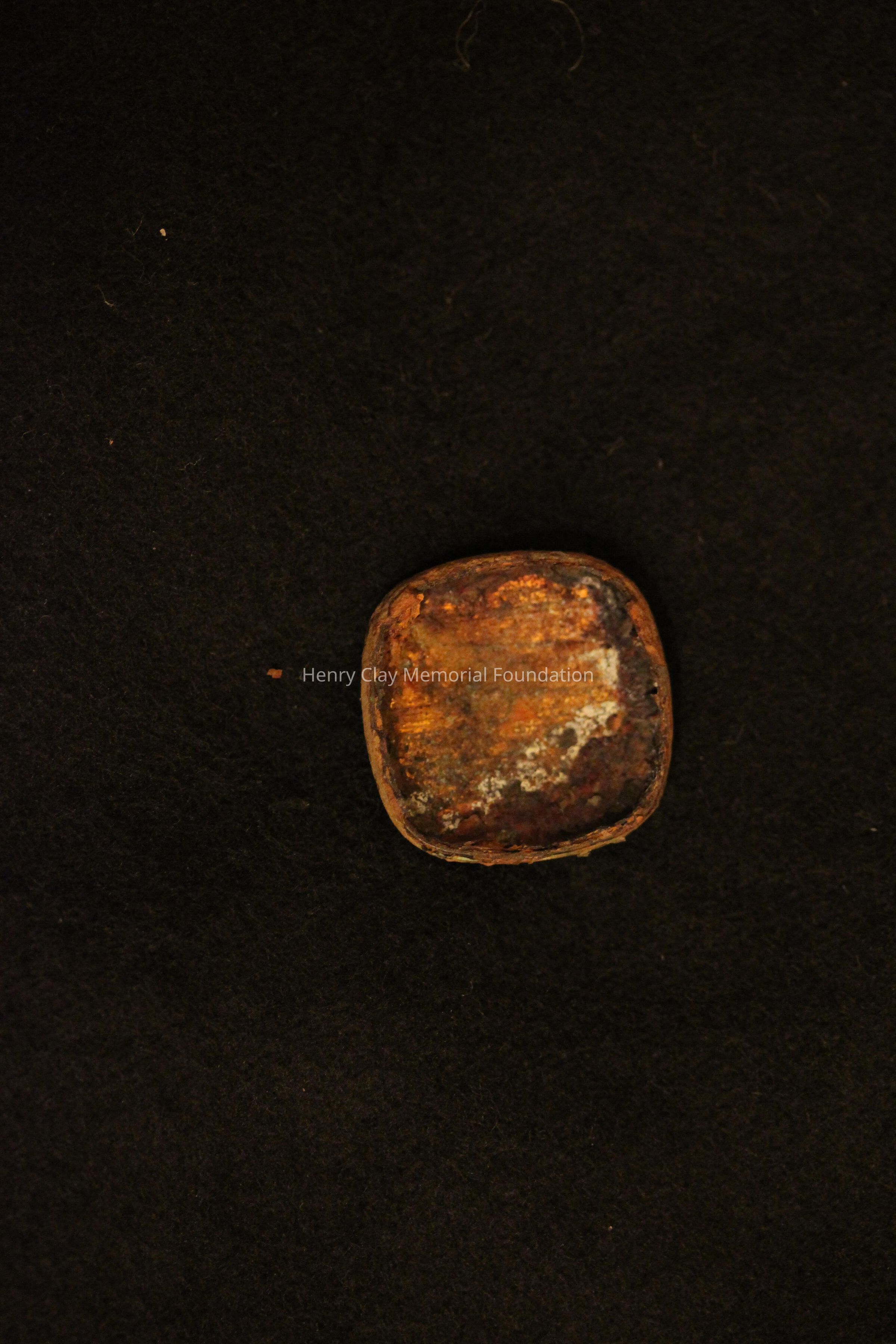 Black suare button top with rounded corners. Means of attachment to clothing is missing,