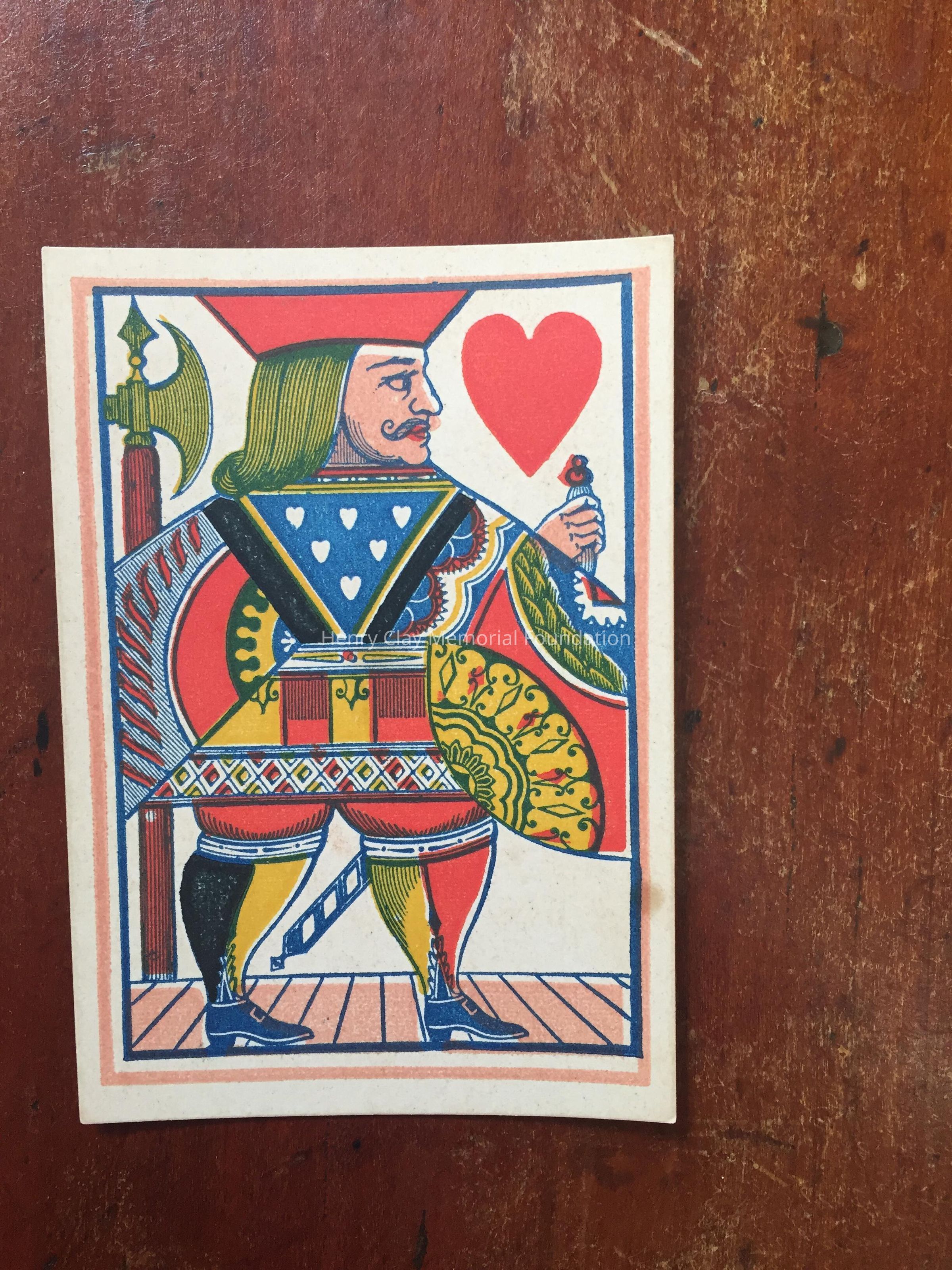 Jack of Hearts card.On the back is Henry Clay's side portrait on the back in a circle on the right of the card. On the left of the back of the card there is a circle with a list of Clay's achievements including "Senate 1806" "Speaker 1811" "War of 1812 with C. Britain" etc. The back of the card is printed in green and red ink.