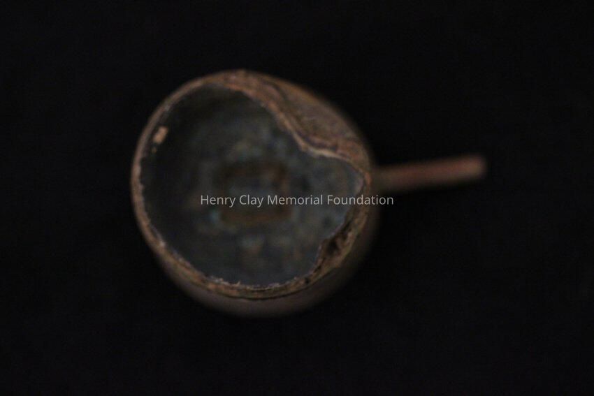 End of casing, imprinted with the name "Eleybro. London" with a "10" in the middle. Has a small cylindrical attachment directly above the ten, and a slight indent on its side.