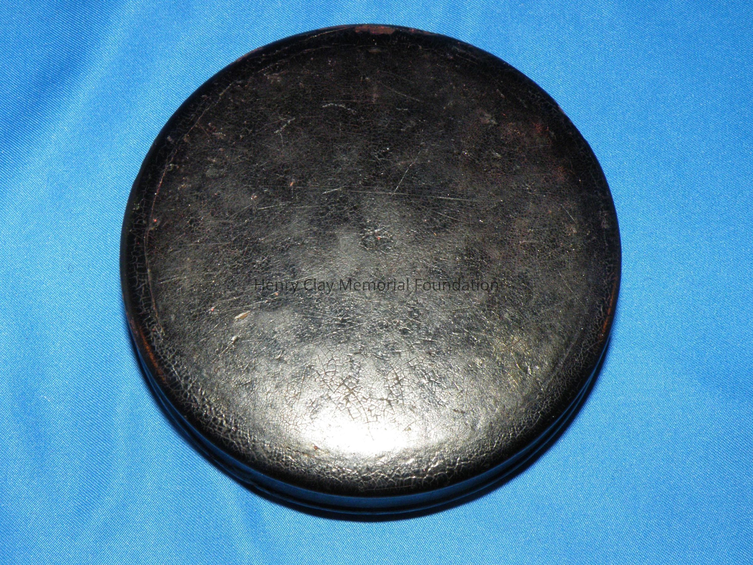 Circular papier mache snuffbox with lift off lid. The lid bears a picture of Henry Clay holding a paper that is engraved. The base has an inset lip over which the lid rests. The box is black and the engraving is a darkened yellow color.