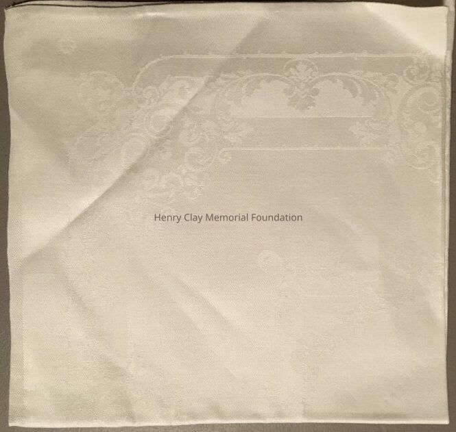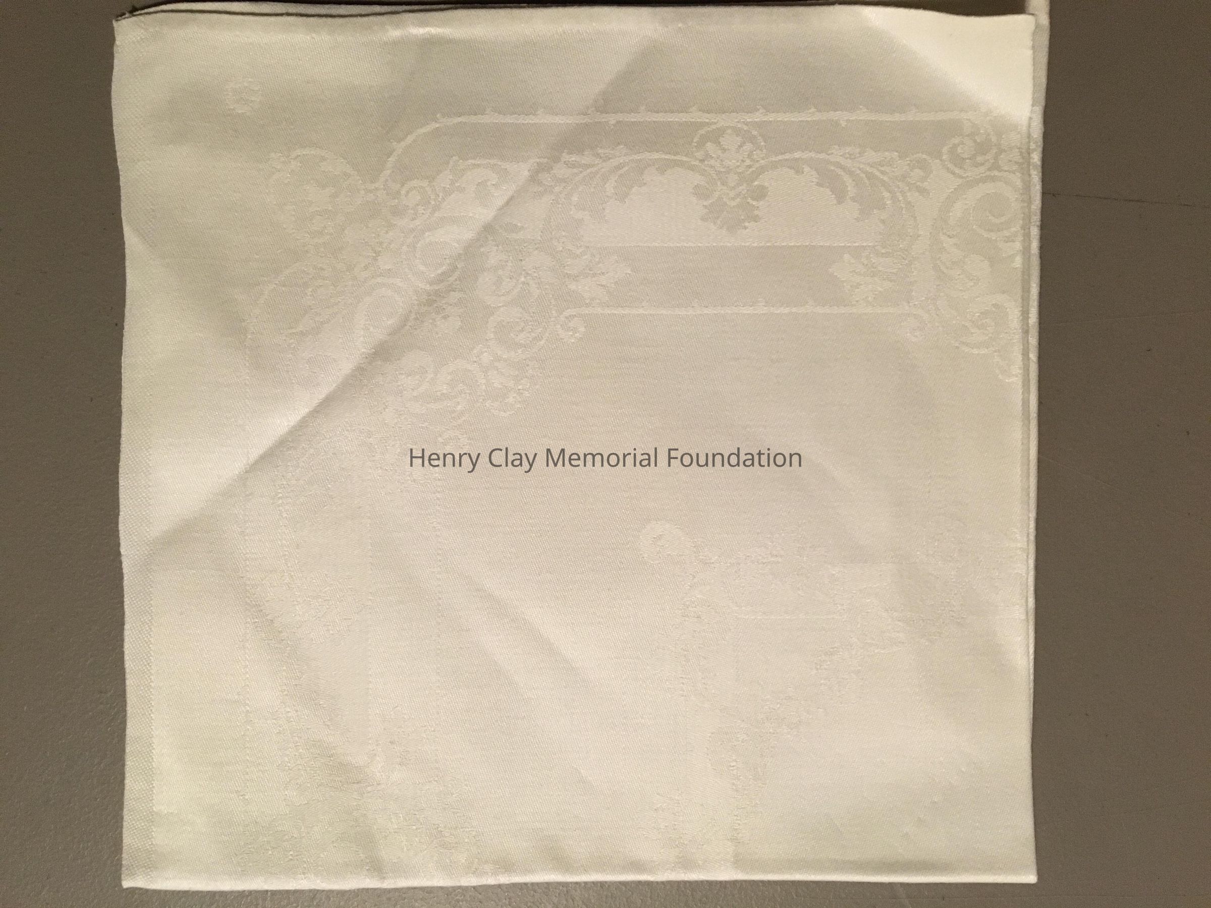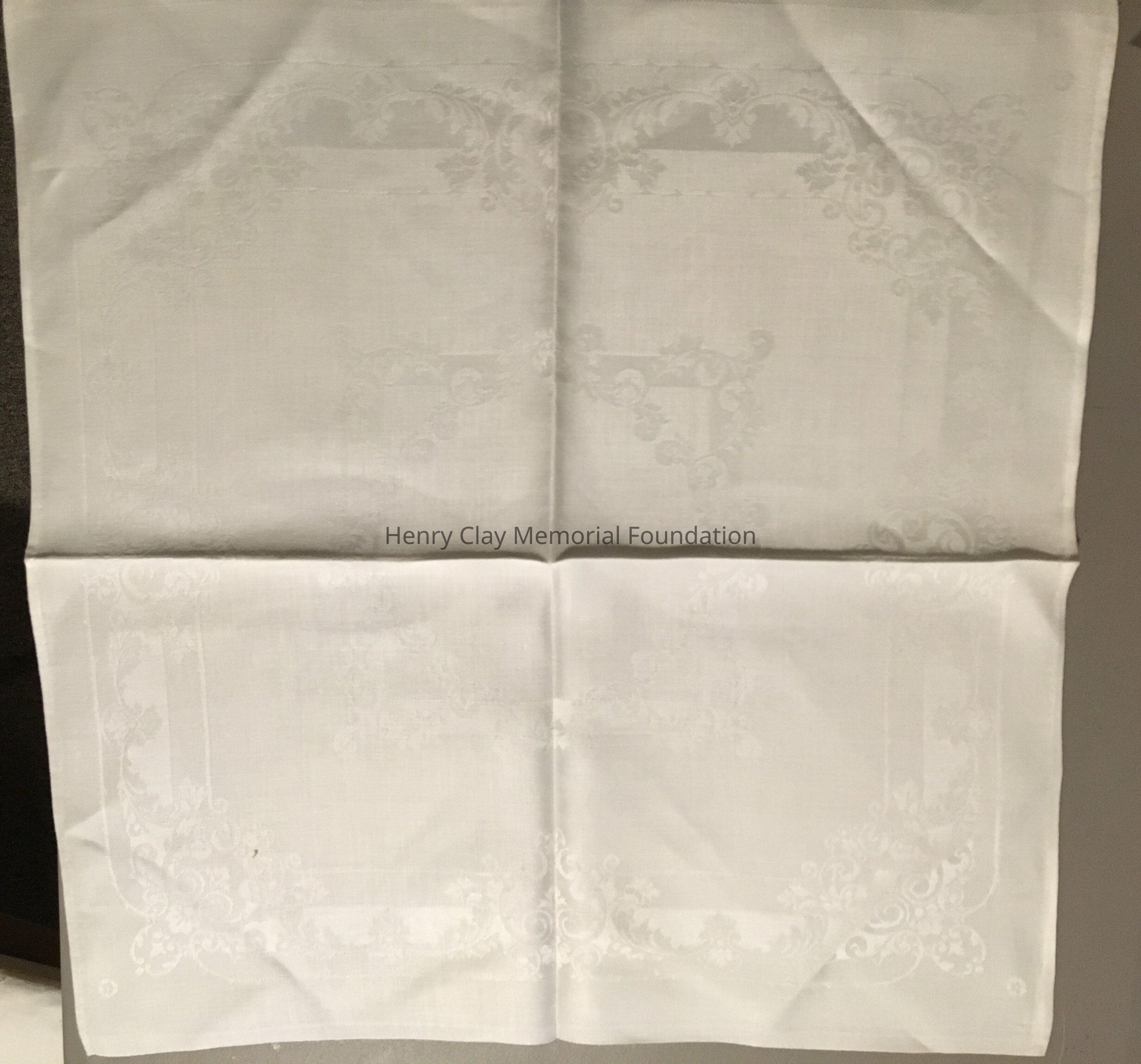 12 white damask napkins. Square, large, with floral design ( a floral square along the perimeters, and a floral square within the square)