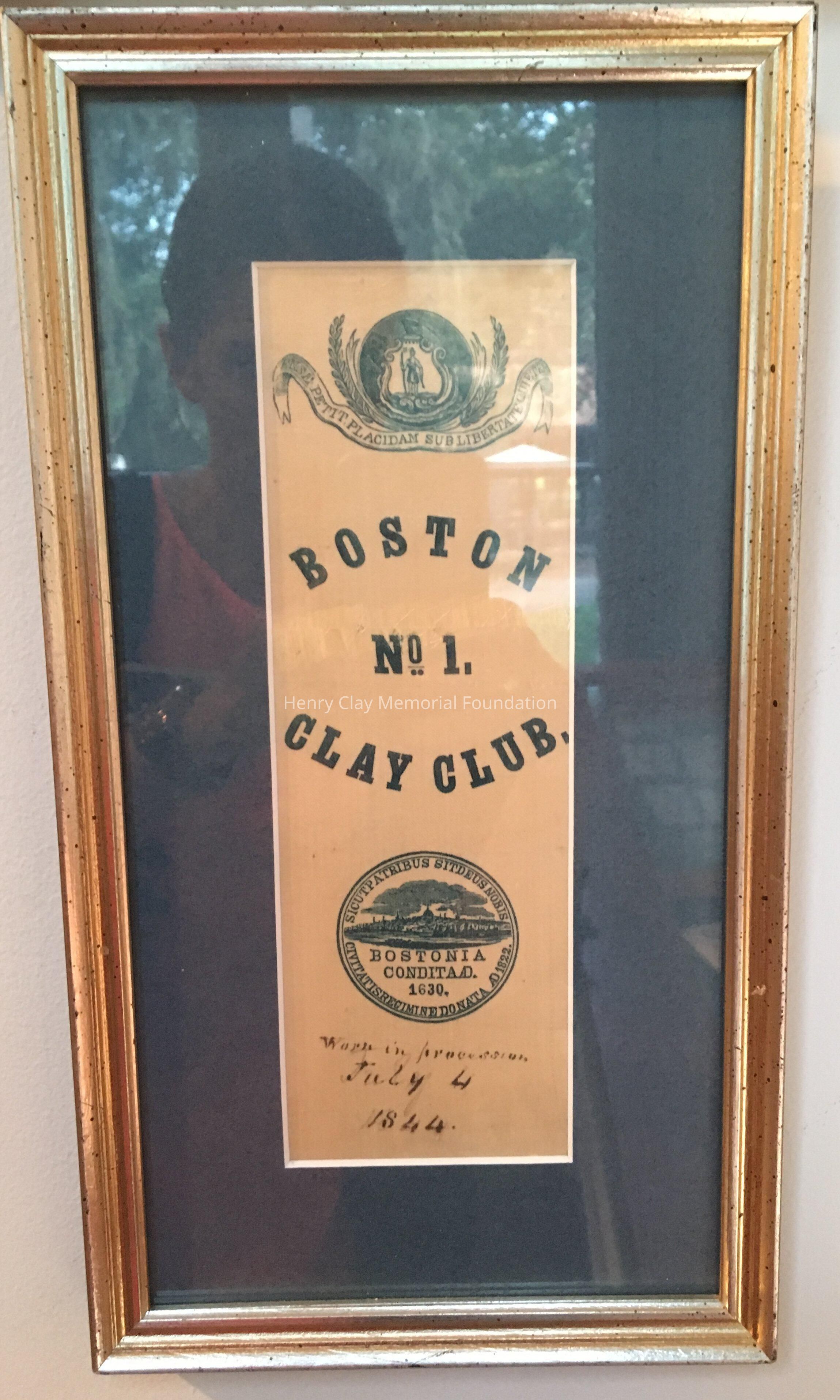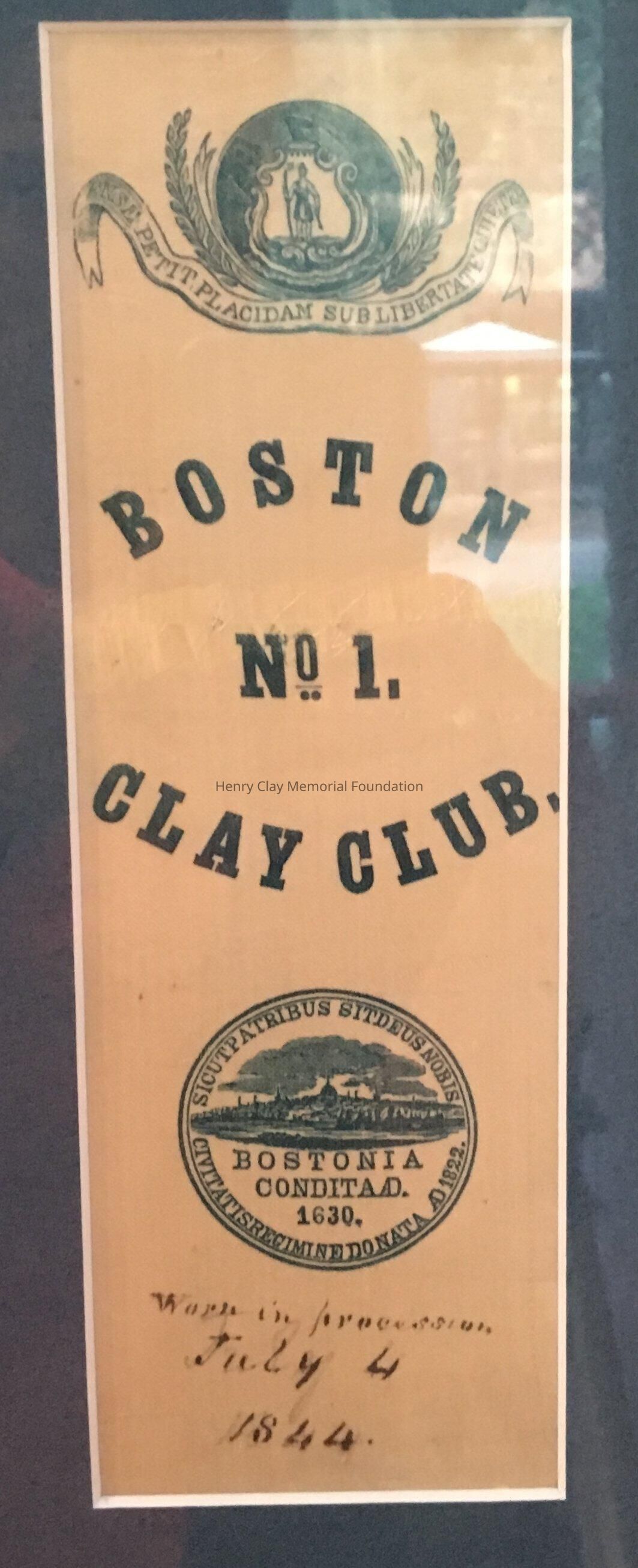 Boston No. 1 Clay Club Ribbon july 4,1844. White with blue writing, rectangular shape. In handwriting at the bottom of the ribbon, "Worn in procession July 4th 1844".Materials