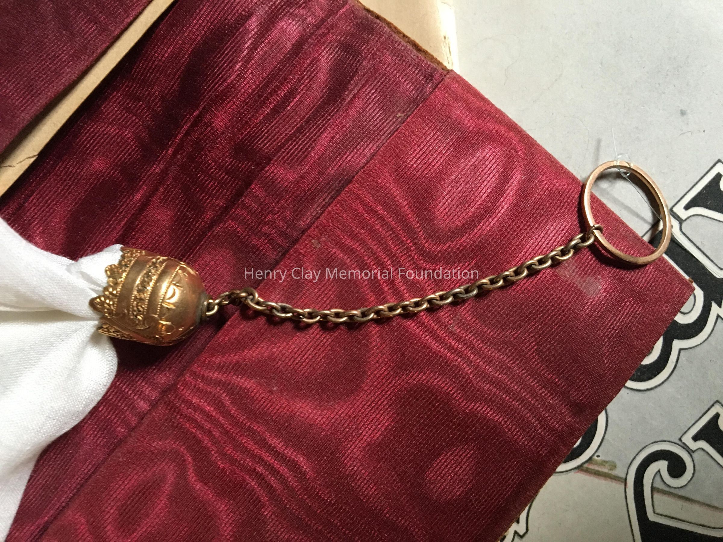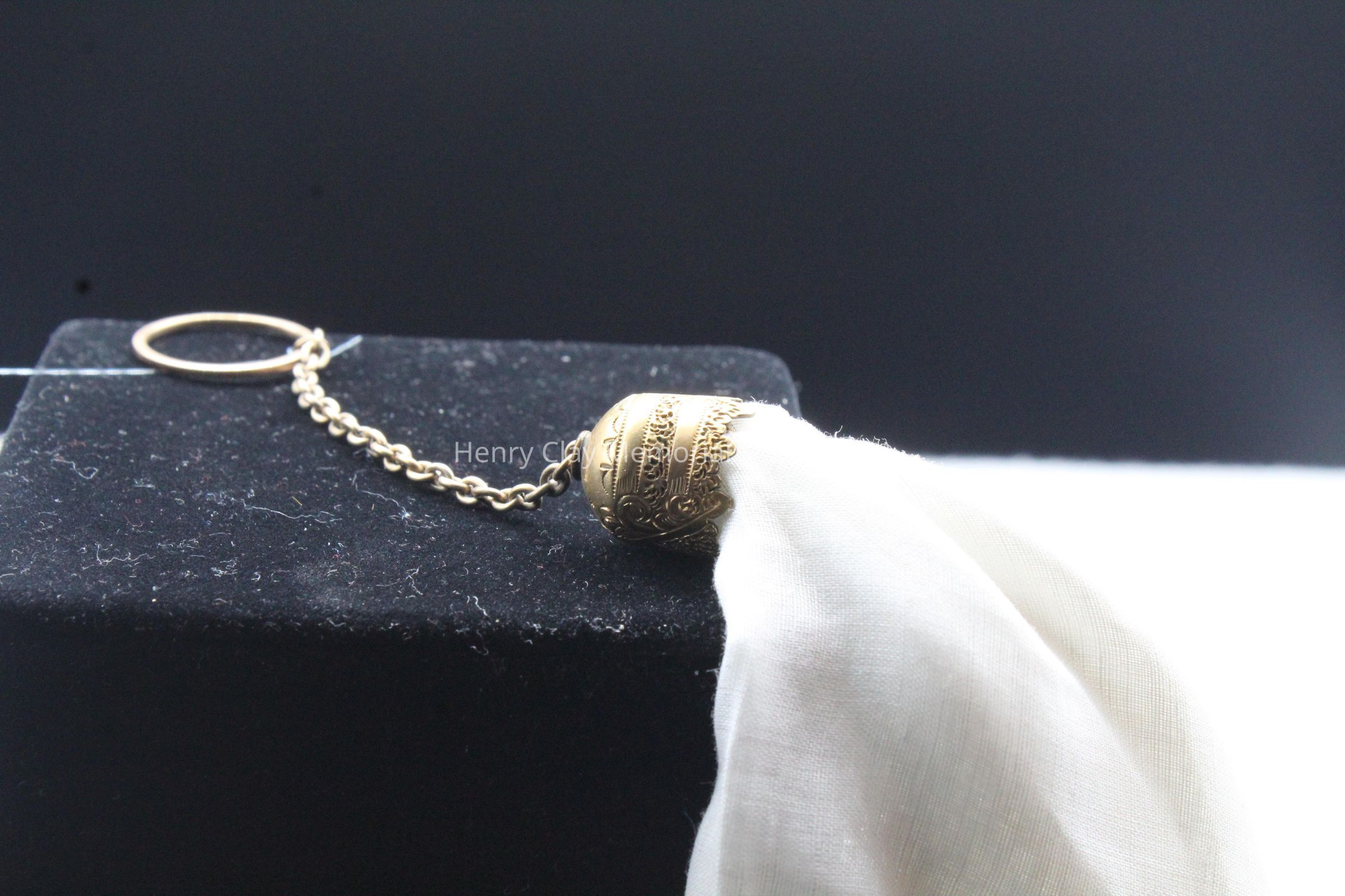 This holder is made of gold and has a bell shaped piece through which a chain terminating in a gold ring passes. The chain is looped around a corner of the handkerchied and then pulled into the cup to secure it.