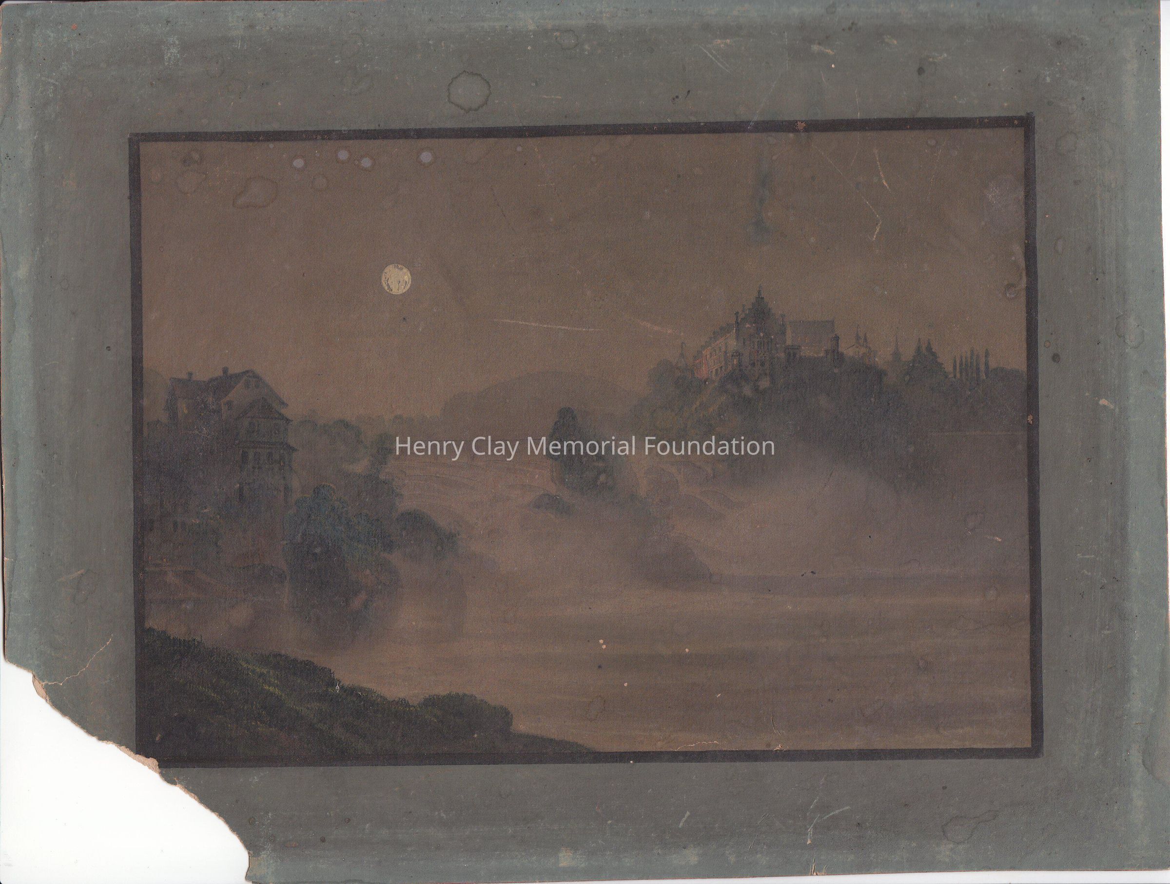 A drawing depicting two buildings on opposing side cliffs. Building on the left is smaller and less elaborate. The one on the right is very elaborate, almost look like a castle. Between them a river with a waterfall.
