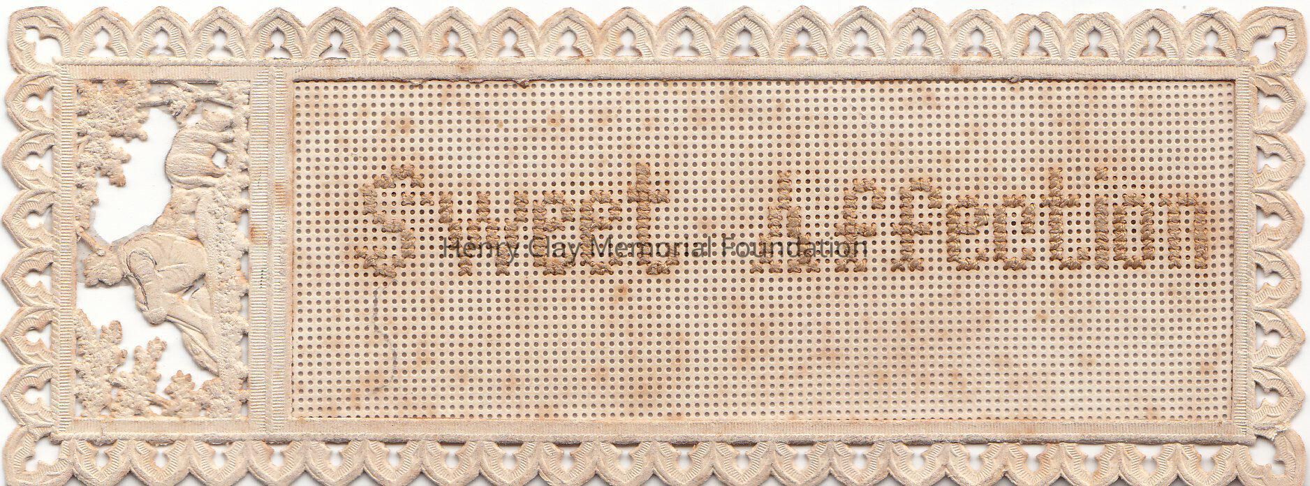 In the middle of the book mark in pink threat cross stitched "Sweet Affection"
