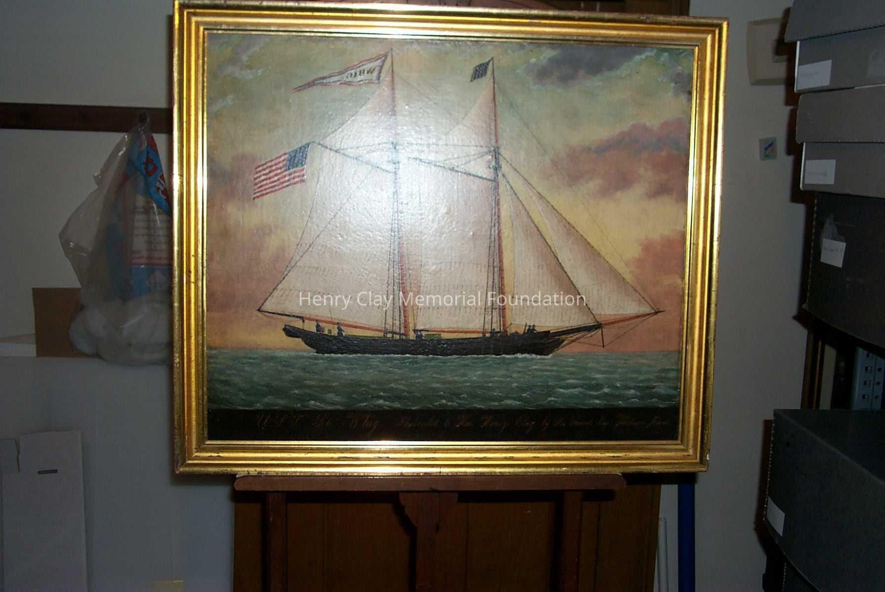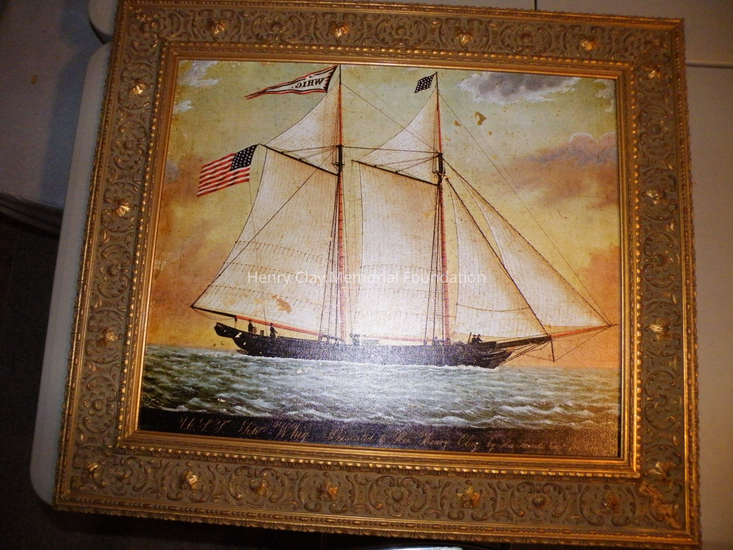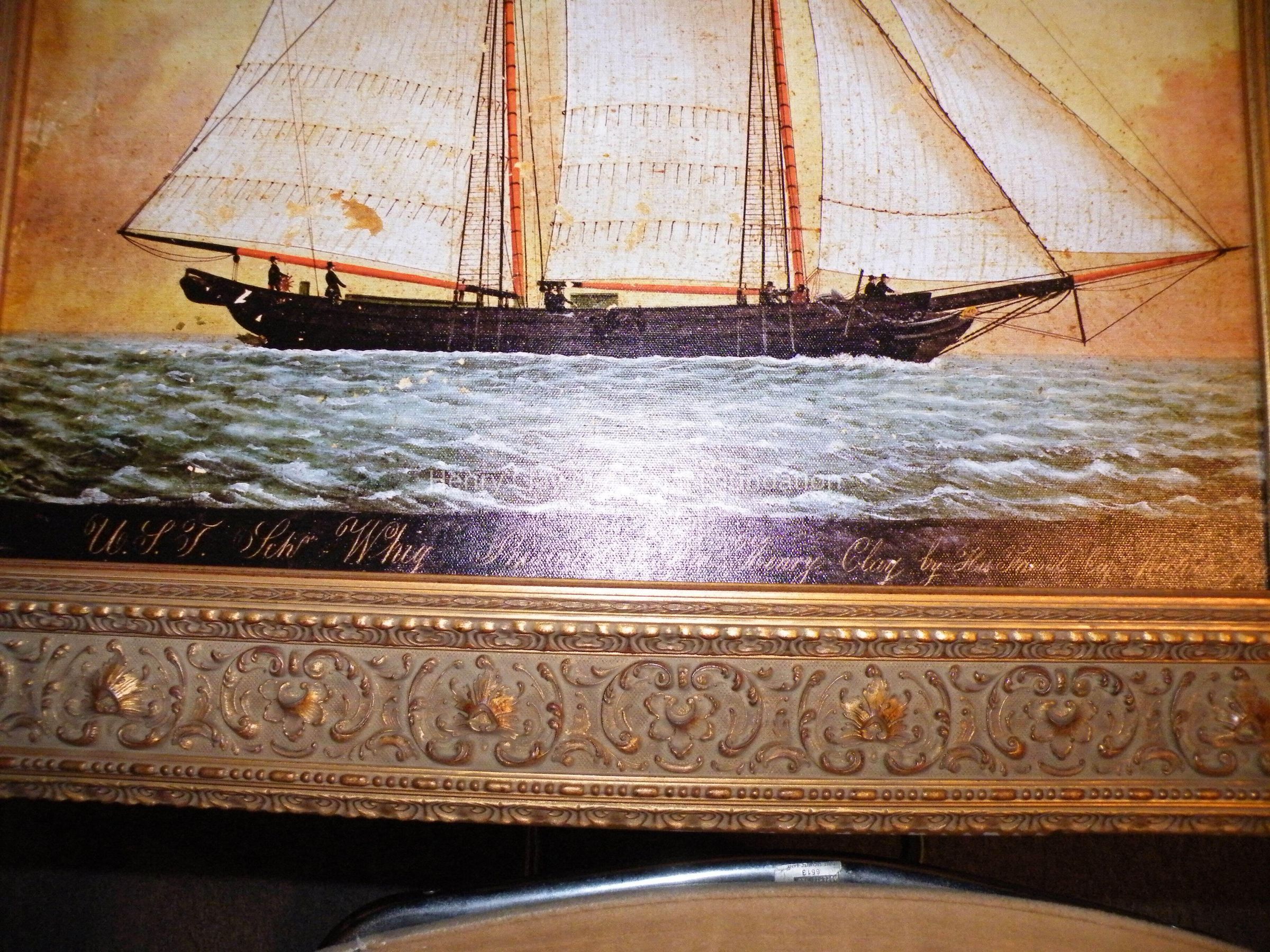One giclee print on canvas of a painting of a sailing ship. The ship is at full sail and sailing in mildy choppy seas. The ship has six white sails and the hull is black. There are two masts and three pennants flying: the US flag, a white pennant whi red and blue stripes at the borders reading "Whig", and a blue flag with white stars (from stern to bow). There is a sailor at the wheel of the vessel at the stern and another right in front of him. There are two sailors at midship and three at the bow. At the bottom of the painting is a black band on which is written in gold letters "U.S.T Sch. Whig Presented to Hon. Henry Clay by his friend Capt. William Jones". The print is framed in an ornate gold frame with heavy floral designs and a raised inner gold frame. It is designed to look like an antique gilt frame.Dimensions