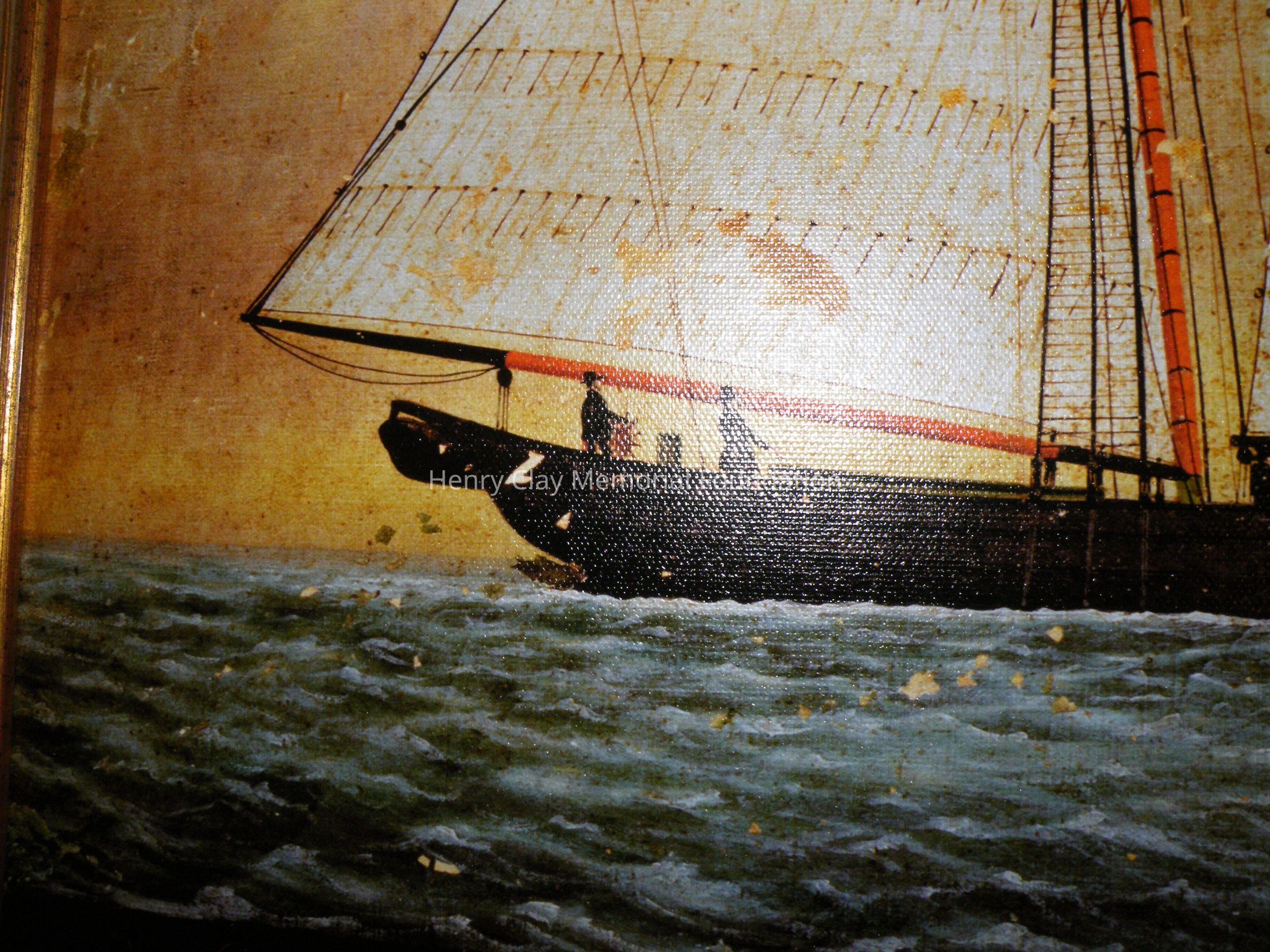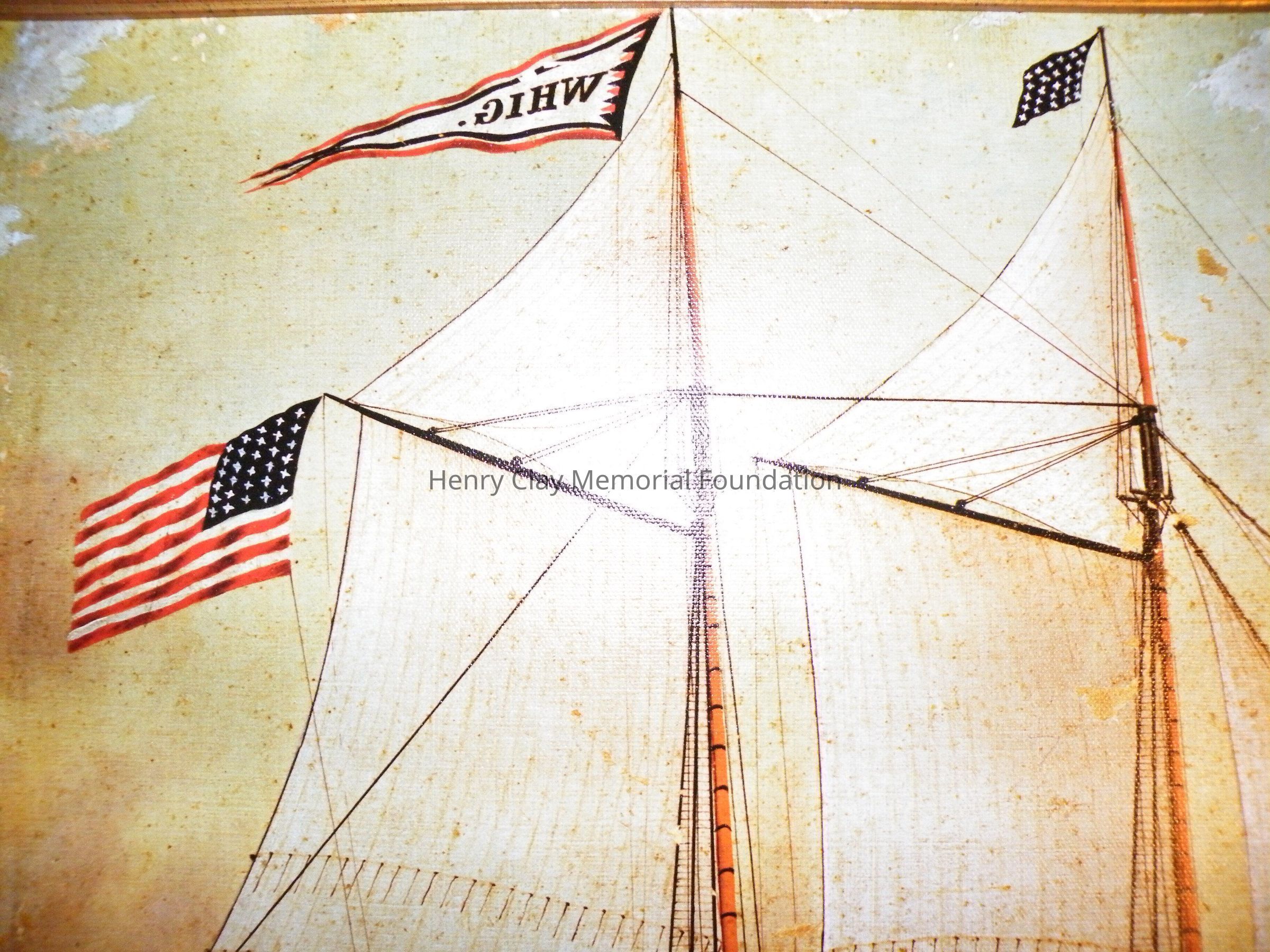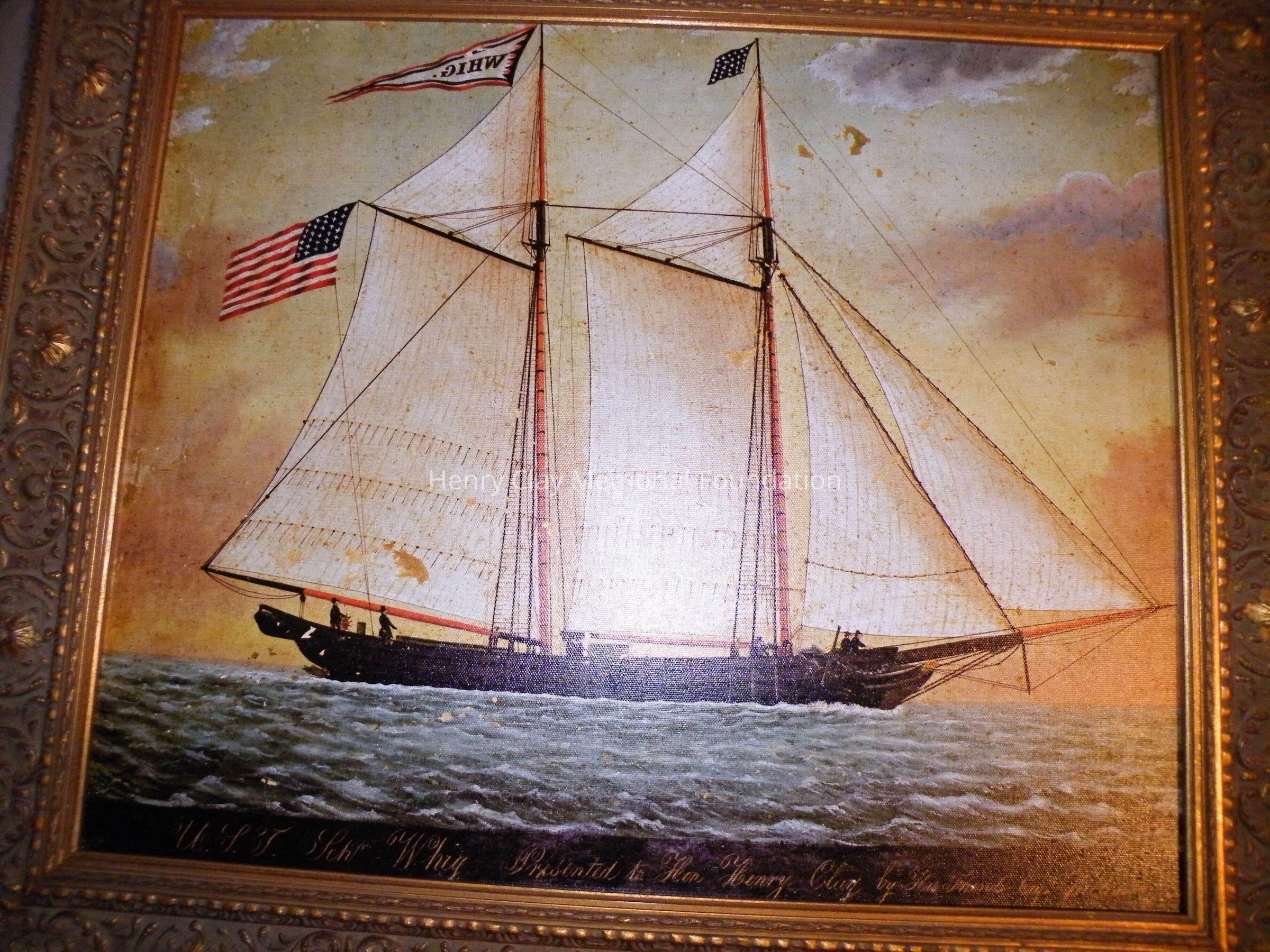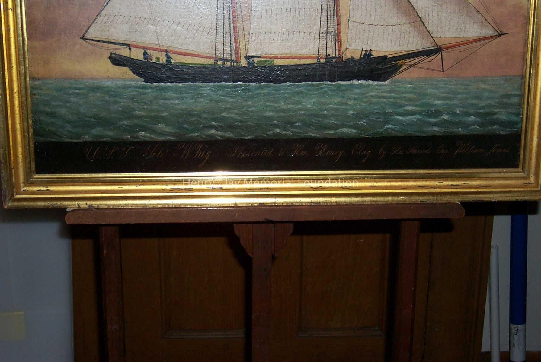 One giclee print on canvas of a painting of a sailing ship. The ship is at full sail and sailing in mildy choppy seas. The ship has six white sails and the hull is black. There are two masts and three pennants flying: the US flag, a white pennant whi red and blue stripes at the borders reading "Whig", and a blue flag with white stars (from stern to bow). There is a sailor at the wheel of the vessel at the stern and another right in front of him. There are two sailors at midship and three at the bow. At the bottom of the painting is a black band on which is written in gold letters "U.S.T Sch. Whig Presented to Hon. Henry Clay by his friend Capt. William Jones". The print is framed in an ornate gold frame with heavy floral designs and a raised inner gold frame. It is designed to look like an antique gilt frame.Dimensions