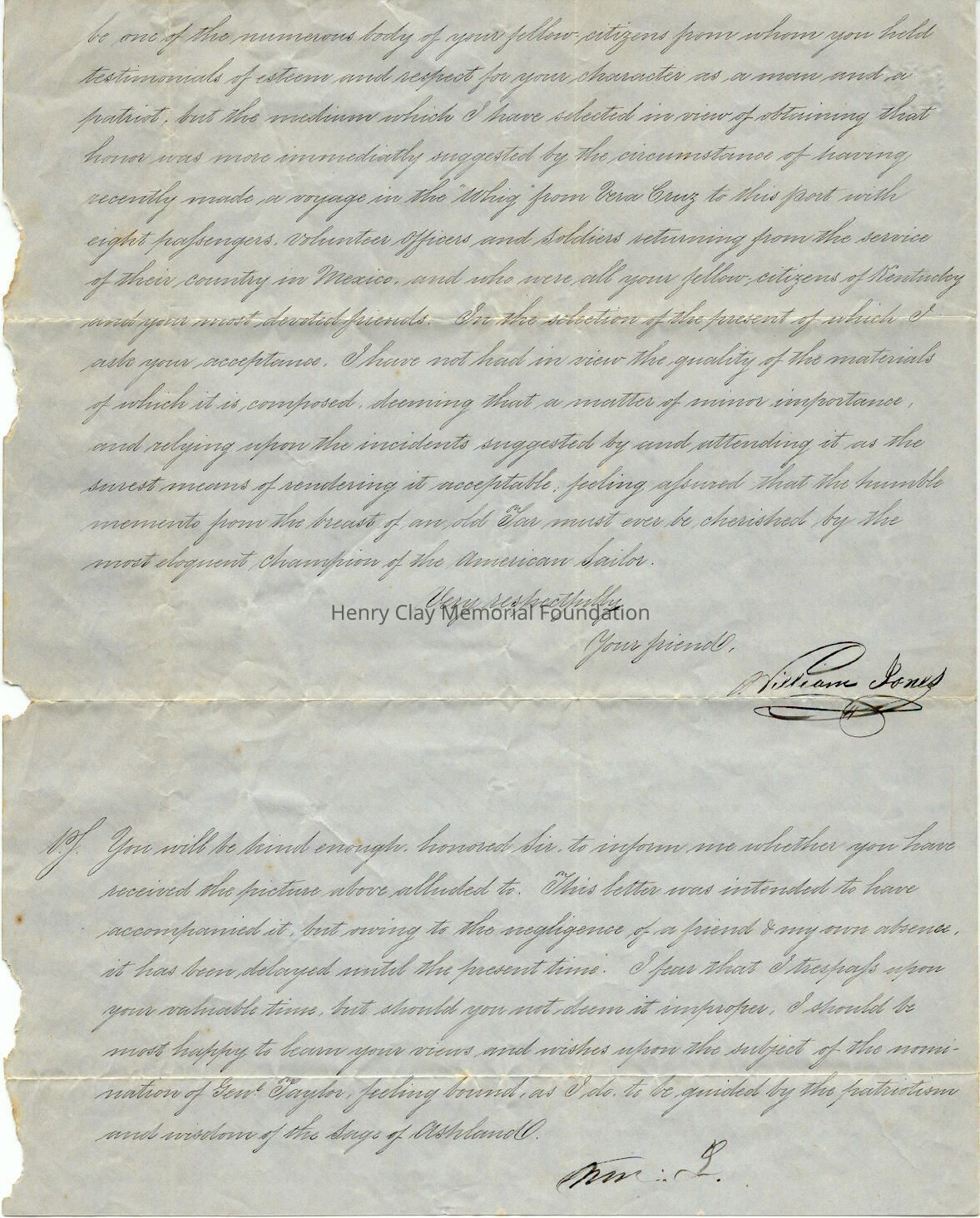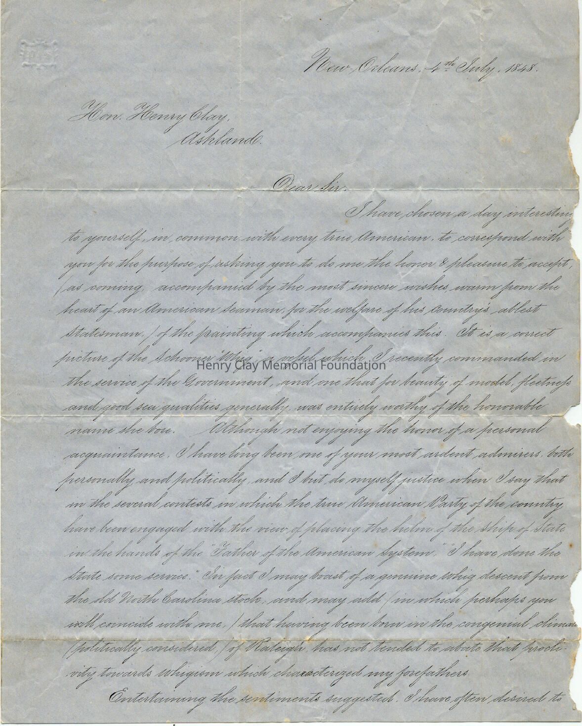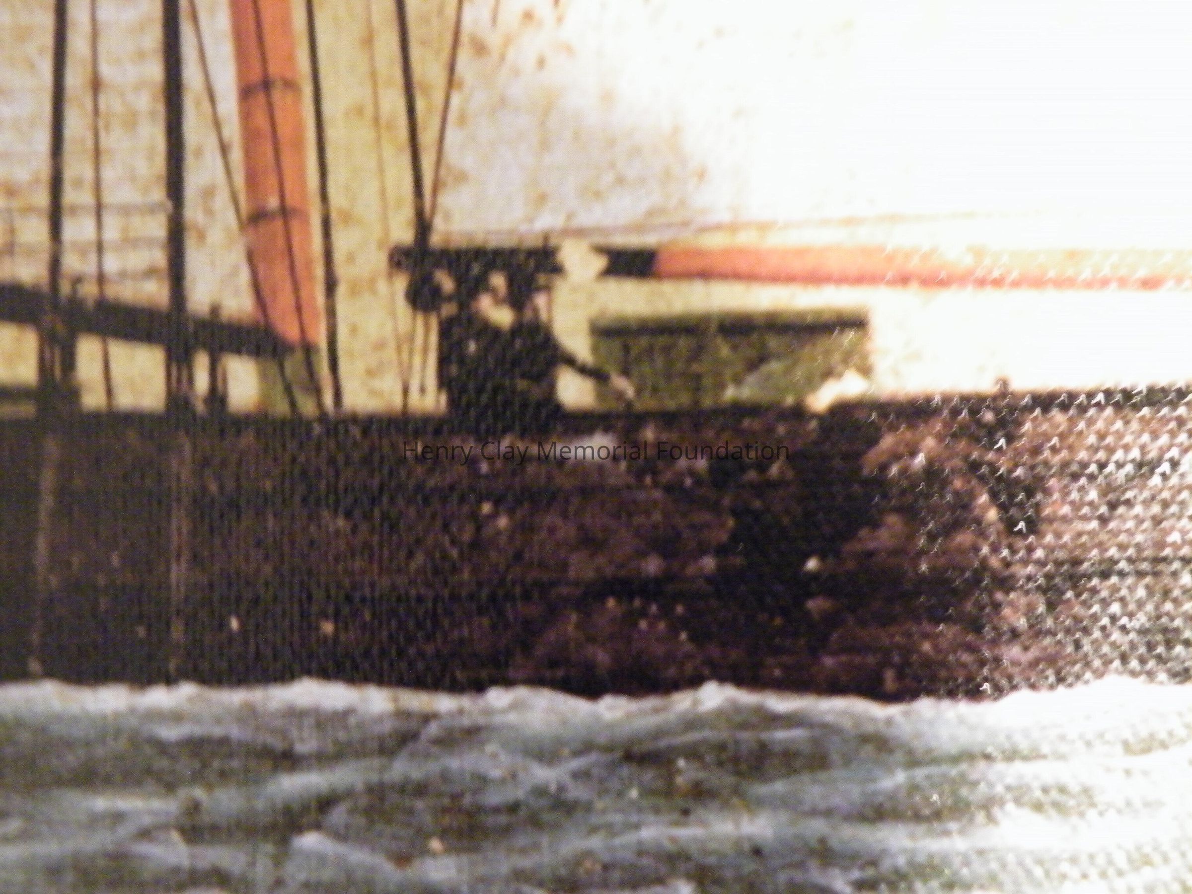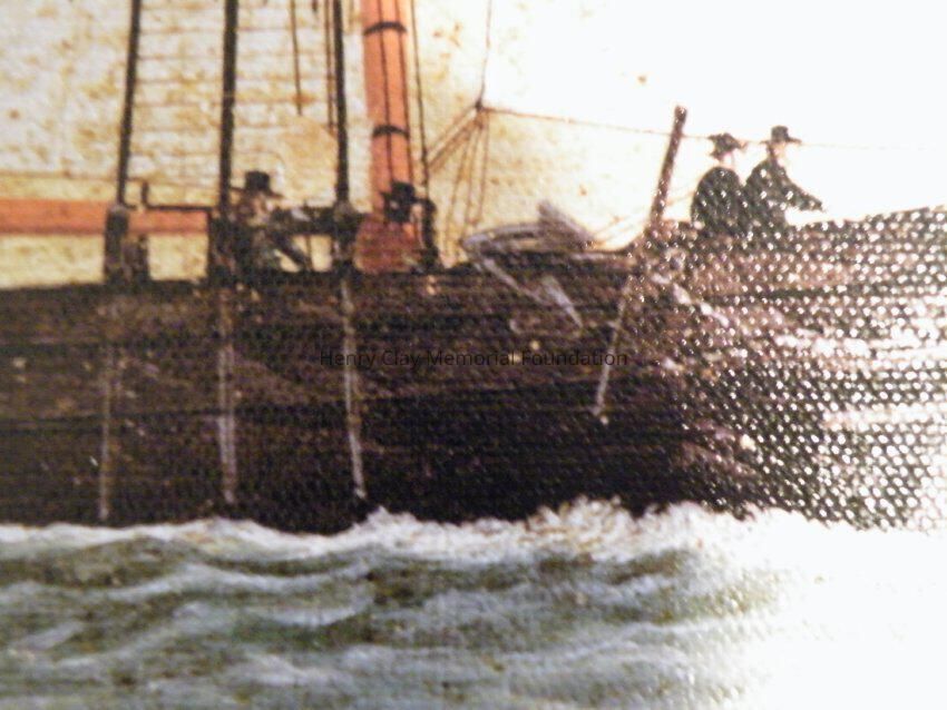 One giclee print on canvas of a painting of a sailing ship. The ship is at full sail and sailing in mildy choppy seas. The ship has six white sails and the hull is black. There are two masts and three pennants flying: the US flag, a white pennant whi red and blue stripes at the borders reading "Whig", and a blue flag with white stars (from stern to bow). There is a sailor at the wheel of the vessel at the stern and another right in front of him. There are two sailors at midship and three at the bow. At the bottom of the painting is a black band on which is written in gold letters "U.S.T Sch. Whig Presented to Hon. Henry Clay by his friend Capt. William Jones". The print is framed in an ornate gold frame with heavy floral designs and a raised inner gold frame. It is designed to look like an antique gilt frame.Dimensions