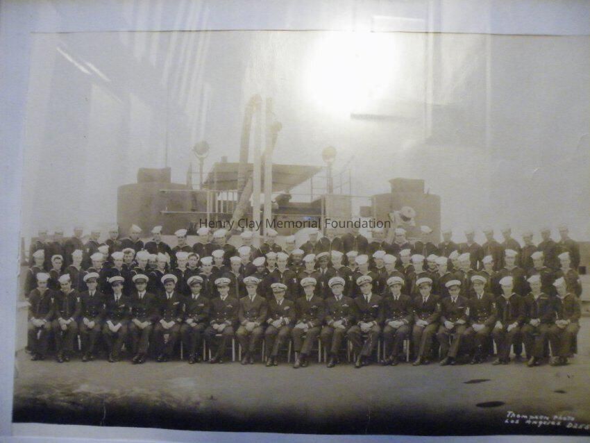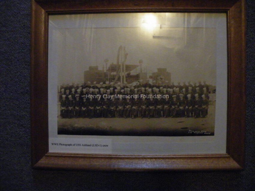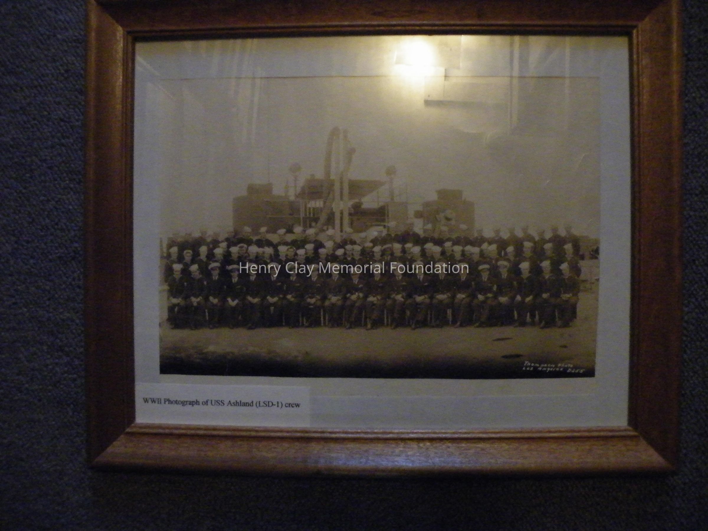 One photo of USS Ashland WWII Crew Framed. 83 men are photographed. The picture is framed in a wooden frame. The picture is sepia toned, but was probably one black and white and has discolored with age. The men stand in front of machinery in about 3 long rows. The picture has a note written in white in the bottom right corner that says, "Thompson Photo Los Angeles D255". There is a printed note added into the frame in the bottom left corner that says, "WWII Photograph of USS Ashland (LSD-1) crew". The white border between the frame and the photo was seemingly cut by hand.Dimensions