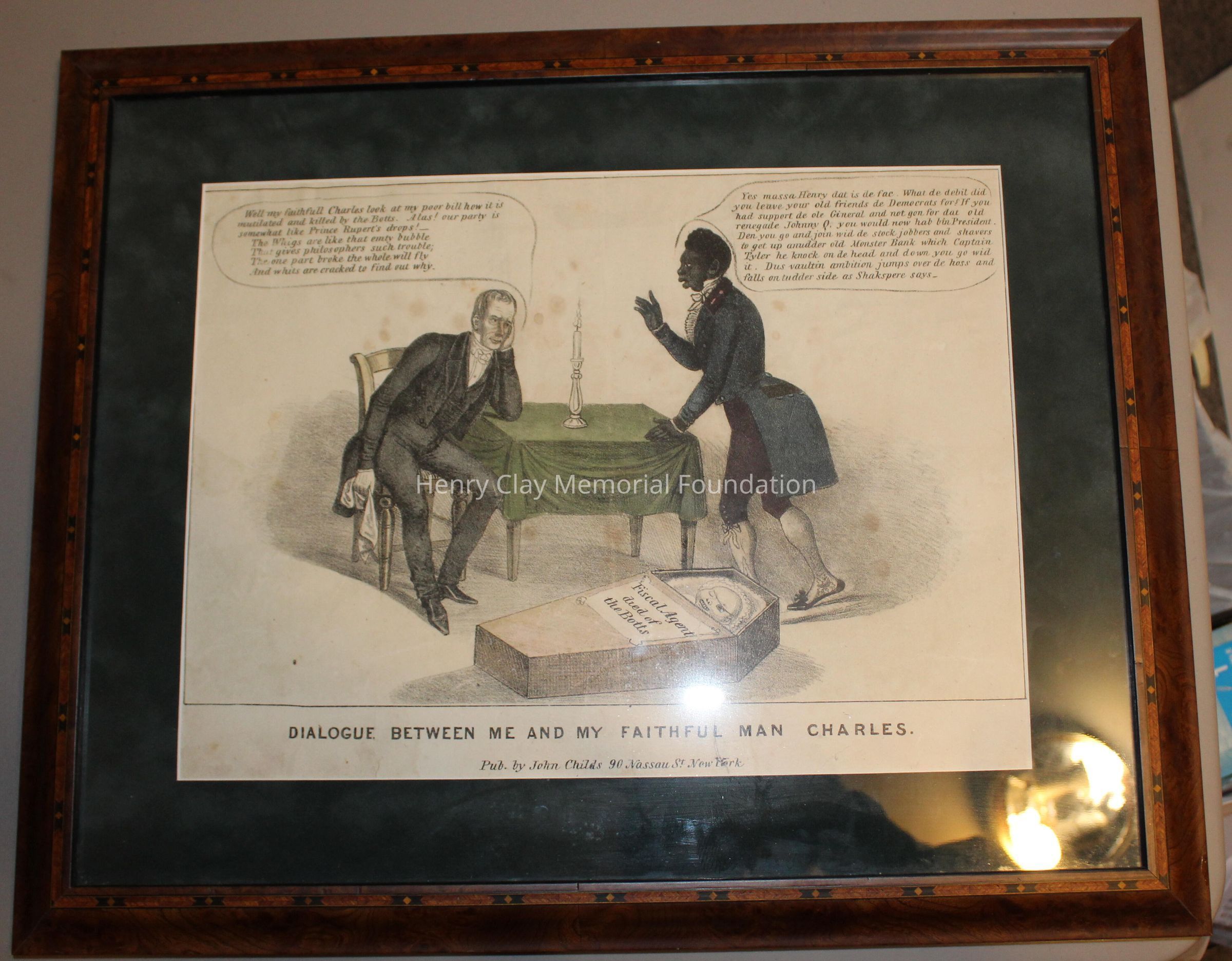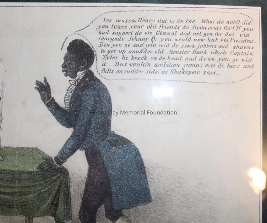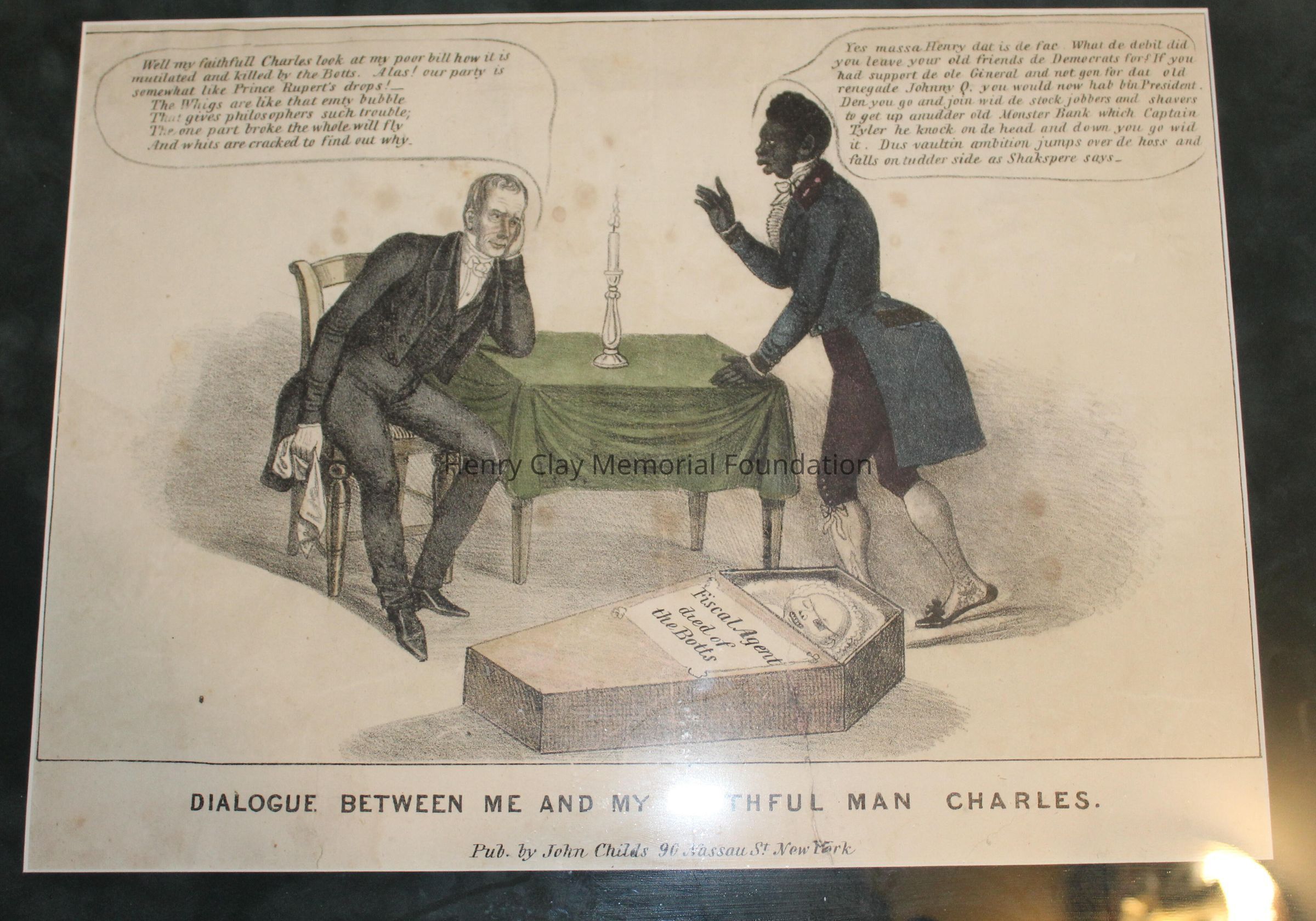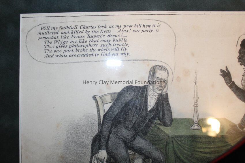 1 political cartoon depicting a grossly exaggerated racially caricatured African American and Henry Clay conversing around a table with a candle in the middle of it.. Henry Clay is saying "Well my faithfull Charles look at poor bill how it is mutilated and killed by the Botts. Alas! our party is somewhat like Prince Rupert's Drops! The Whigs are like that empty bubble that gives philospohers such trouble; the one part broke the whole will fly And whits are cracked to find out why." The African American in this cartoon replies in Negro dialect, "yes massa Henry Clay dat is de fac. what de debit you leave your old friends de Deomcrats for? If you had support de ole General and not the renegade Johnny Q. you would now hab bin President. en you go and join wid de stock jobbers and sharers to get up anudder old Monster Bank which Captain Tyler he knock on de head and down you go wid it. Dus vaultin ambition jumps over de hoss and falls on tudder side as Shakspere says."