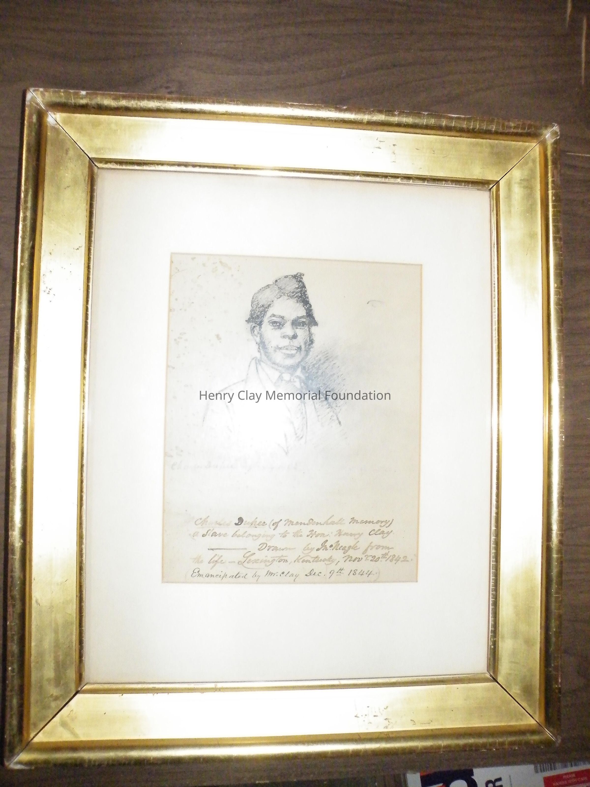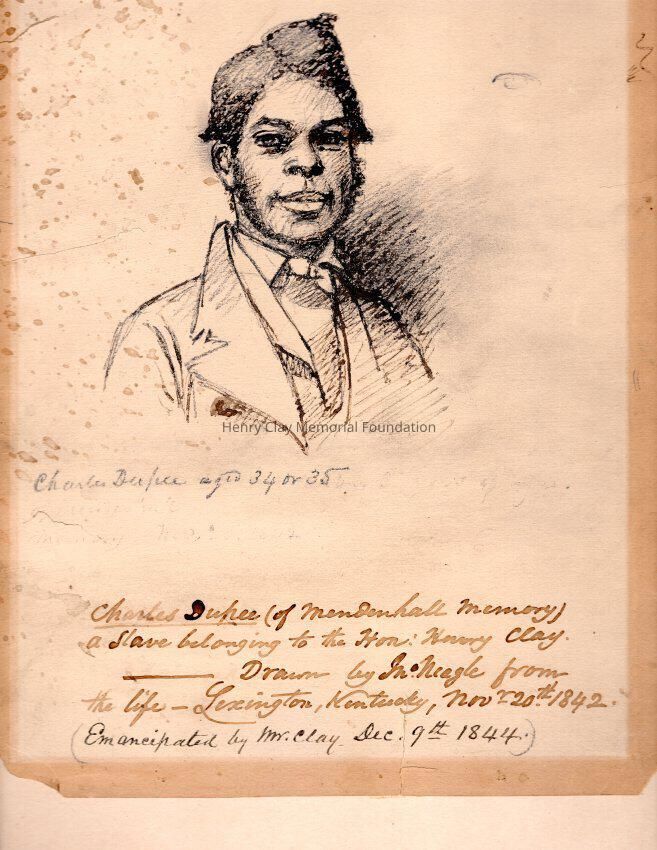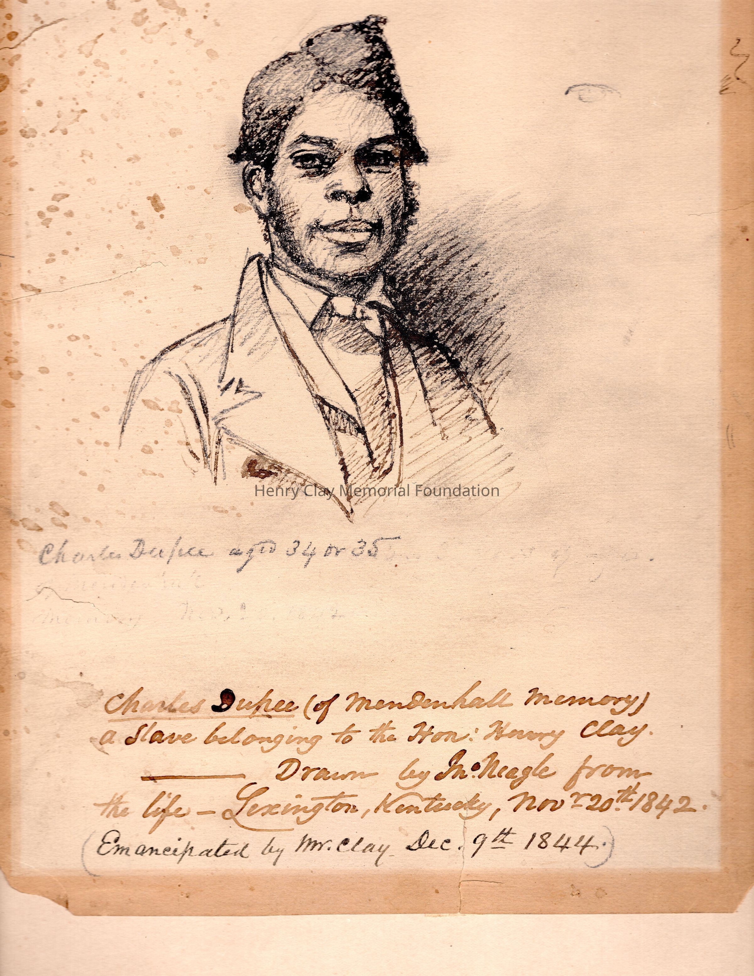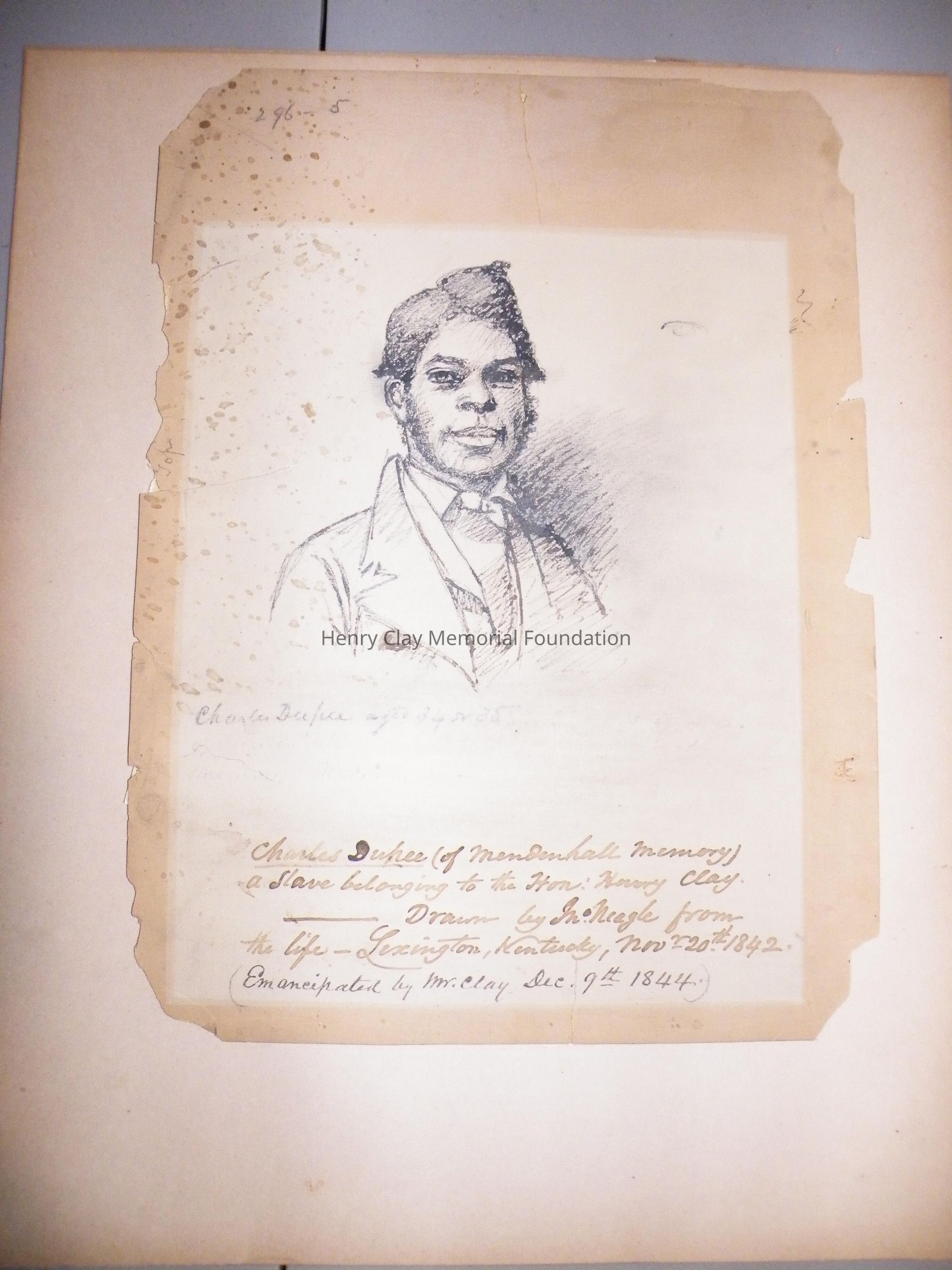 Drawing of African American man. Hair is parted on his right and comes to a peak over his left eye. He has a full face. He is wearing a shirt, tie, and coat. Beneath the drawing is an inscription in pencil reading "Charles Dupee aged 34 or 35". About 2 inches below the drawing is an inscription in ink reading "Charles Dupee (of Mendenhall Memory) a slave belonging to the Hon. Henry Clay --- drawn by Jno. Neagle from the life -- Lexington, Kentucky, Nov. 20th 1842." Beneath that in ink is another line, "(Emancipated by Mr. Clay Dec. 9th 1844)".Dimensions
