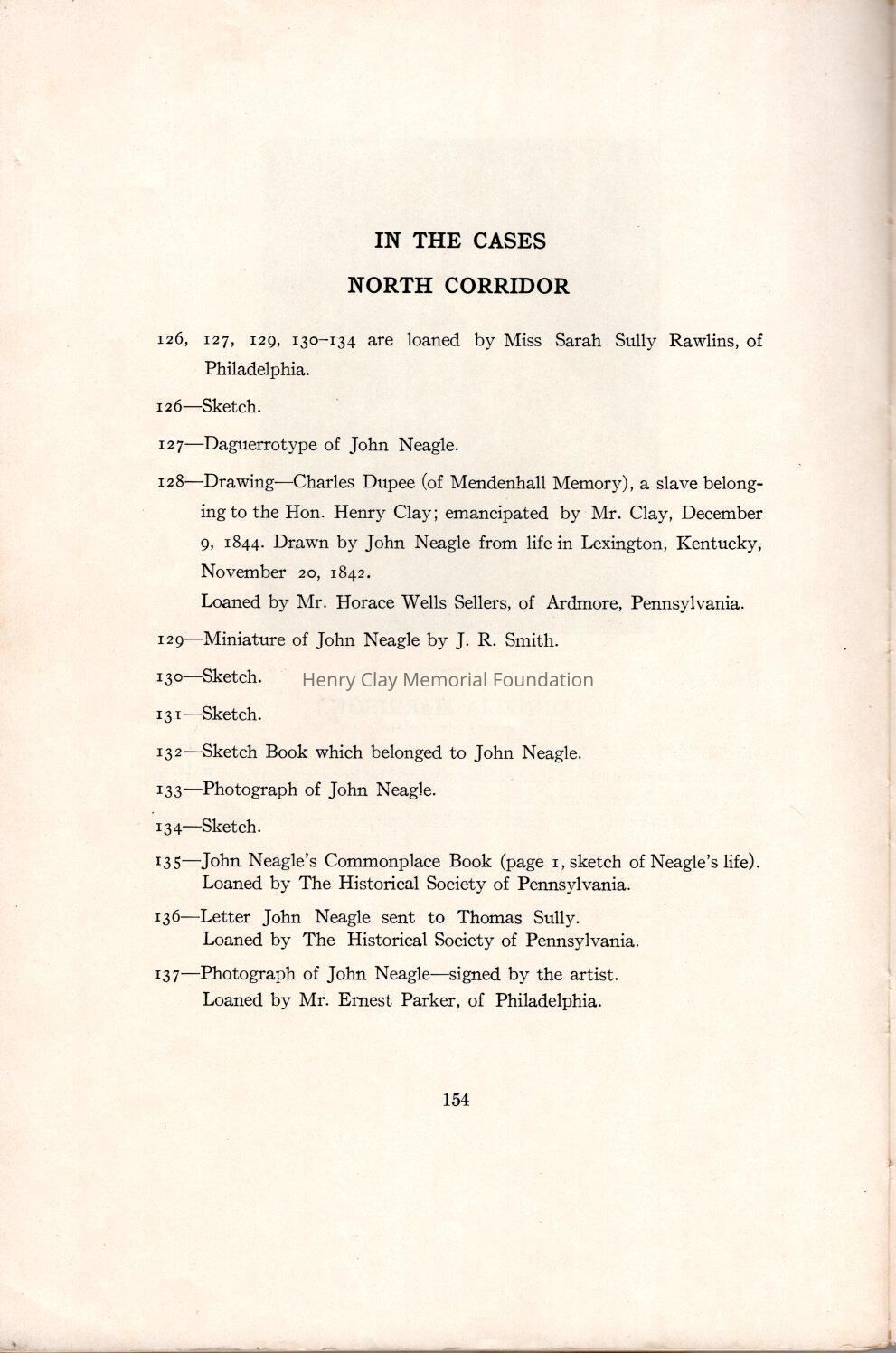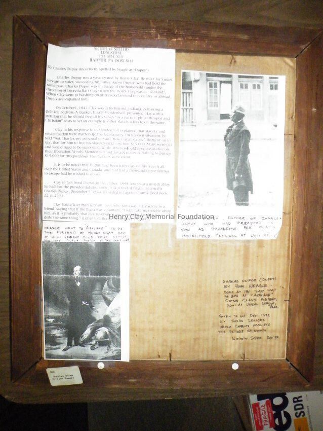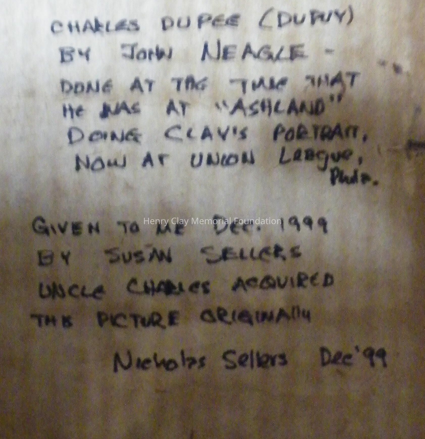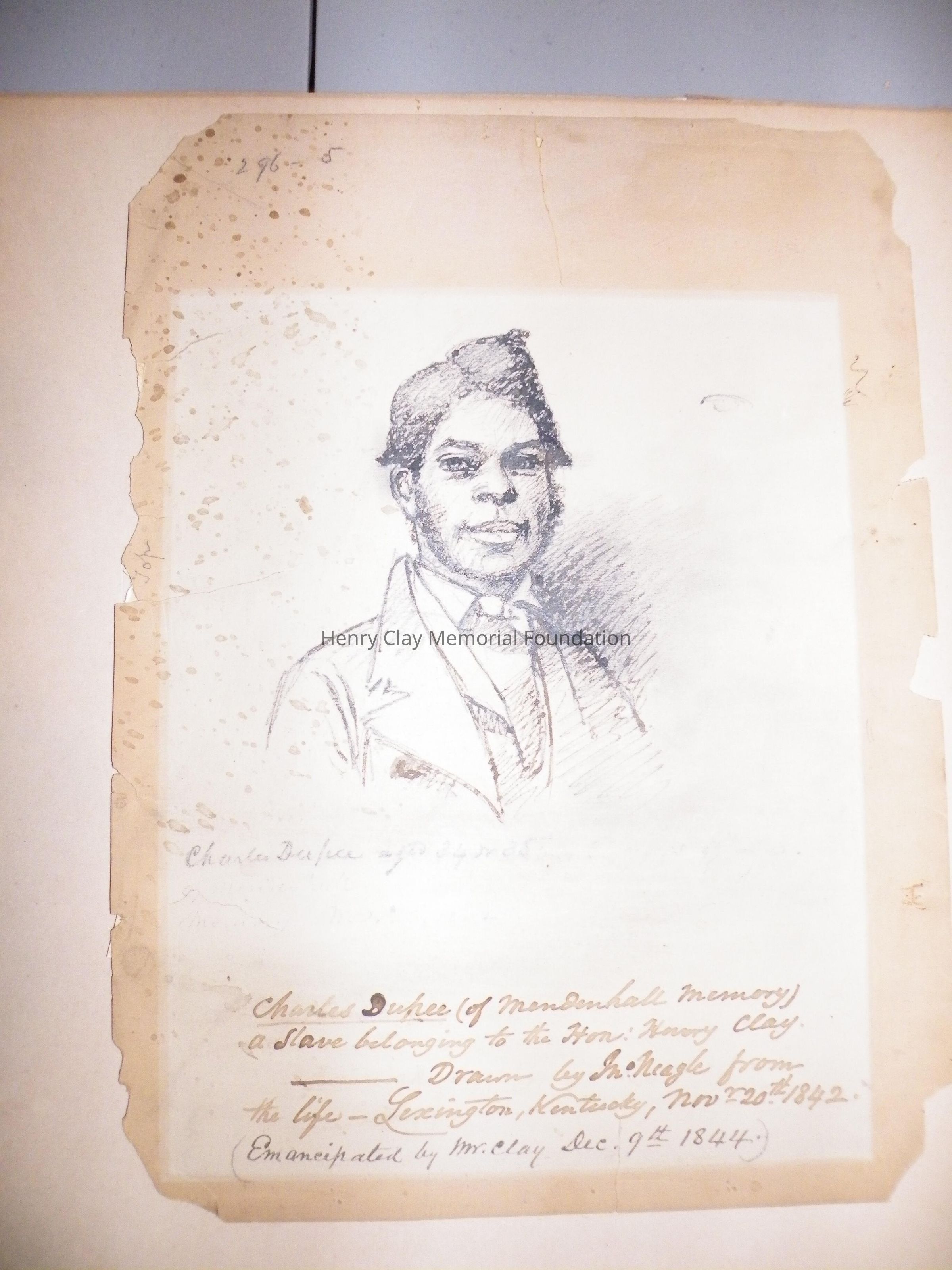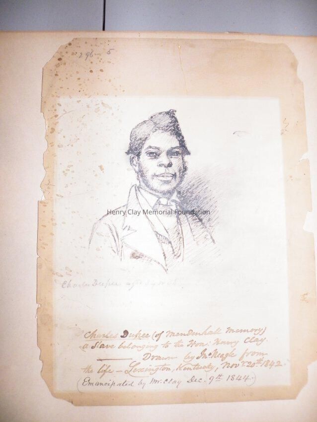 Drawing of African American man. Hair is parted on his right and comes to a peak over his left eye. He has a full face. He is wearing a shirt, tie, and coat. Beneath the drawing is an inscription in pencil reading "Charles Dupee aged 34 or 35". About 2 inches below the drawing is an inscription in ink reading "Charles Dupee (of Mendenhall Memory) a slave belonging to the Hon. Henry Clay --- drawn by Jno. Neagle from the life -- Lexington, Kentucky, Nov. 20th 1842." Beneath that in ink is another line, "(Emancipated by Mr. Clay Dec. 9th 1844)".Dimensions