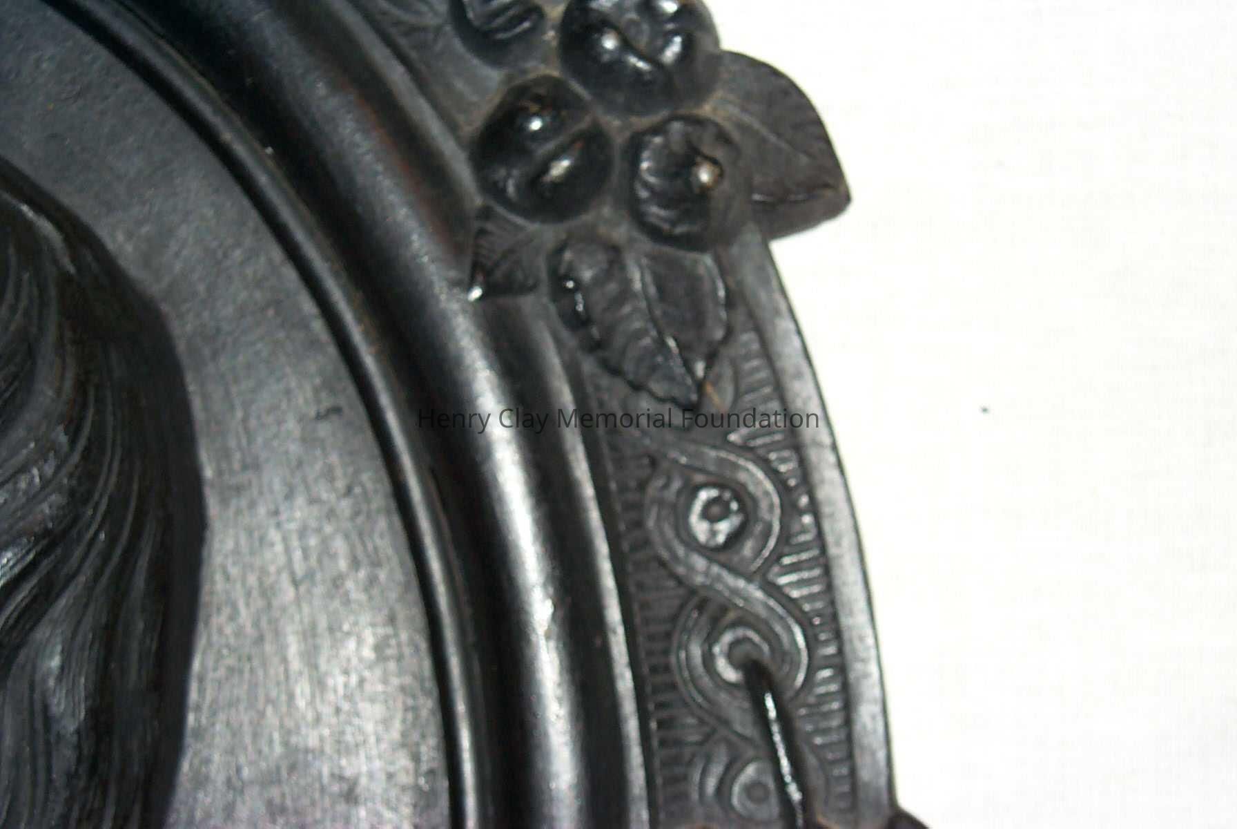A cast iron plaque showing the bust image of Hery Clay. Image is left profile. Below image is inscription that reads: "From Cos. Art Association." To right of image is the inscription: "C.Muller. 1856." On bottom of neck of bust is the inscription: "Clay." Bust is framed with band inscribed with knot work and bearing faces of men at top and bottom, clusters of roses at right and left, and clusters of apples in between. Piece is mounted to hange with wire on back.Dimensions