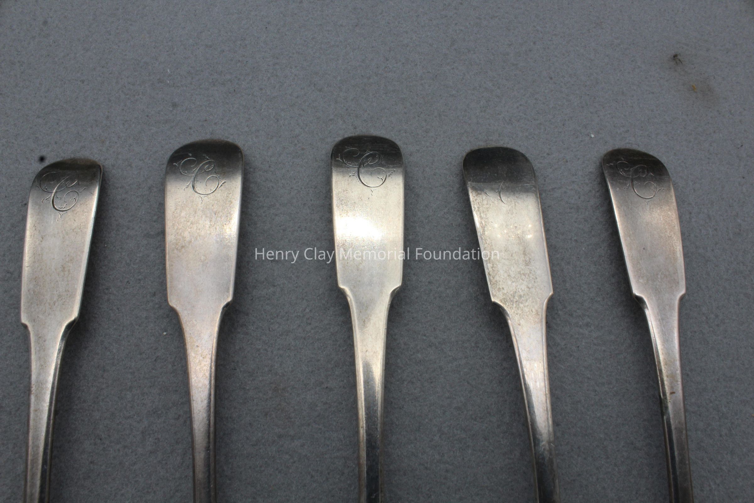 Set of five coin silver dinner forks. Each has 4 tines and a rounded rectangualr end monogrrammed with the letter "C". Each has the CA Burnett maker's mark on the reverse.Dimensions