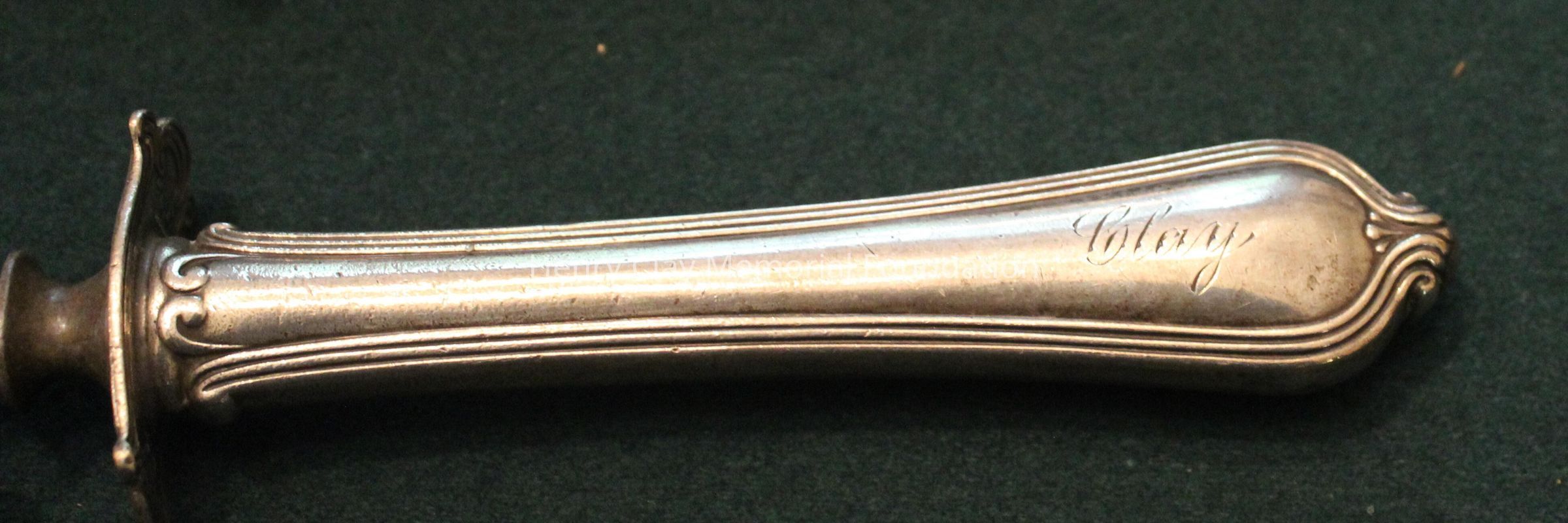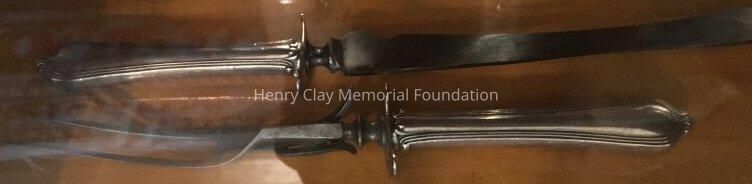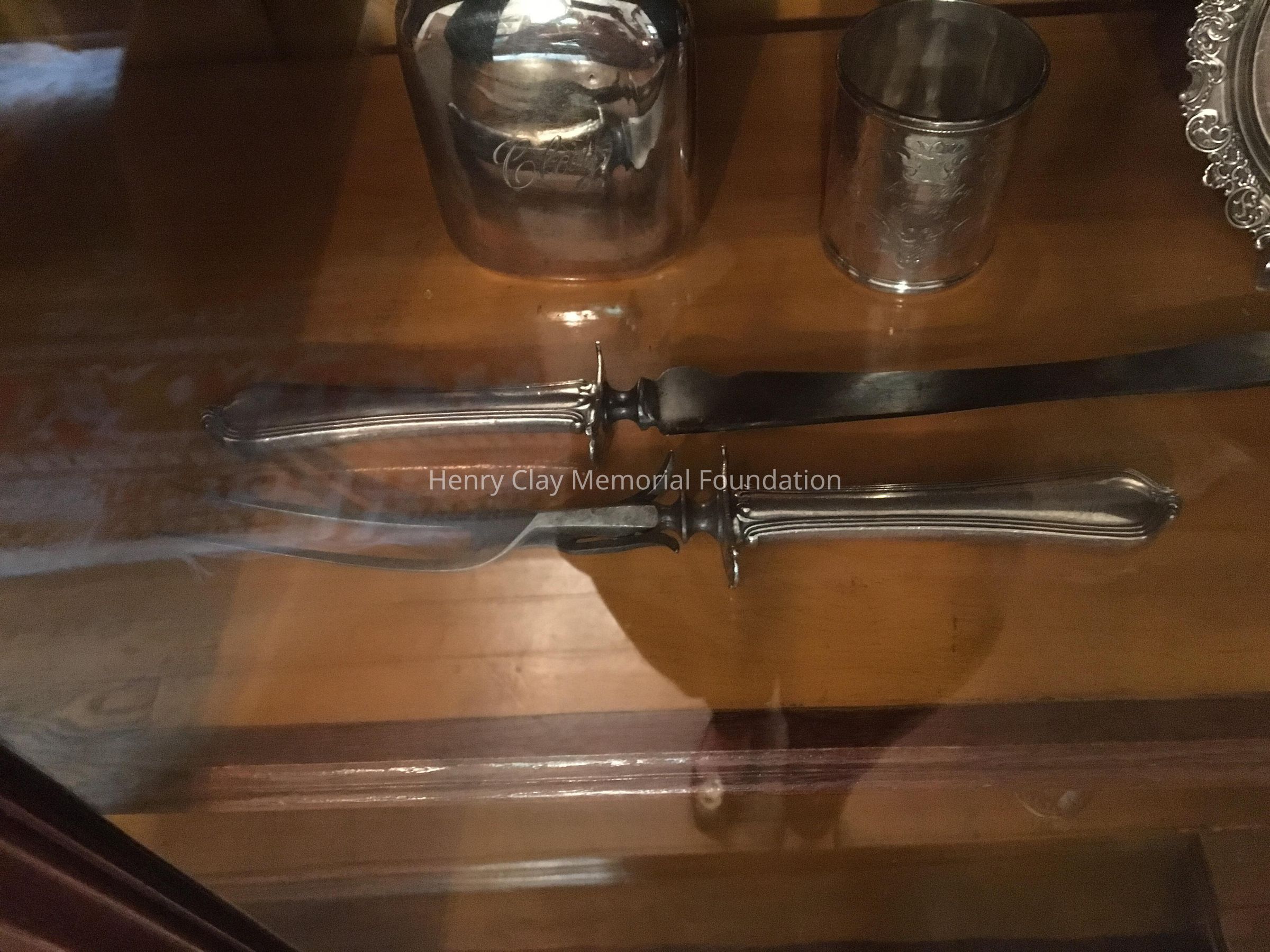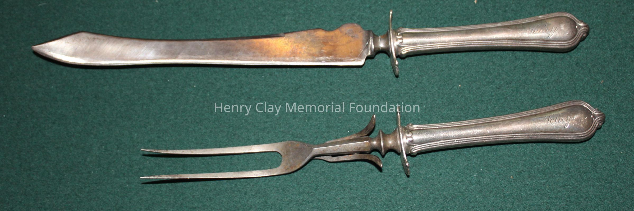 Large clip point knife and fork with rest stand attached. Both have silver handles and probably steel blades. fork has two tines. Both pieces are engraved on the handle with the name Clay in cursive script.