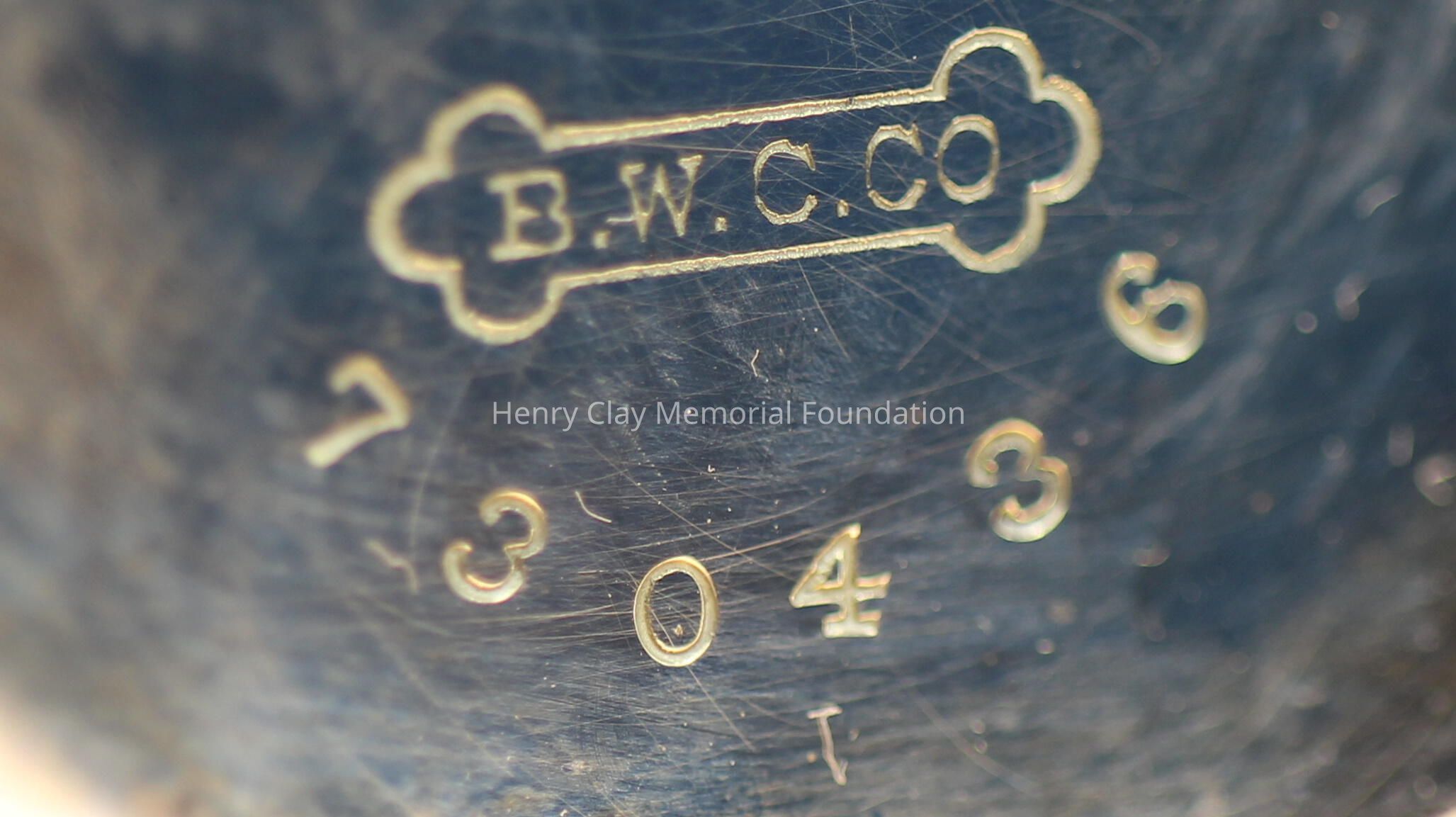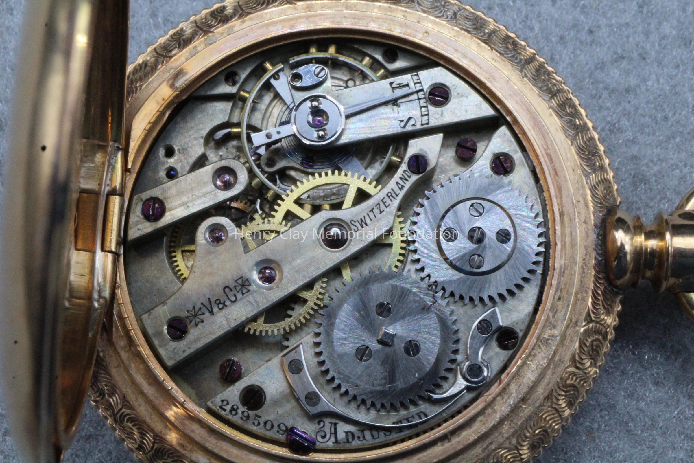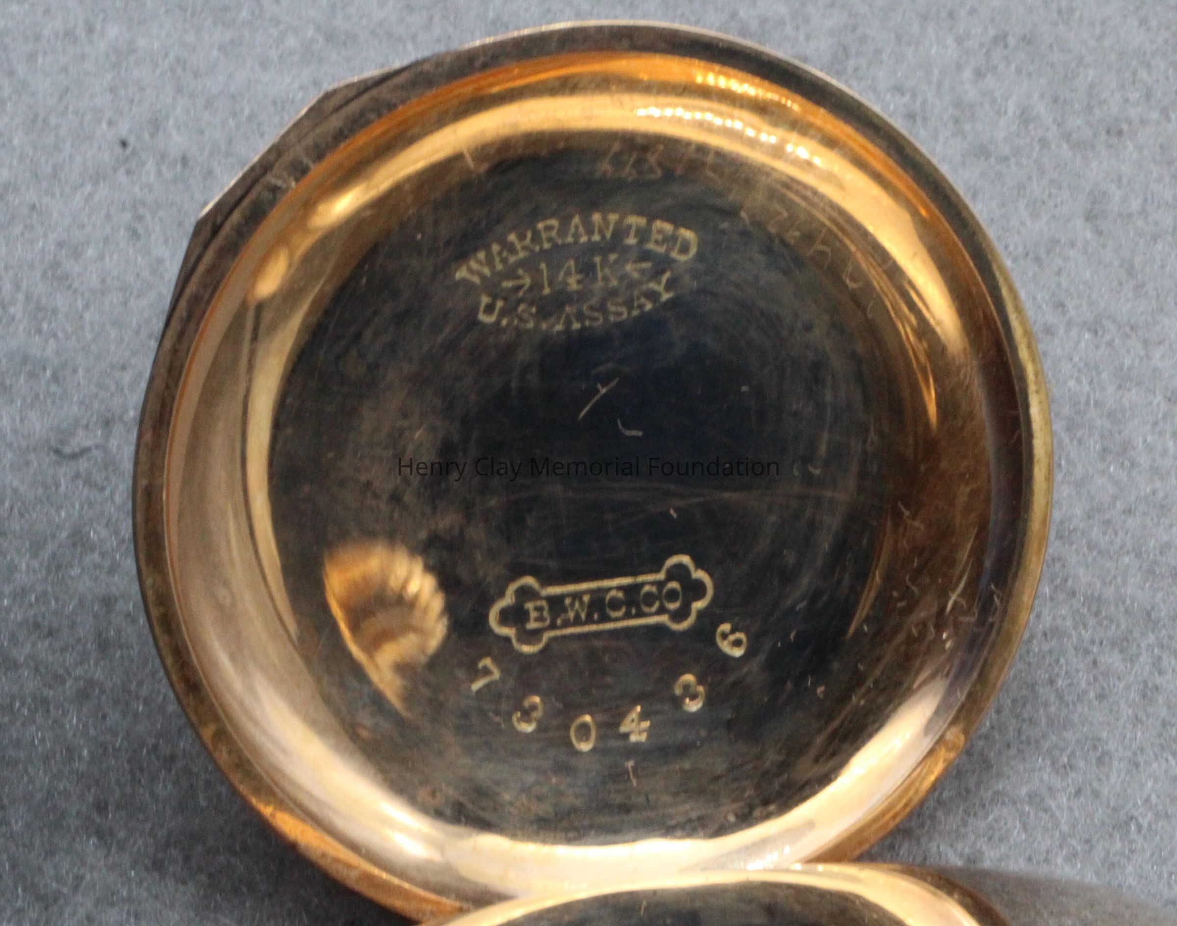Gold stem wind pocket watch with white face. Hour numerals are black with numerals for minutes around the outside in blue. There is a small seconds dial at bottom center. Marked "WE Day Lexington KY at top center. Case is engine turned around edge. Back s engraved with the initials "JRC". Inside of back case cover is stampes "Warranted 14k US Assay" and "B.W.C. Co. 730436. Works are stamped "V&C Switzerland" and "289509 Adjust".