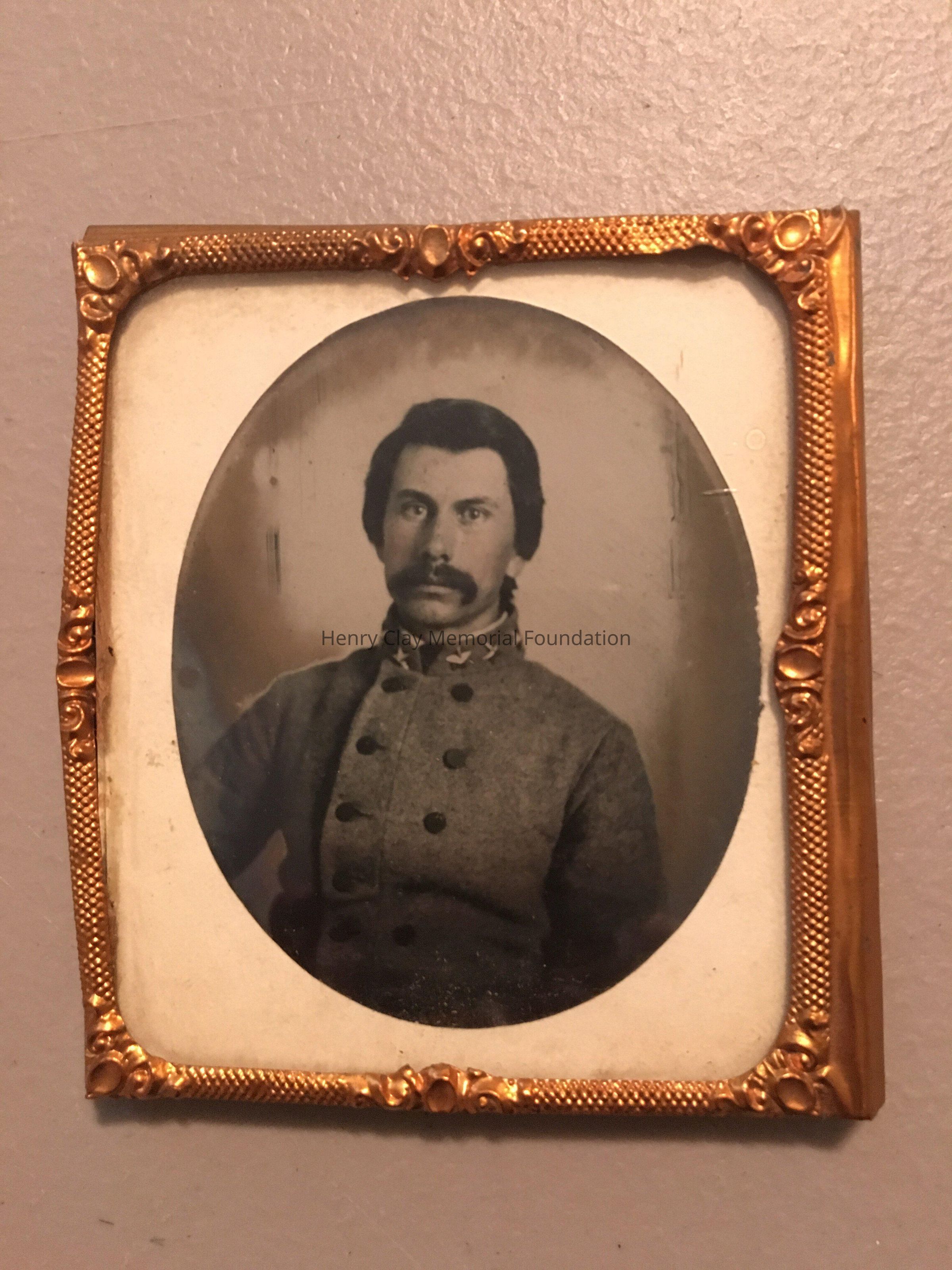 Ambrotype of Andrew Eugene Erwin in Confederate dress uniform. The jacket he is wearing is double breasted and has three stars on the collar indicating his rank of Colonel. The image is mounted under a white glass mat in a brass frame. There is no case for the image