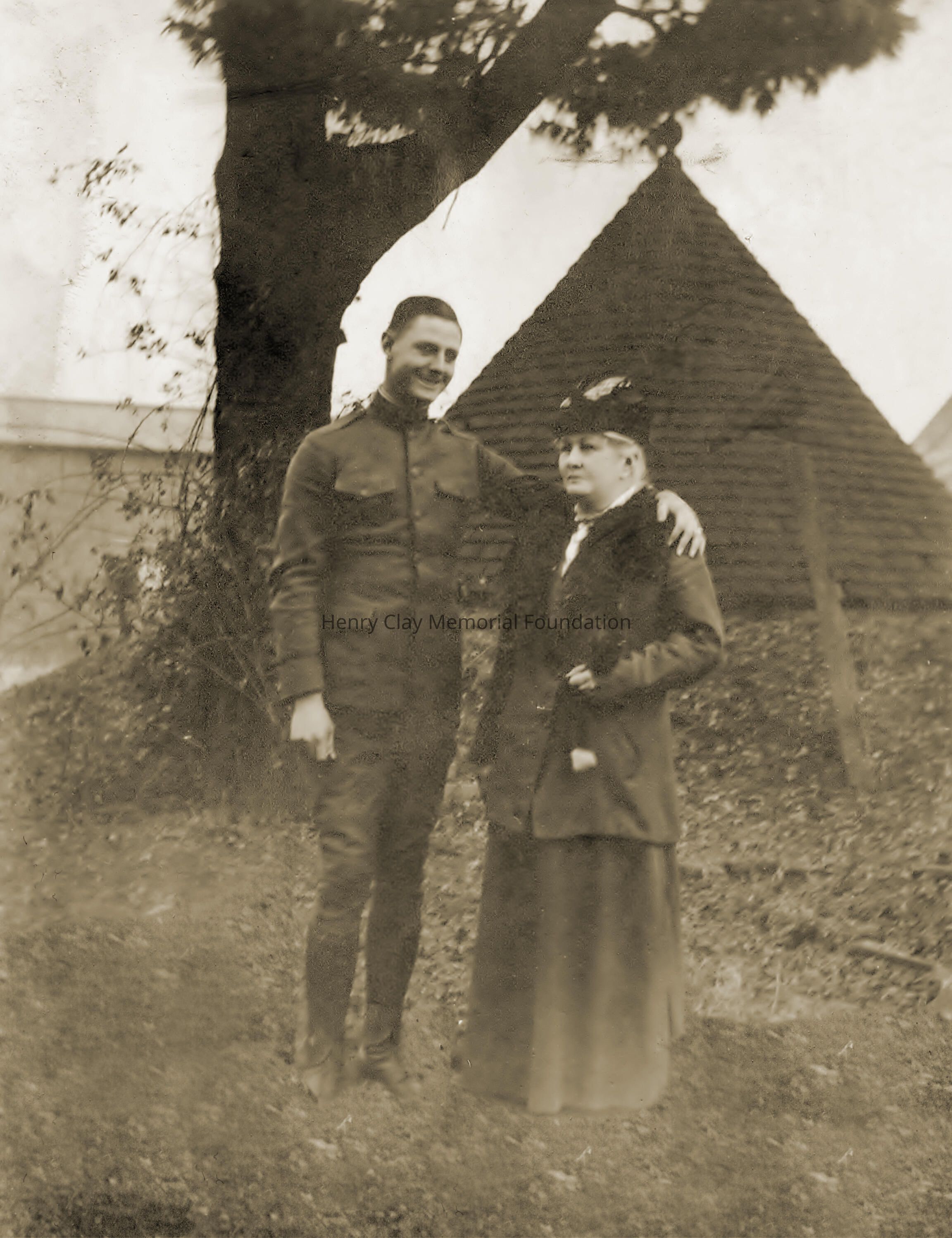 Photograph of man in military uniform and woman in in dark jacket and suit and hat with the Ice house of Ashland in the background. The photograph is in a very elaborate gold gilt gessoed frame. The man has his hand on th woman's shoulder. She is much older than he is.Dimensions