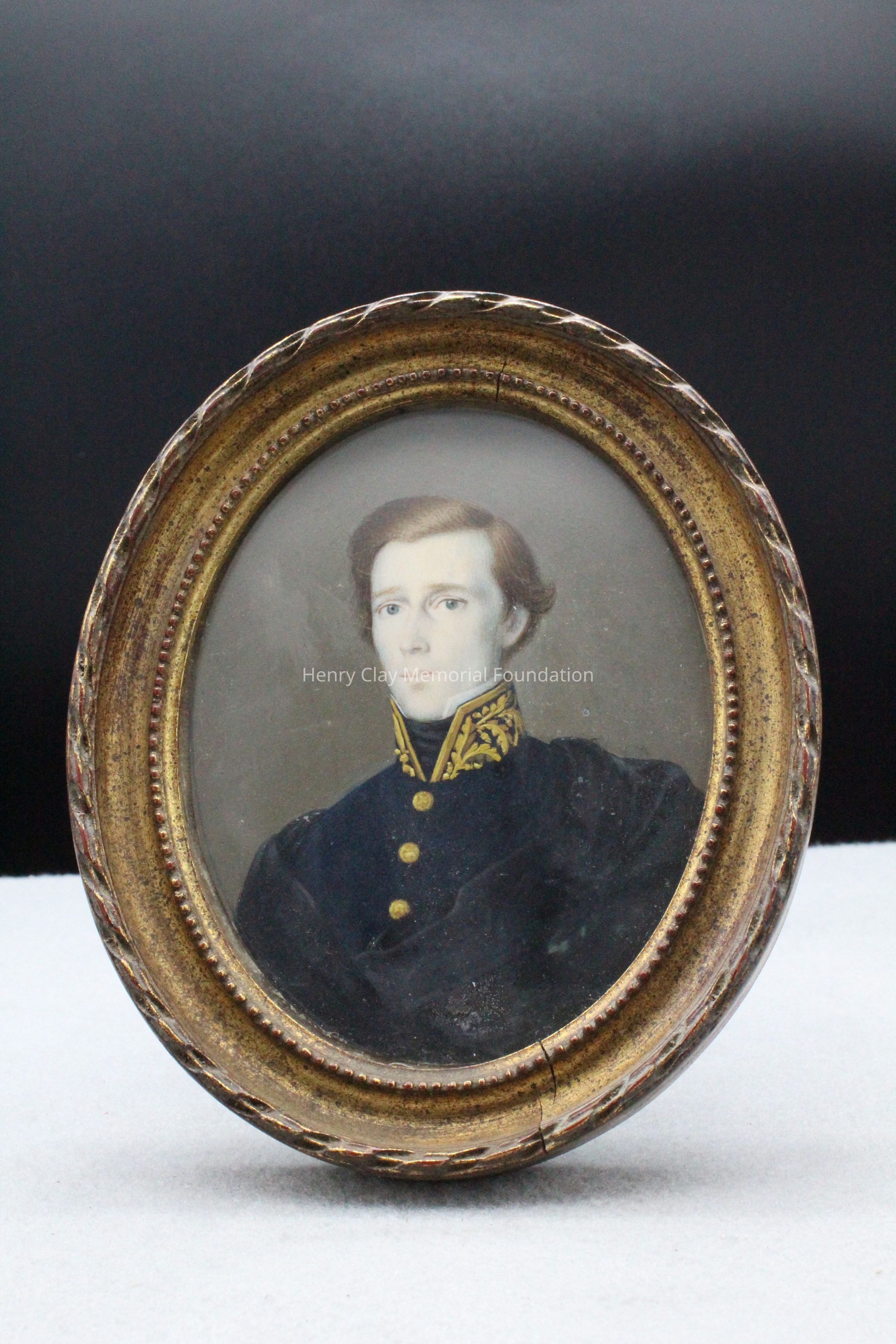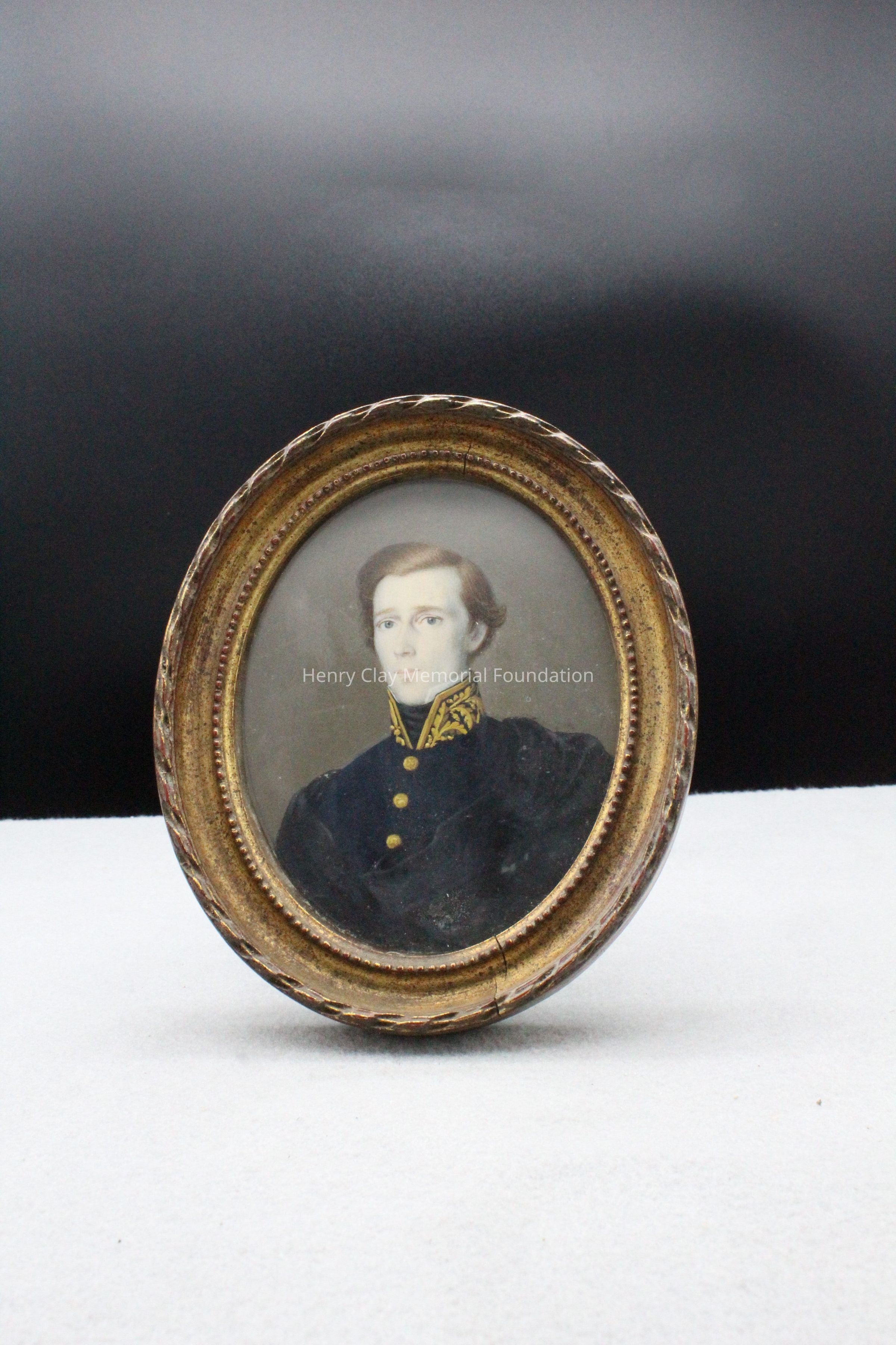 A pair of portrait miniatures. One is of a man in a black coat over a blue jacket with gold floral design on the standing collar and 3 gold or brass buttons down the front. The man is wearing a black cravat. He has blue eyes and reddish-brown hair parted to the right. The other is of a woman in a black dress that comes to a v over her bosom. The sleeves are short and end in lace. The woman's hair is dark brown, parted in the middle, and pulled up in the back where a lace veil is hung and drapes down around the woman's shoulders. The portraits are framed in gold frames with a beaded inner molding and a ribbon twisted outer molding. The backs of the frames have wire easels to stand them up.