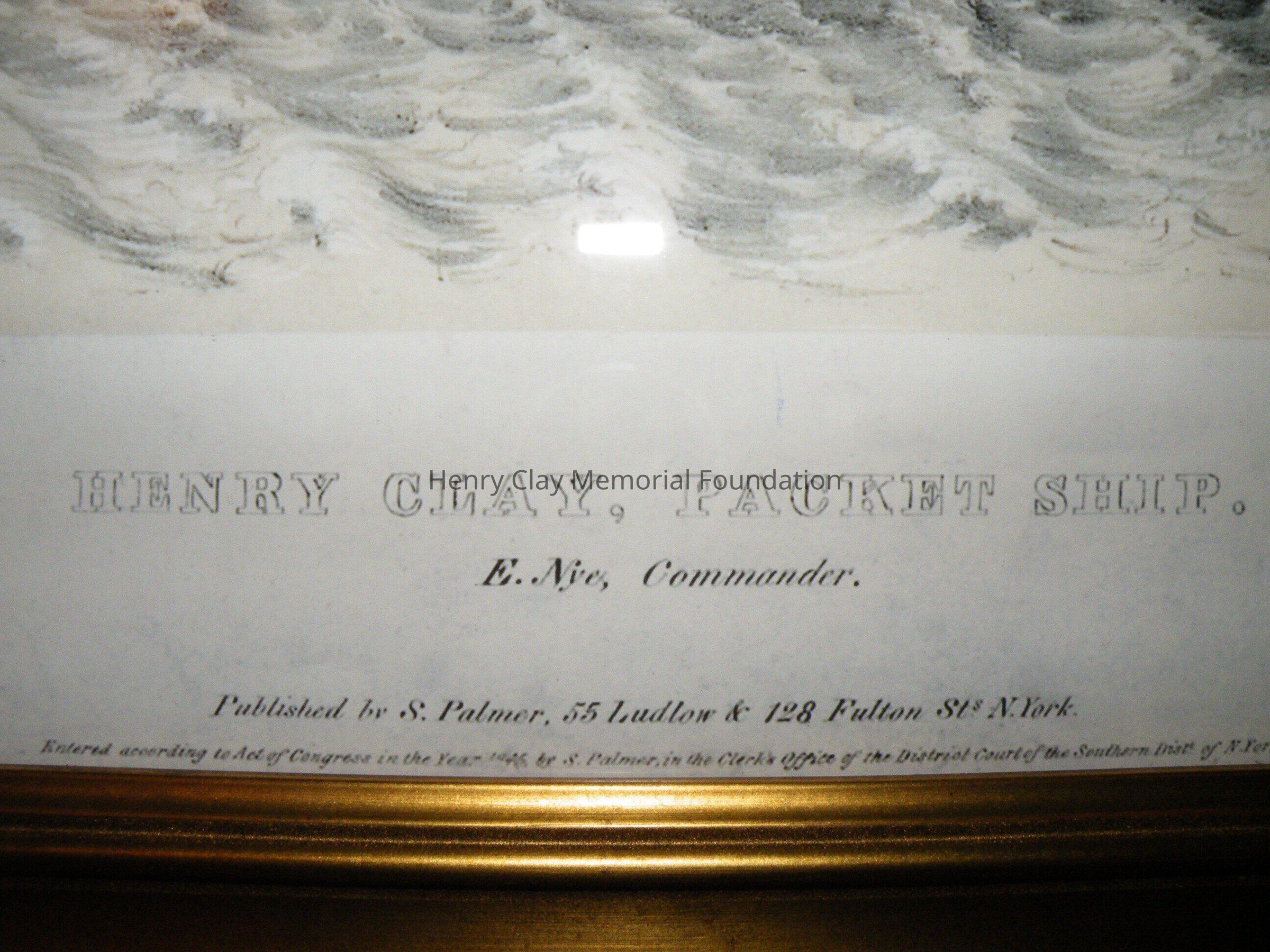 Reproduction of a lithograph of the packet ship Henry Clay. The ship is a three-masted vessel in full sail with other boats around it and a coastline in the background. The ship has people on deck. There is a pennant atop the amin mast and the American flag flies from the stern mast. The name Henry Clay appears on the fore hull of the ship. Beneath the image is the title: "Henry Clay Packet Ship E. Nye Commander." At the bottom center is the legend: "Published by S. Palmer, 55 Ludlow & 128 Fulton St. N. York." At the very bottom is the copyright: "Entered according to act of Congress in the year 1845 by S. Palmer in the clerk's office of the District Court of the Southern Dist. of N. York." In the lower left corner is the artist's name and in the lower right is the engraver.Dimensions