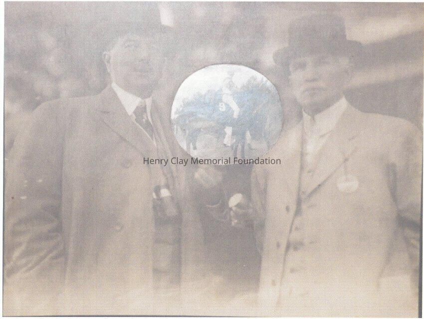 A black and white copy of a photograph depicting 2 men, and an insert of "Liberator" (Horse and Jockey).