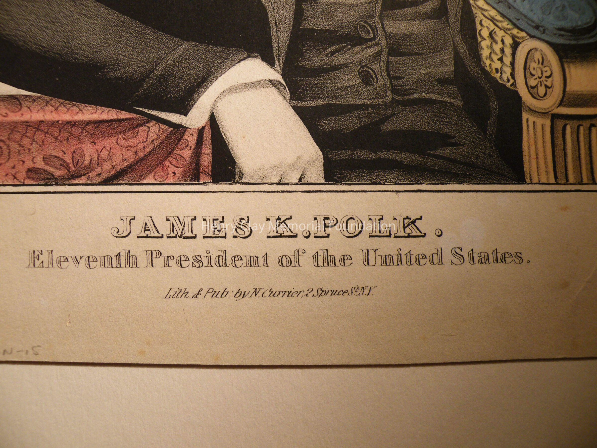 This engraving features a portrait of James K. Polk. Polk is pictured sitting in a chair, framed by drapery, and with the Capitol (pre-completion) in the background. Beneath the portrait is the title: "James K. Polk./ Eleventh President of the Unites States." Beneath the title is the credit: "Lith & Pub: by N. Currier, 2 Spruce St. N.Y." The engraving has been hand colored. The engraving is contained in an archival matboard portfolio.Dimensions