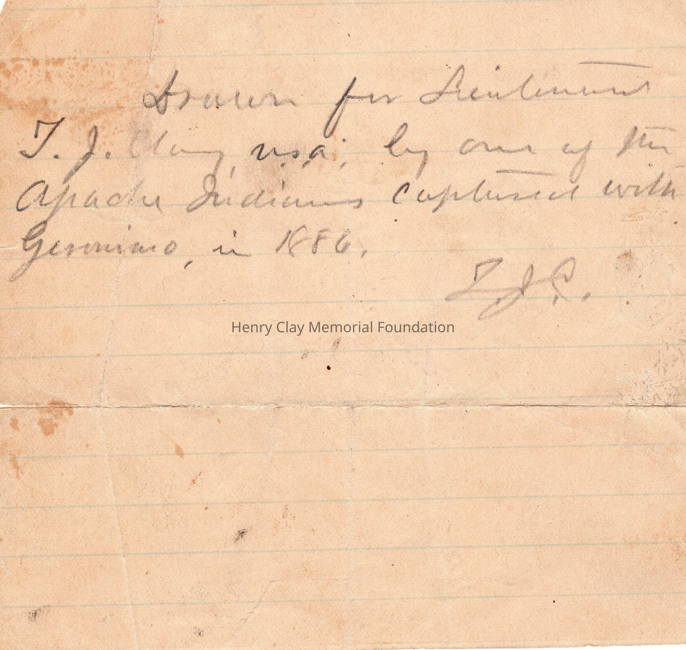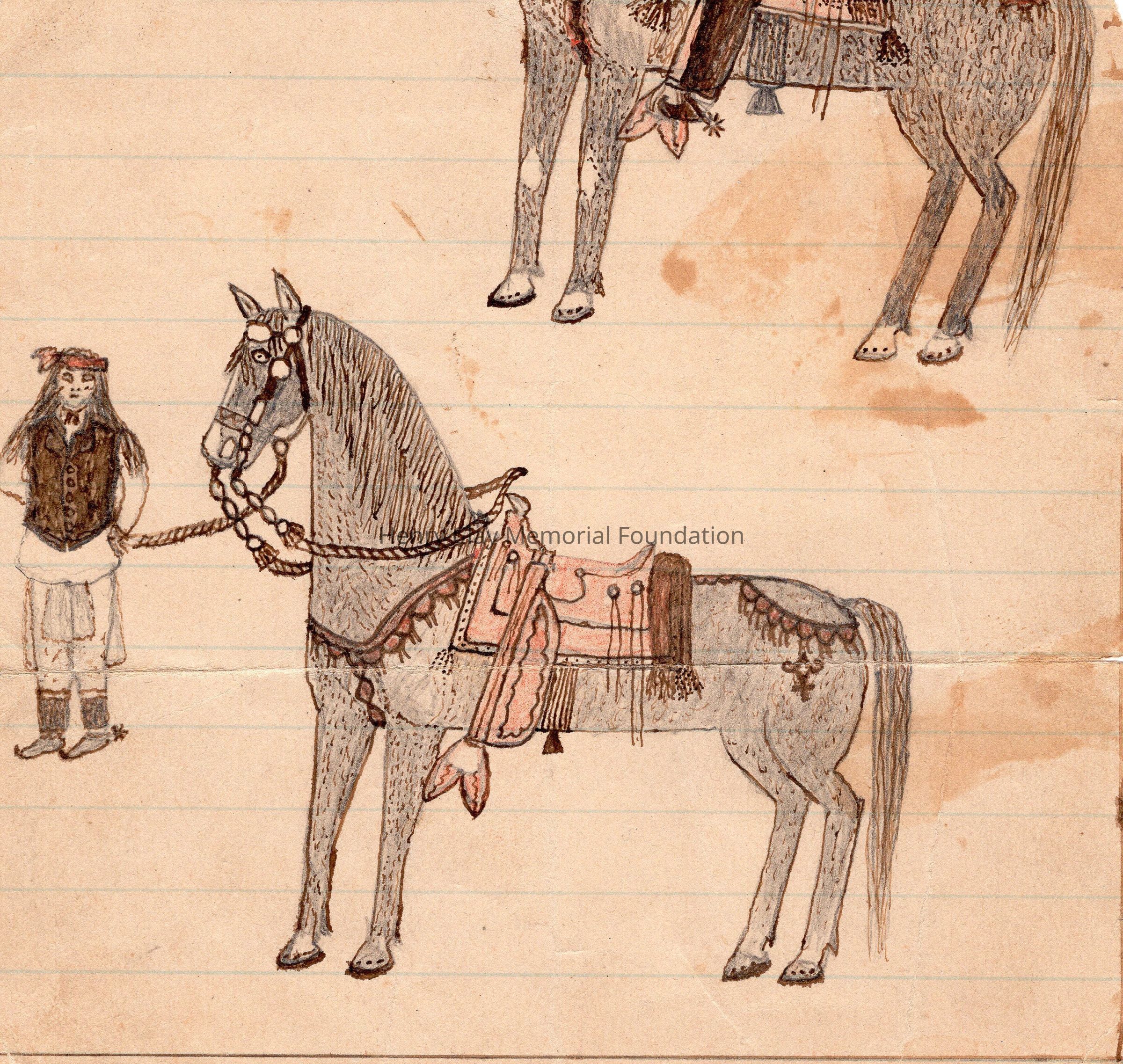 This drawing is of a man in a headband wearing a vest, shirt, loincloth, leggings and shoes. He has long hair. He is standing next to a horse. The horse is saddled and bridled and the man is holding a lead attached to the bridle. The feet of a man and legs of a horse are visible at the top of the paper. On the back of the drawing is a note that reads, "Drawn for Lieutenant T.J. Clay by an Apache Indian captured with Geronimo in 1886. T.J.C."Dimensions