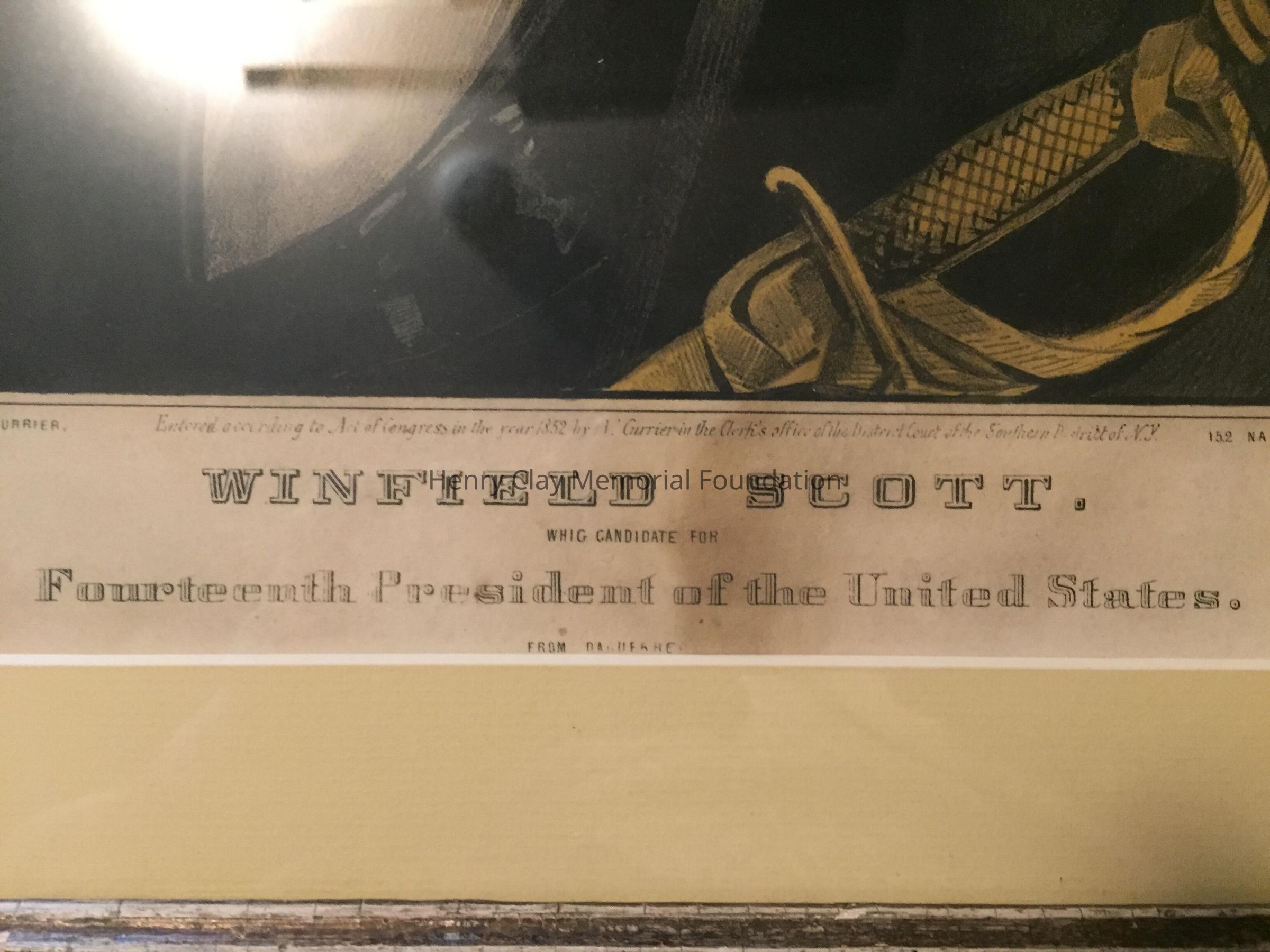 Engraving features a portrait of Winfield Scott. Beneath the portrait is the credit: "Lith & Pub. by N. Currier" and the notes: "Entered according to Act of Congress in the year 1852 by N. Currier in the Clerk's office of the District Court of the Souithern District of N.Y." and the address: "152 Nassau St. N.Y." Beneath that is the title: "Winfield Scott./ Whig Candidate for/ Fourteenth President of the United States./ from daguerrotype." Engraving is hand colored and framed.Dimensions