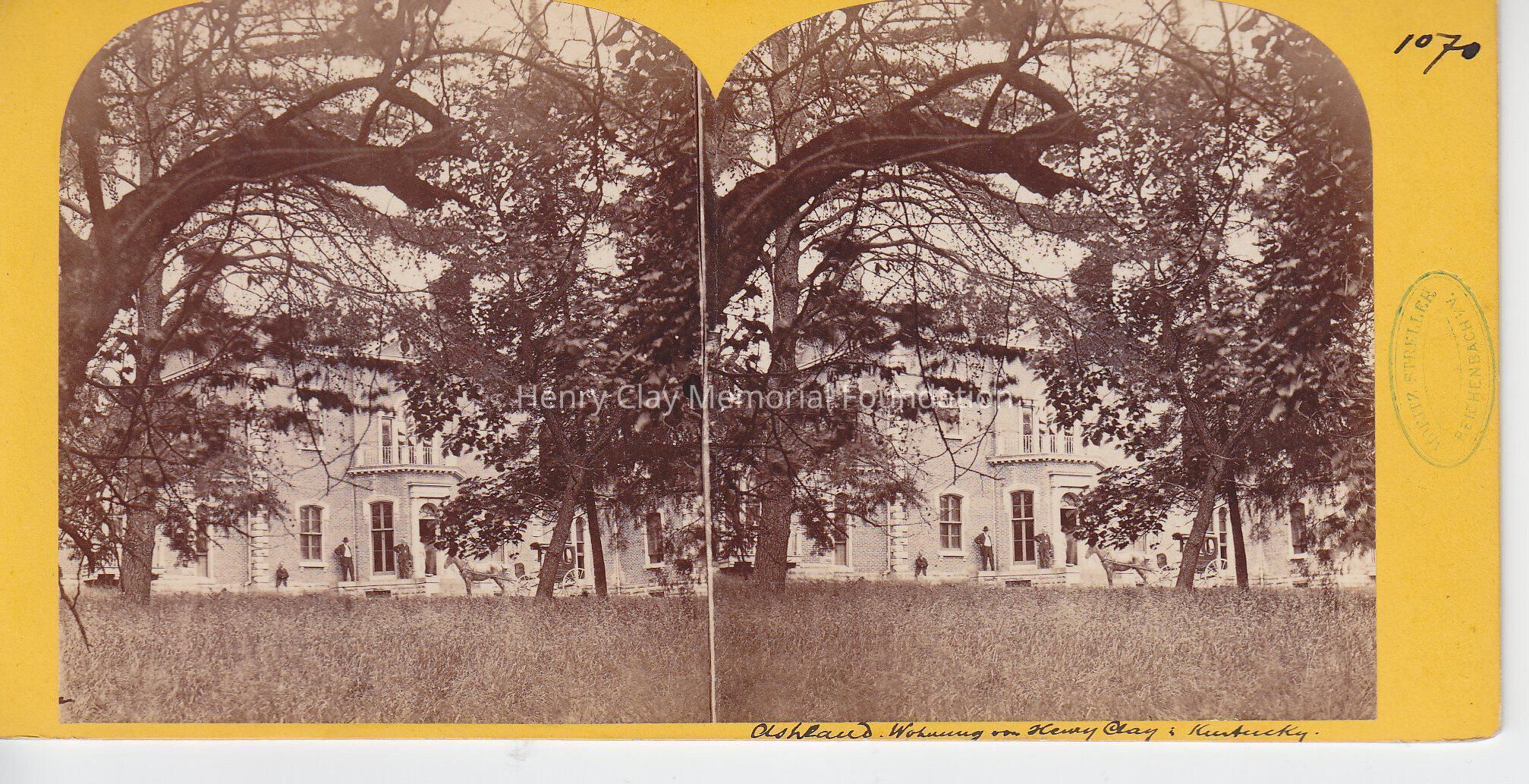 This is a photograph of the front of the Ashland Estate. There is a horse and carriage in front of the house. There is a person leaning against the house near the door. There is man in a dark jacket, pants and hat leaning against the house behind the first person and there is a man leaning against the house in a dark jacket and white pants. The men featured in the photo are unknown.